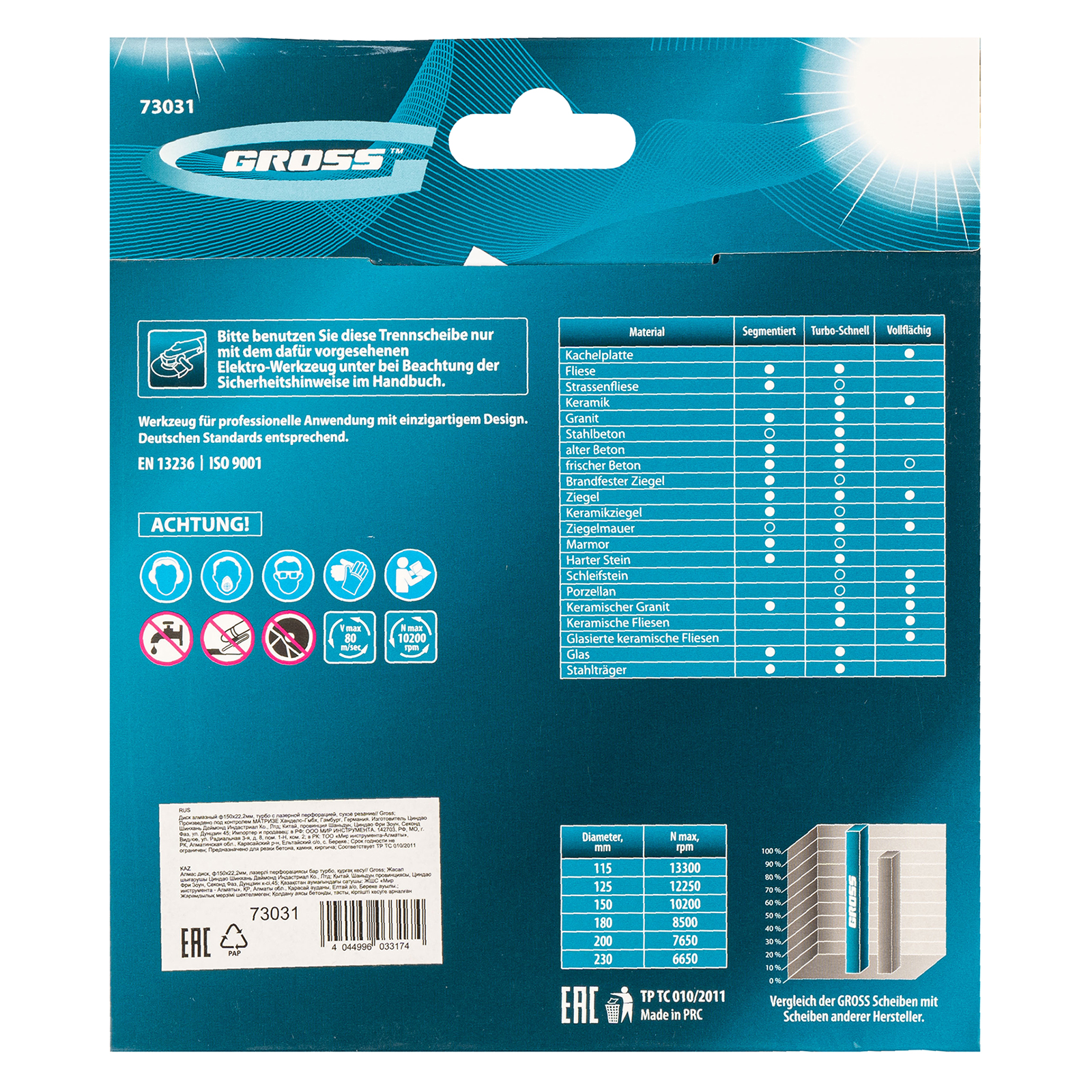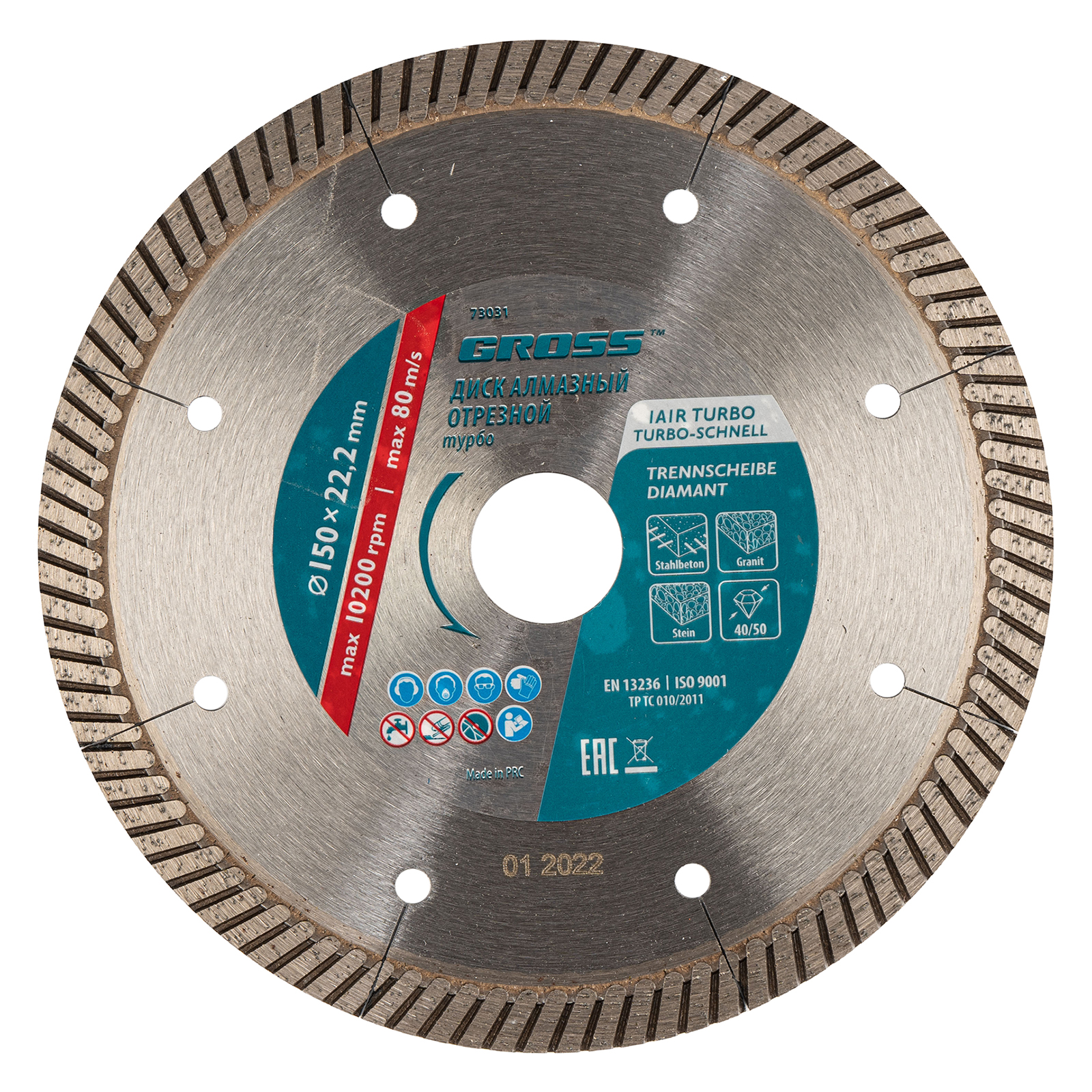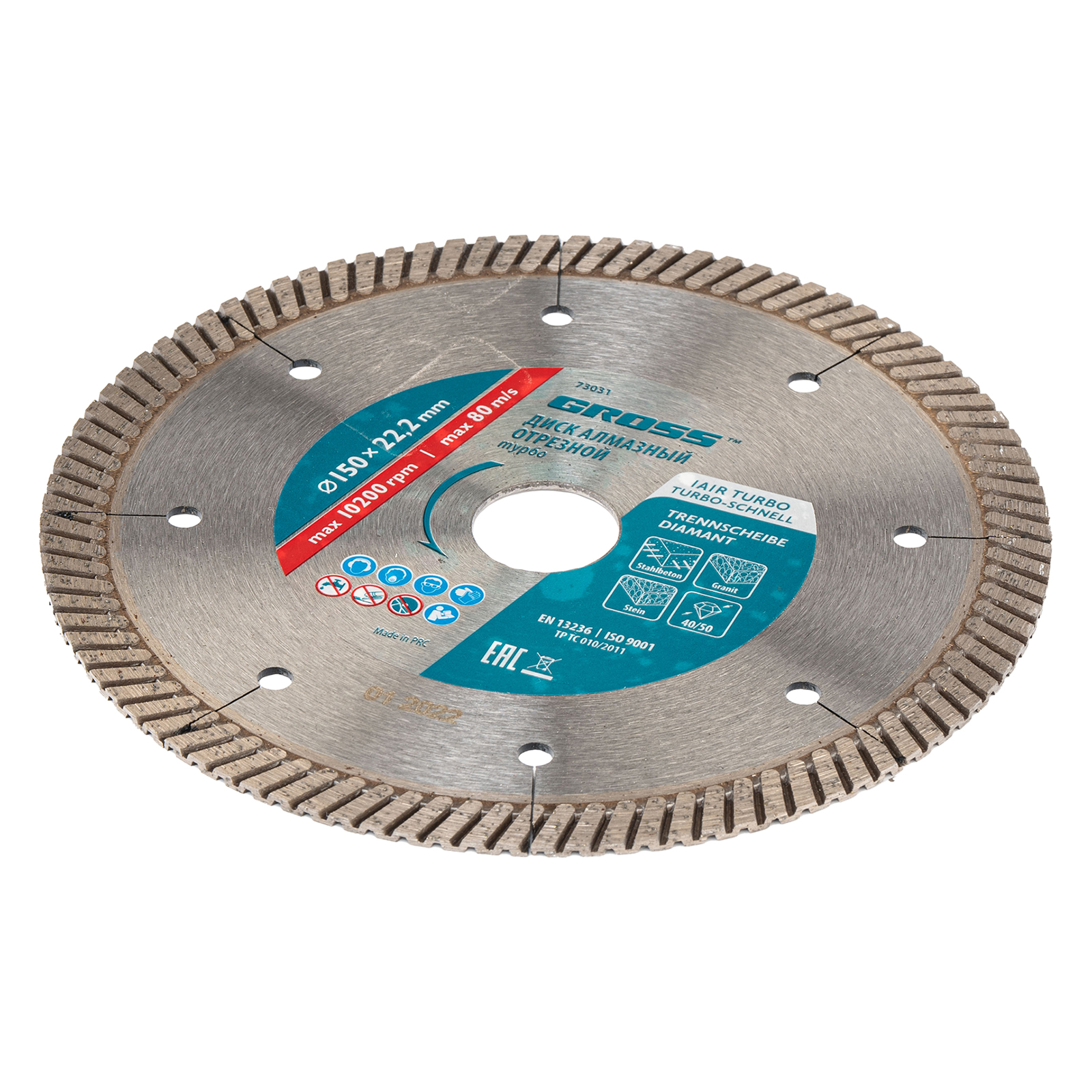 Алмазный диск Gross 73031 диаметром 150 х 22,2 мм, турбо с лазерной перфорацией, применяется для сухой резки твердых материалов: бетона, в том числе свежего, железобетона, кирпича, гранита, камня и песчаника. Работа с разными типами материалов возможна благодаря оптимально подобранной металлической связке. Инструмент используется в качестве расходника на профессиональных УШМ.