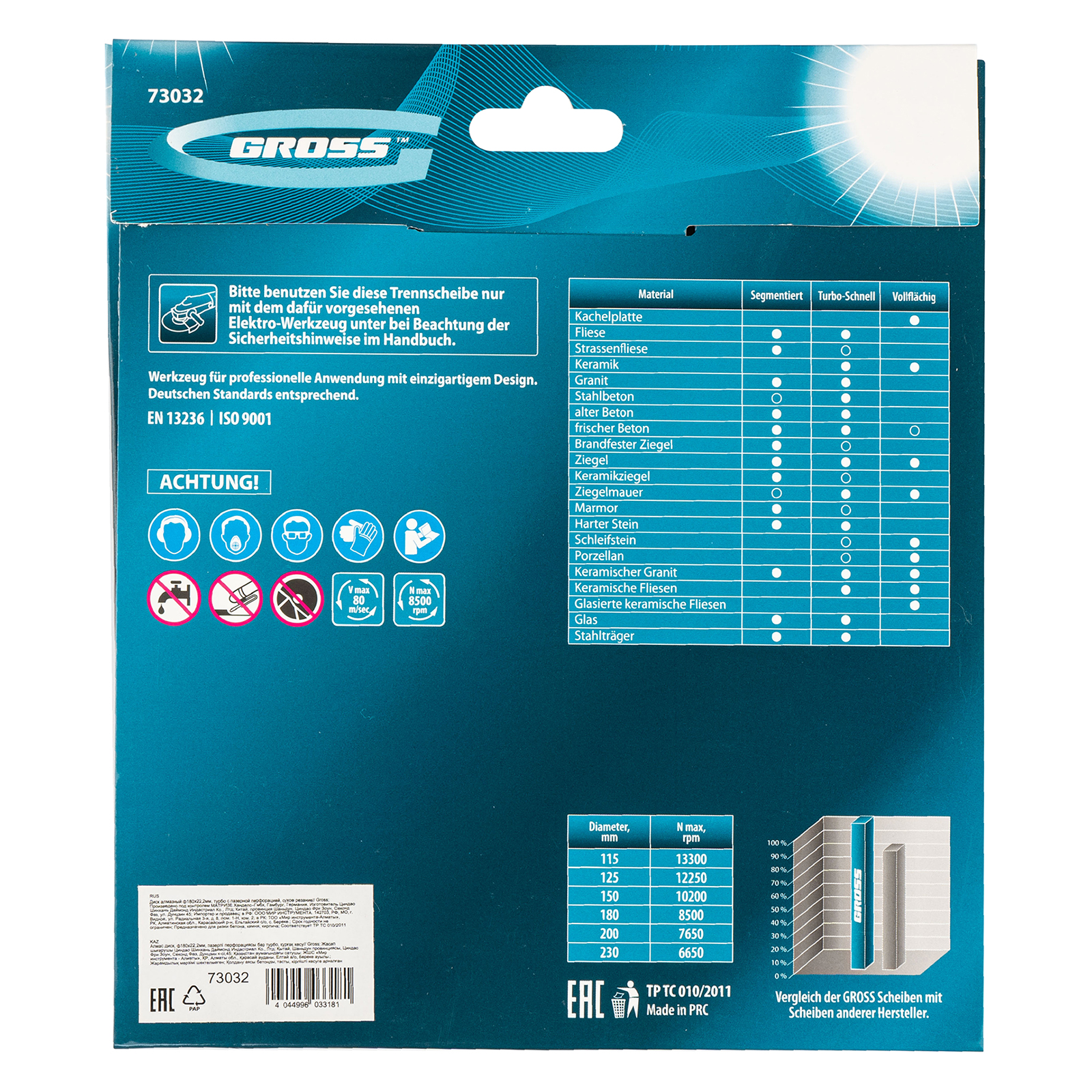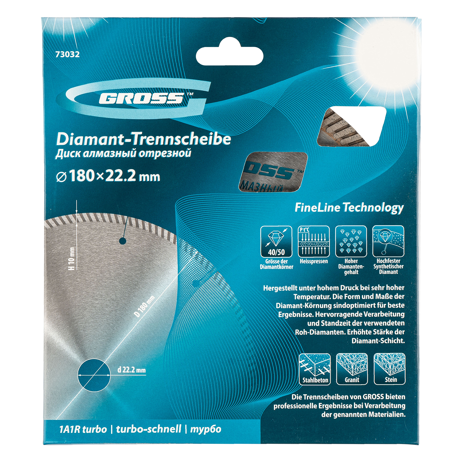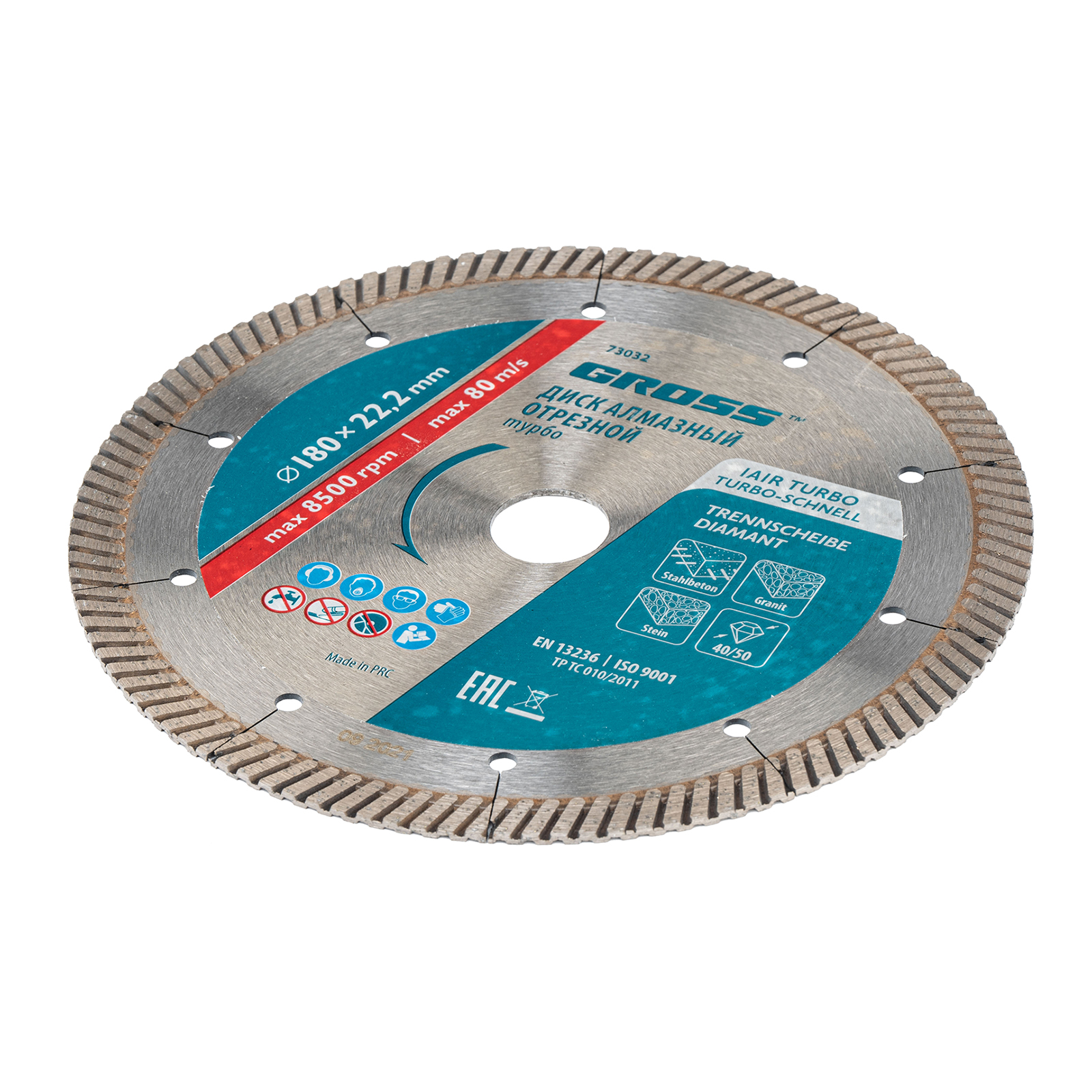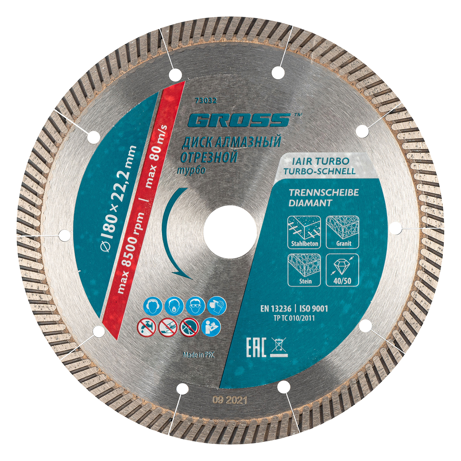 Алмазный диск Gross 73032 диаметром 180 х 22,2 мм, турбо с лазерной перфорацией, применяется для сухой резки твердых материалов: бетона, в том числе свежего, железобетона, кирпича, гранита, камня и песчаника. Работа с разными типами материалов возможна благодаря оптимально подобранной металлической связке. Инструмент используется в качестве расходника на профессиональных УШМ.
