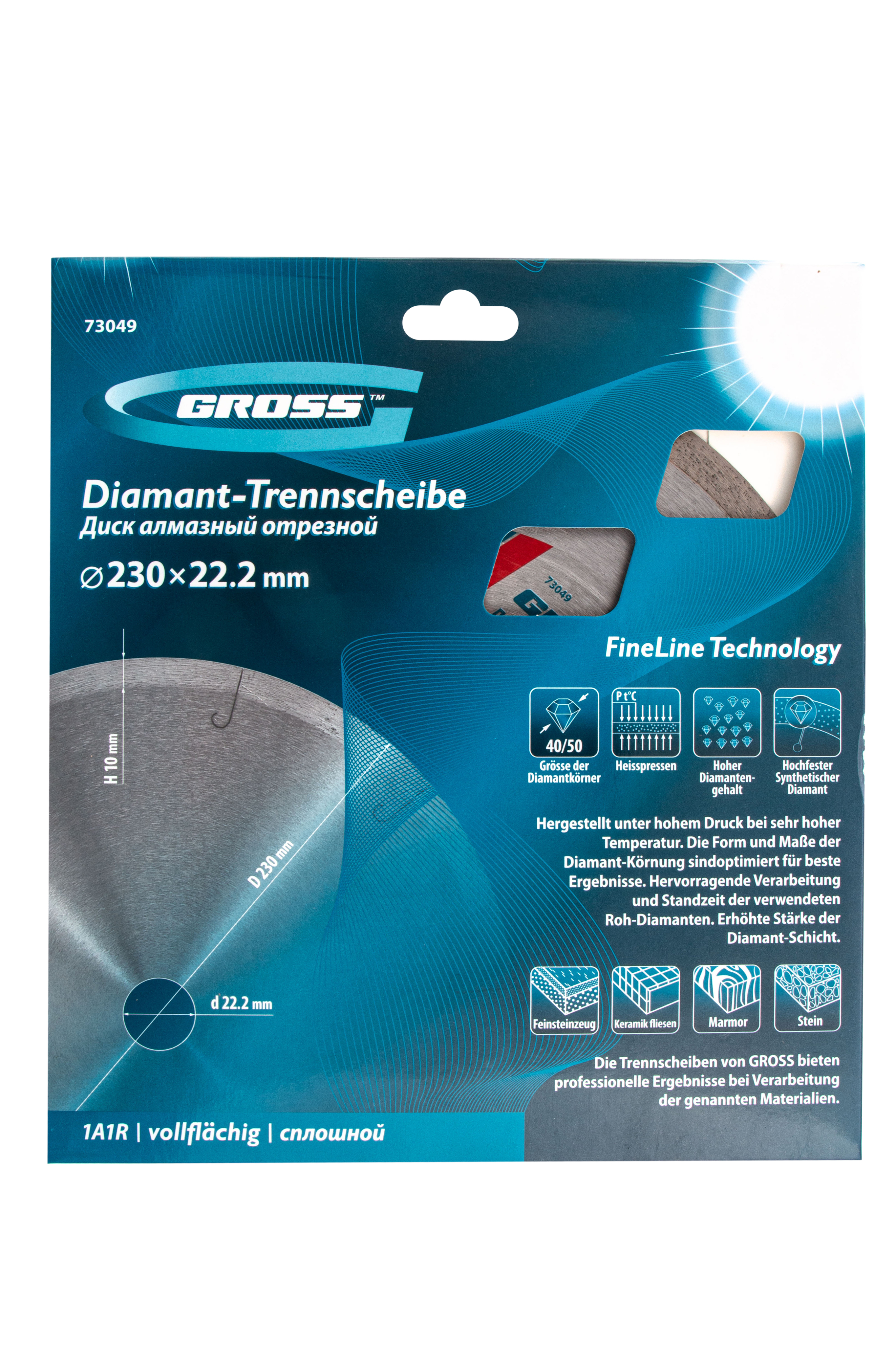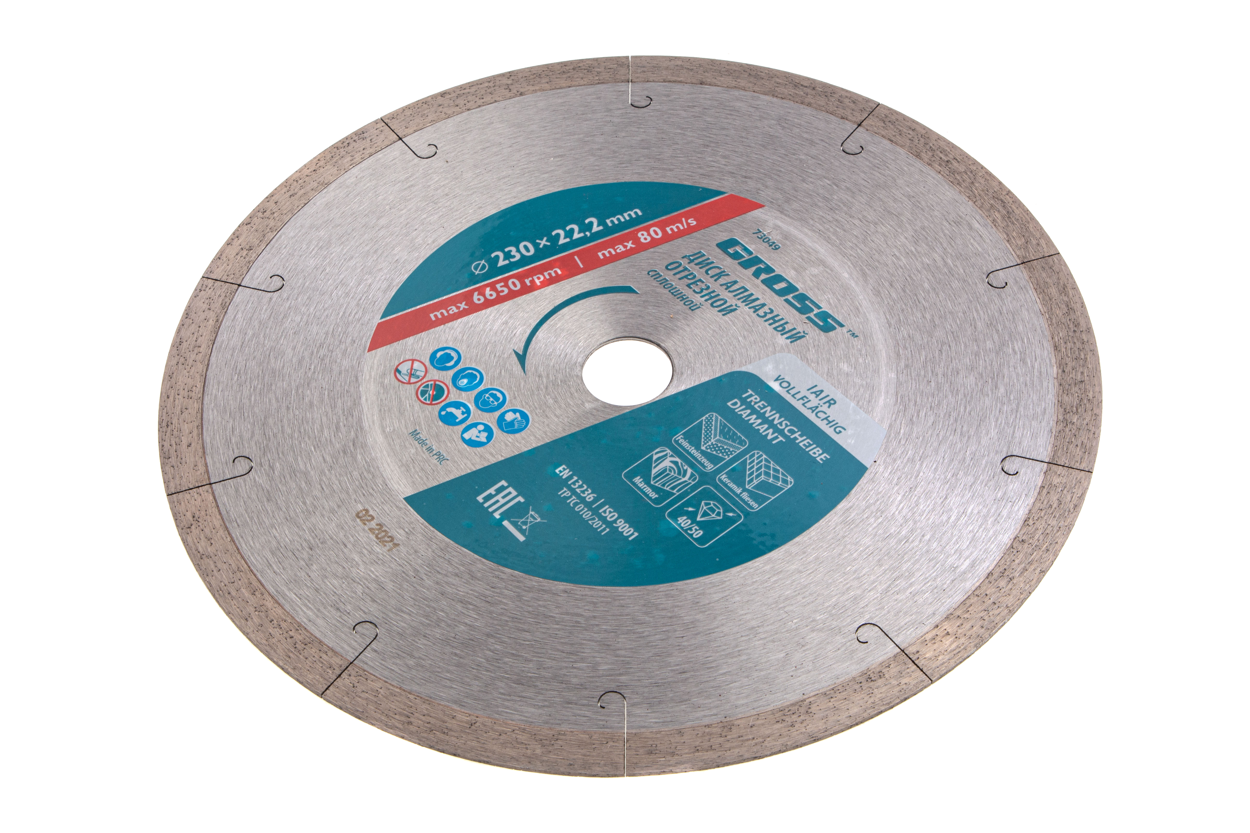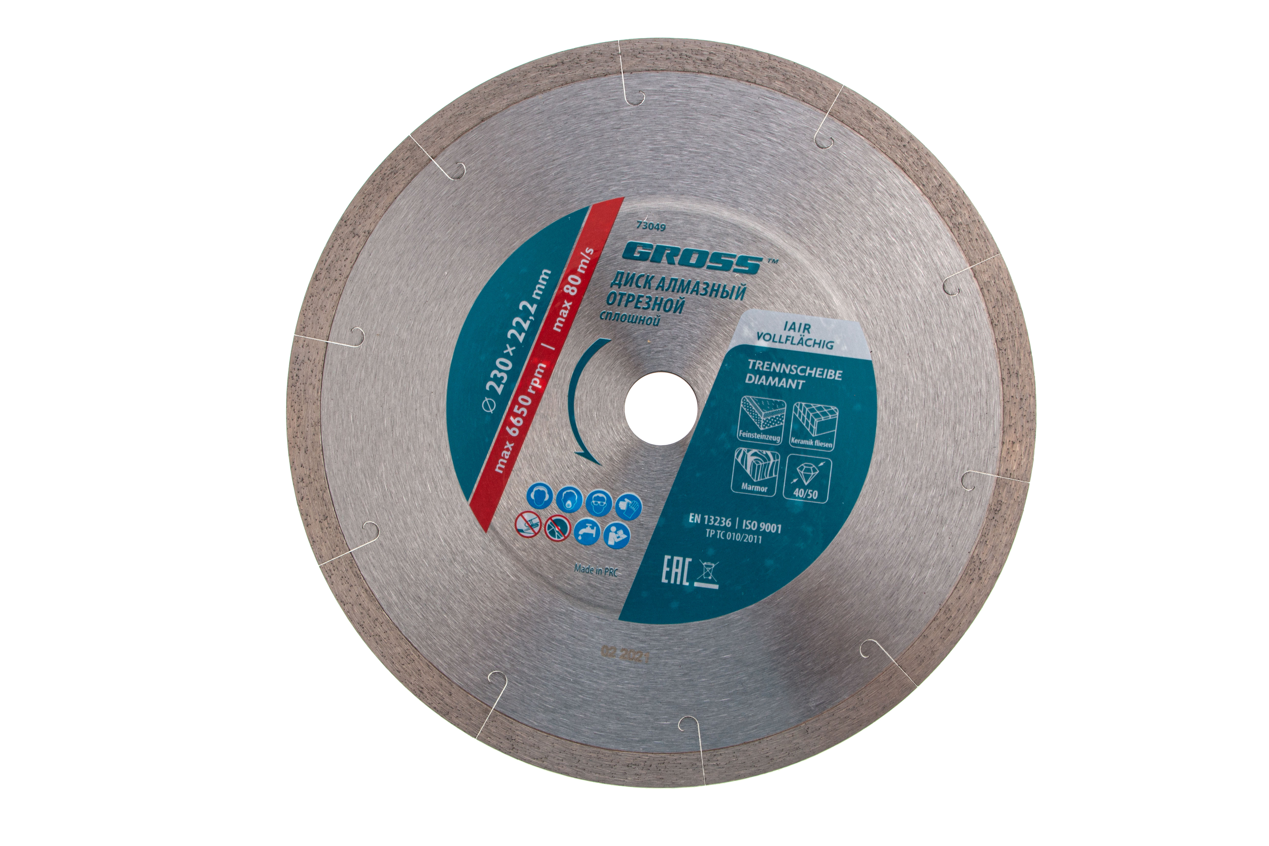 Сплошной алмазный диск Gross 73049 диаметром 230 х 22,2 мм, с лазерной перфорацией, предназначен для мокрой резки и используется в качестве расходника на УШМ или плиткорезах с посадочным размером 22,2 мм. Металлическая связка с оптимальным соотношением серебра, кобальта и других качественных компонентов позволяет работать с гранитом, керамикой, керамогранитом, мрамором, натуральным и искусственным камнем. Метод мокрой резки подразумевает использование водяного охлаждения, что способствует снижению перегрева и эффективному отводу пыли.