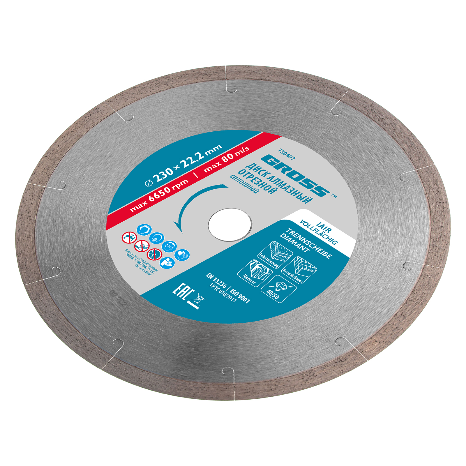 Сплошной алмазный диск Gross 730497 диаметром 230 х 22,2 мм предназначен для мокрой резки бетона, кирпича, гранита и керамогранита, мрамора и камня. Устанавливается на профессиональную углошлифовальную машину или плиткорез с посадочным диаметром 22,2 мм, рассчитан на большой объем работ. Благодаря сплошной конструкции диска срез получается аккуратным и ровным, без сколов. Во время работы рекомендуется использовать водяное охлаждение для качественного отвода пыли и защиты диска от перегрева.