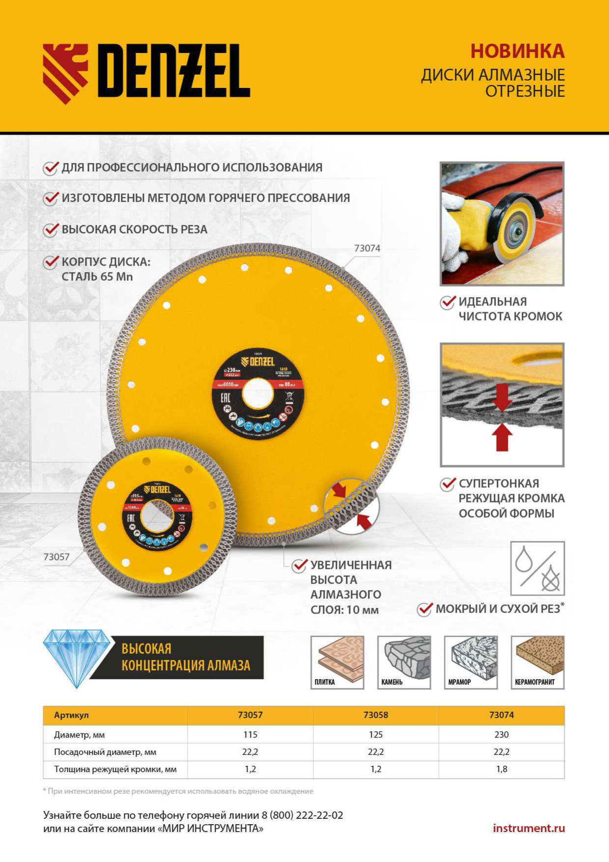 Долговечность — ширина алмазного слоя увеличена до 10 мм, поэтому диск изнашивается медленно и выдерживает профессиональное использование.