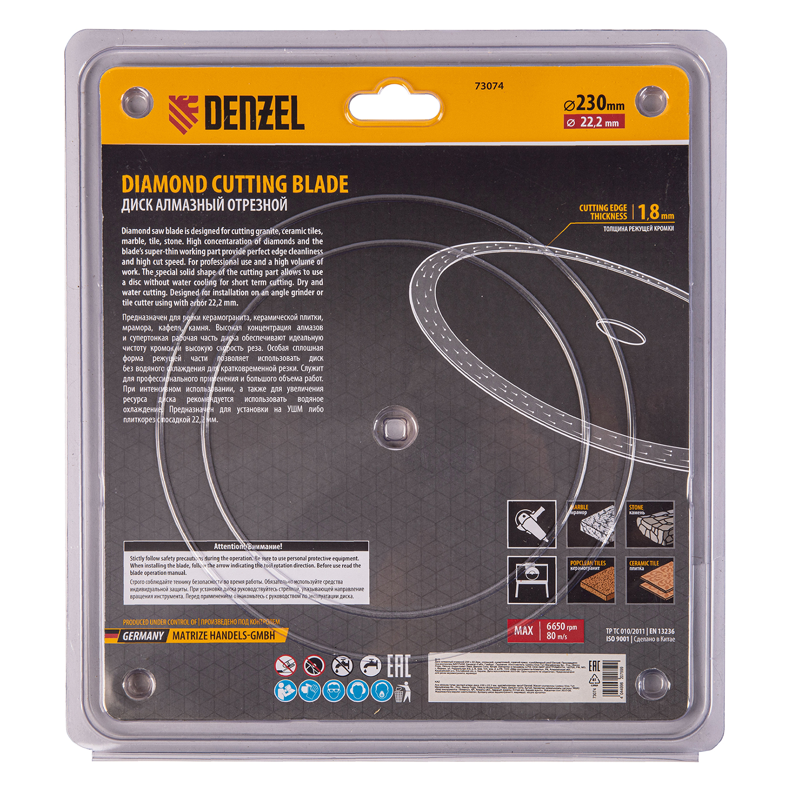 Алмазный диск ТМ Denzel "Сплошной" арт 73074, ф230 х 22,2 мм, предназначен для резания мрамора, керамогранита и керамическую плитки, камня. Устанавливается на УШМ (болгарку) или плиткорез с посадочным диаметром 22,2 мм. Высокая концентрация алмазов и супертонкая рабочая часть диска обеспечивает идеальную частоту кромок и высокую скорость реза.Особая сплошная форма режущей части позволяет использовать диск без водяного охлаждения для кратковременного реза.Диск произведен по технологии горячего прессования с увеличенной шириной режущей кромки (10мм) подходит для профессионального использования и больших объемов работ. При интенсивной резке необходимо использовать водяное охлаждение.