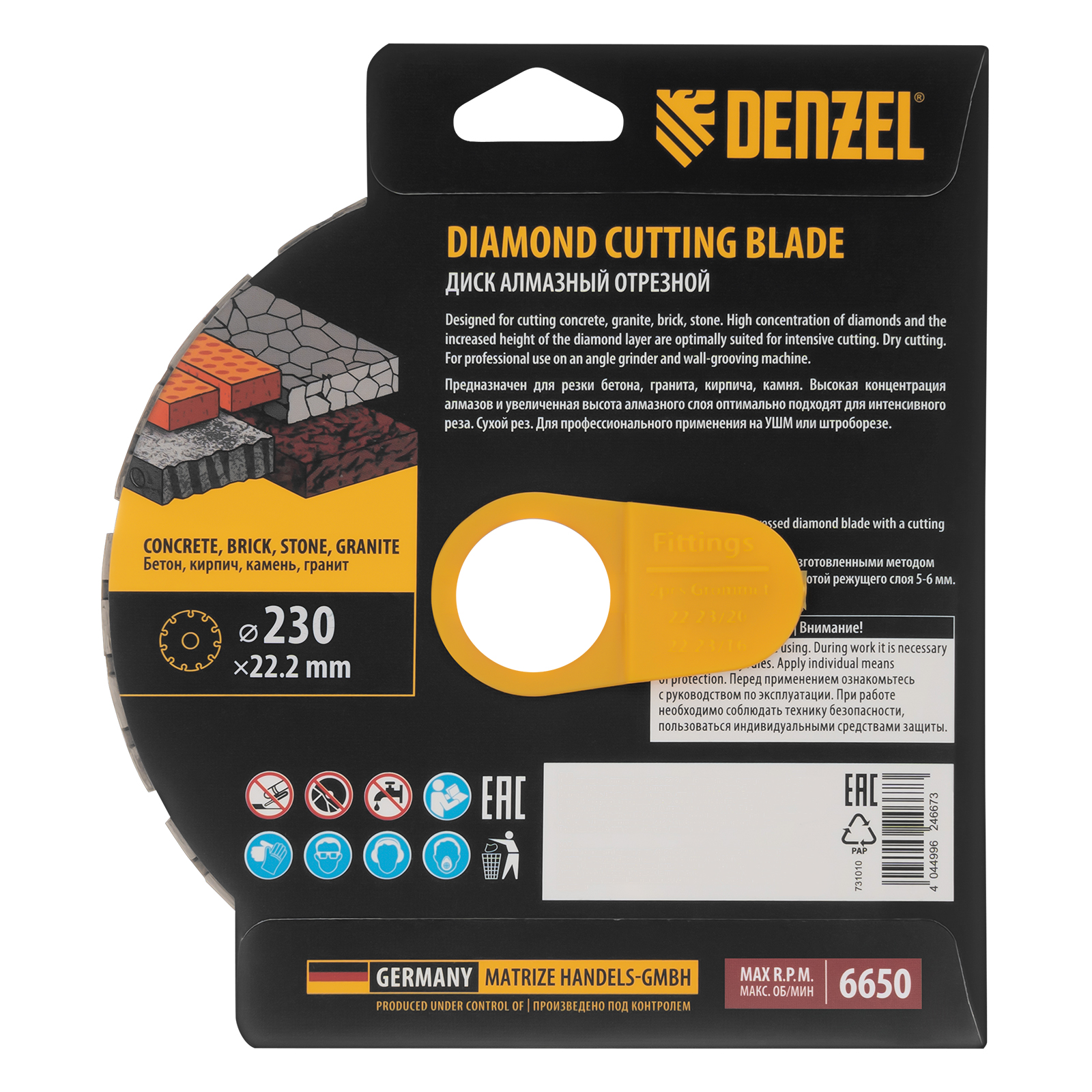 <p>Алмазный отрезной диск Denzel 731040 диаметром 230 x 22,2 мм, с сегментной рабочей частью и слоем сверхтвердых алмазов HWD92, предназначен для сухого резания бетона, камня, кирпича, гранита. Используется с углошлифовальной машиной (УШМ) или штроборезом, поддерживающими частоту вращения 6650 об/мин.</p><h2>Преимущества</h2><ul><li>Надежность — диск изготовлен методом холодного прессования и выдерживает значительные нагрузки.</li><li>Повышенный ресурс — высота алмазного слоя увеличена до 12 мм, что обеспечивает эффективную работу в течение длительного времени.</li><li>Высокая скорость работы — сегментное строение рабочей части обеспечивает охлаждение и отвод шлама.</li></ul>