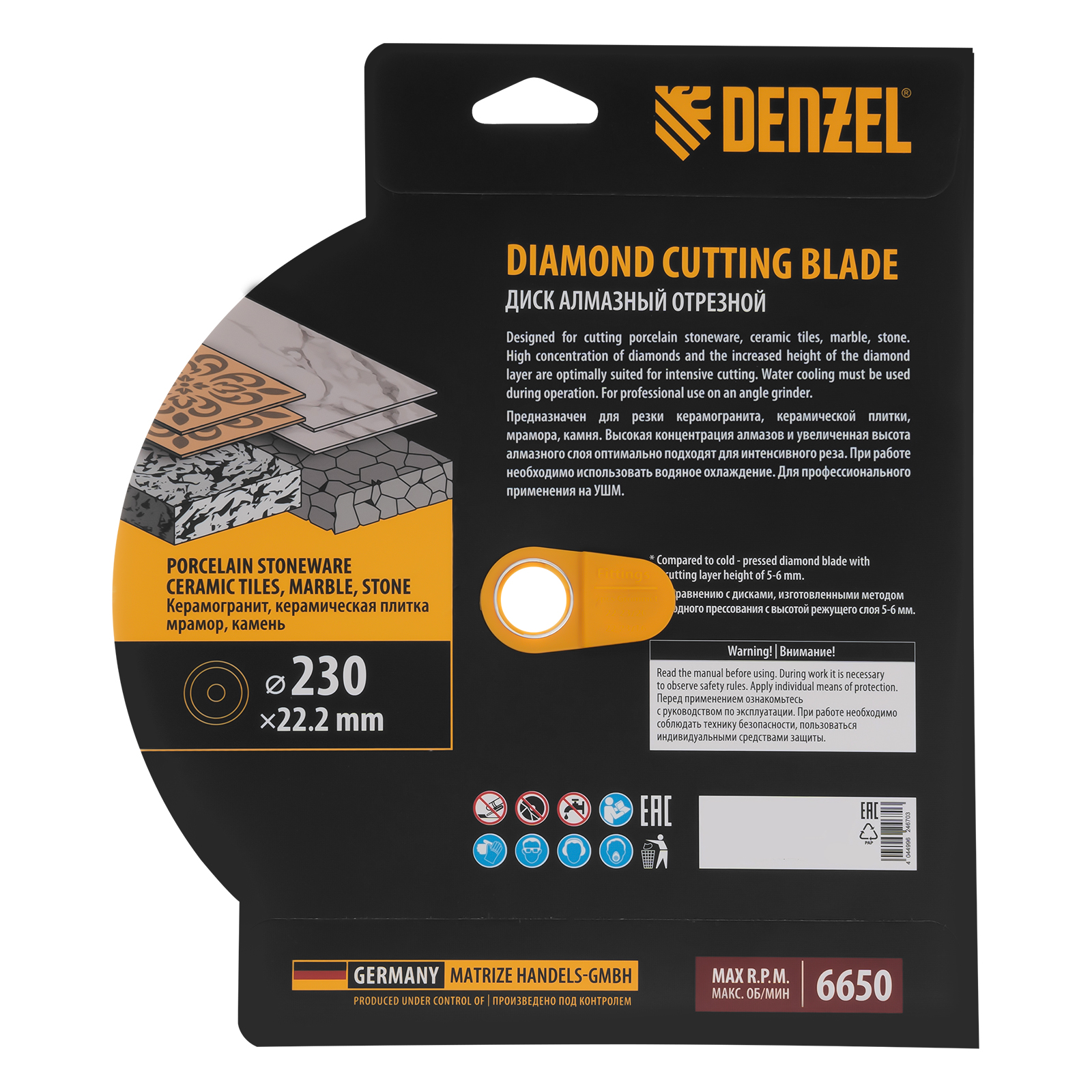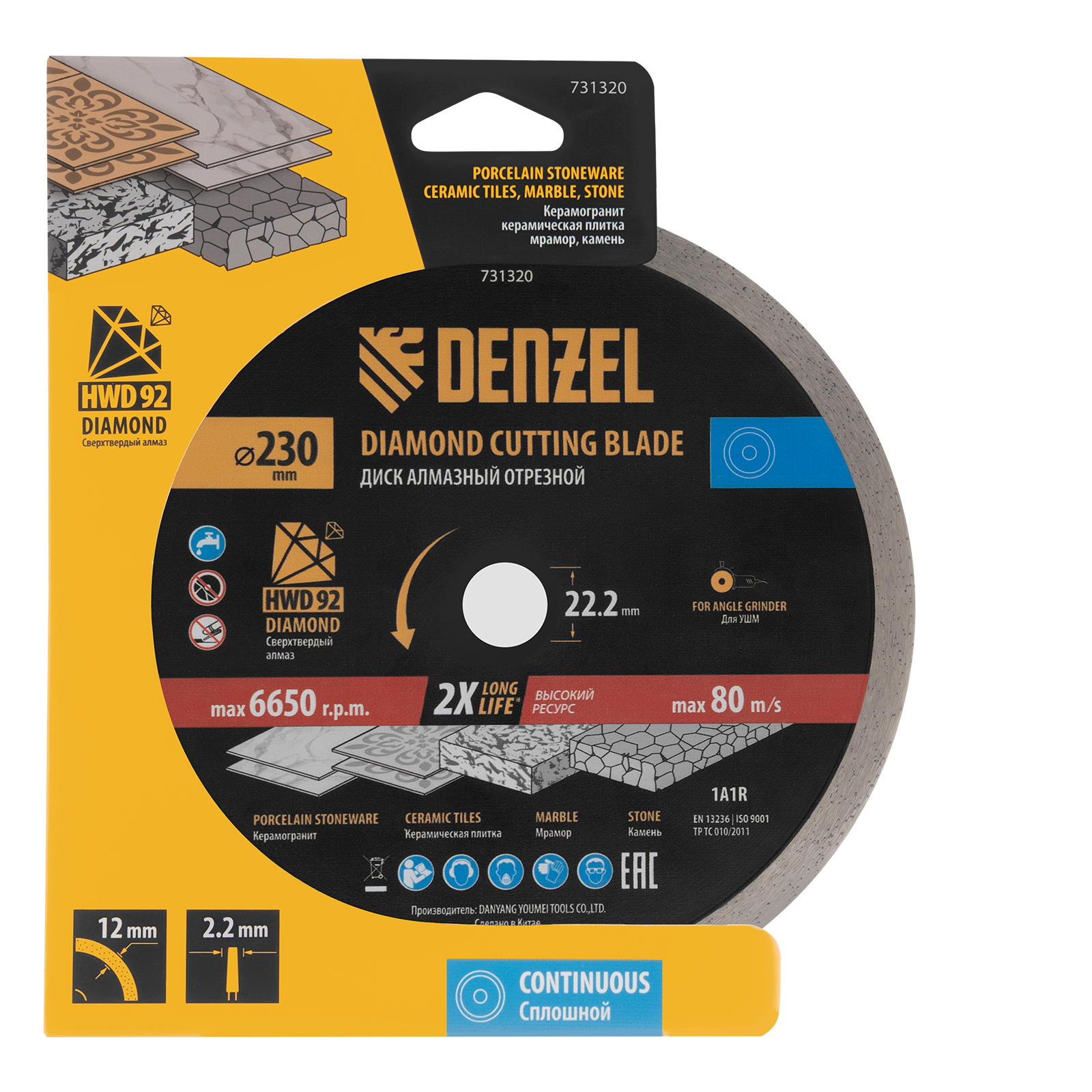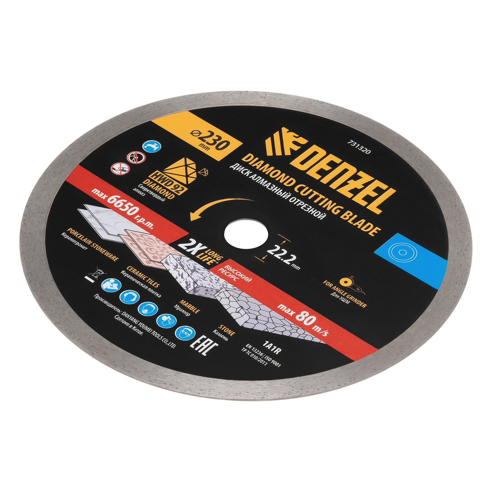 <p>Алмазный отрезной диск Denzel 731320 диаметром 230 x 22,2 мм, со сплошной рабочей частью и слоем сверхтвердых алмазов HWD92, предназначен для мокрого резания твердых материалов. Оптимален для работы с с керамогранитом, керамической плиткой, мрамором, камнем. Устанавливается на УШМ, поддерживающую частоту вращения 6650 об/мин. Необходимо использование водяного охлаждения для наиболее эффективной работы и увеличения ресурса оснастки.</p><h2>Преимущества</h2><ul><li>Устойчивость к нагрузкам — диск изготовлен методом холодного прессования и характеризуется высокой прочностью.</li><li>Высокое качество выполняемых работ — сплошная рабочая часть в сочетании с использованием подачи воды позволяет получить ровный срез без сколов.</li><li>Увеличенный ресурс — высота алмазного слоя составляет 12 мм, что обеспечивает длительную эффективную работу.</li></ul>