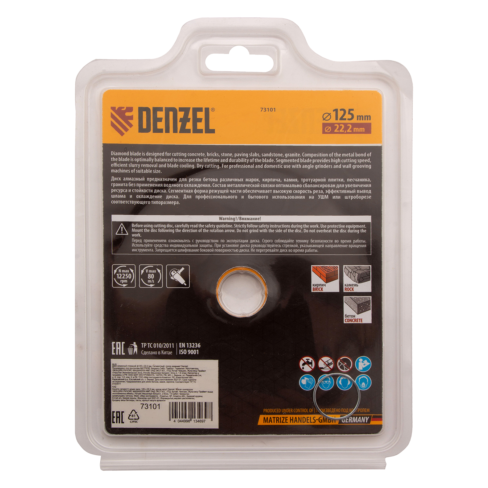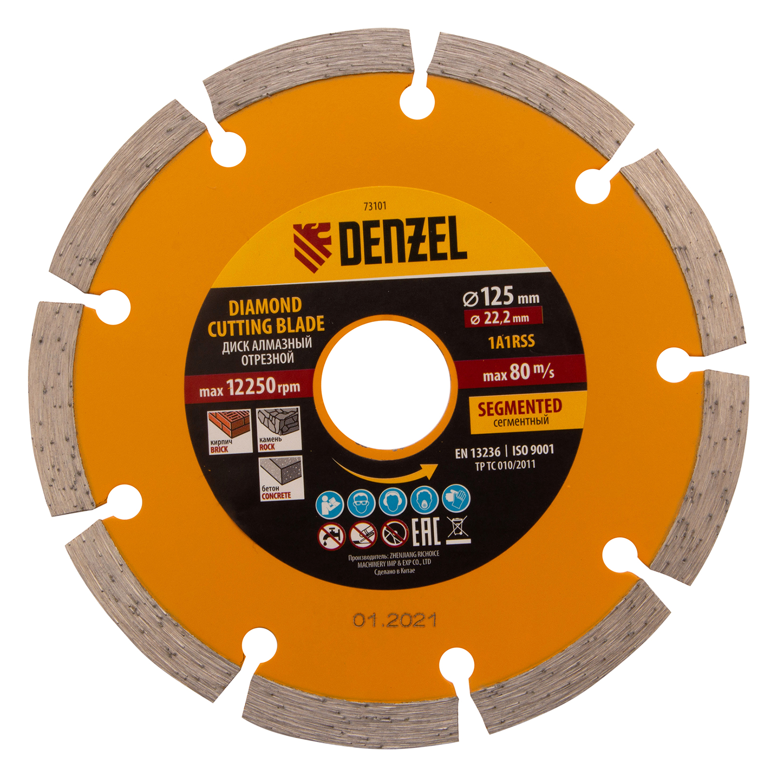 <p>Отрезной сегментный алмазный диск Denzel 73101 диаметром 125 х 22,2 мм — оснастка для УШМ, использующаяся для сухой резки свежего и старого бетона, камня, кирпича, шлакоблока, мрамора, тротуарной плитки, гранита. Диск сегментного типа отличается высокой производительностью даже при интенсивных нагрузках. Подходит для бытового и профессионального использования.</p><h2>Преимущества</h2><ul><li>Высокая скорость реза — рабочая часть шириной 7 мм отличается плотной концентрацией алмазов.</li><li>Удобное применение — диск разделен на сегменты для эффективного отвода шлама, водяное охлаждение не требуется.</li><li>Надежность — рабочая часть, изготовленная по технологии холодного прессования, выдерживает высокие нагрузки.</li><li>Эффективная резка плотных материалов — сбалансированная металлическая связка устойчива к перегреву и перегрузкам.</li></ul>