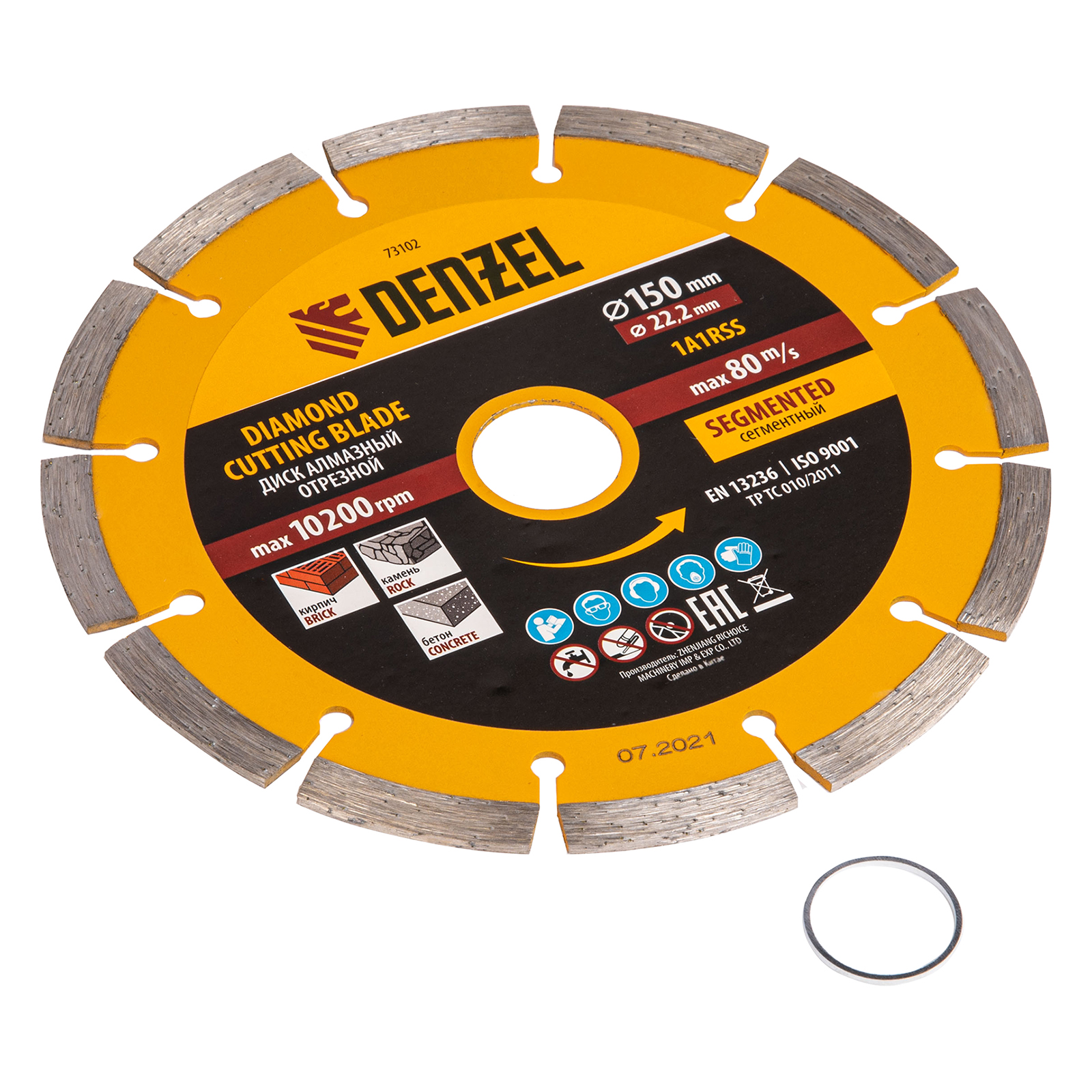 <p>Отрезной сегментный алмазный диск Denzel 73102 диаметром 150 х 22,2 мм — оснастка для УШМ, использующаяся для сухой резки свежего и старого бетона, камня, кирпича, шлакоблока, мрамора, тротуарной плитки, гранита. Диск сегментного типа отличается высокой производительностью даже при интенсивных нагрузках. Подходит для бытового и профессионального использования.</p><h2>Преимущества</h2><ul><li>Высокая скорость реза — рабочая часть шириной 7 мм отличается плотной концентрацией алмазов.</li><li>Удобное применение — диск разделен на сегменты для эффективного отвода шлама, водяное охлаждение не требуется.</li><li>Надежность — рабочая часть, изготовленная по технологии холодного прессования, выдерживает высокие нагрузки.</li><li>Эффективная резка плотных материалов — сбалансированная металлическая связка устойчива к перегреву и перегрузкам.</li></ul>