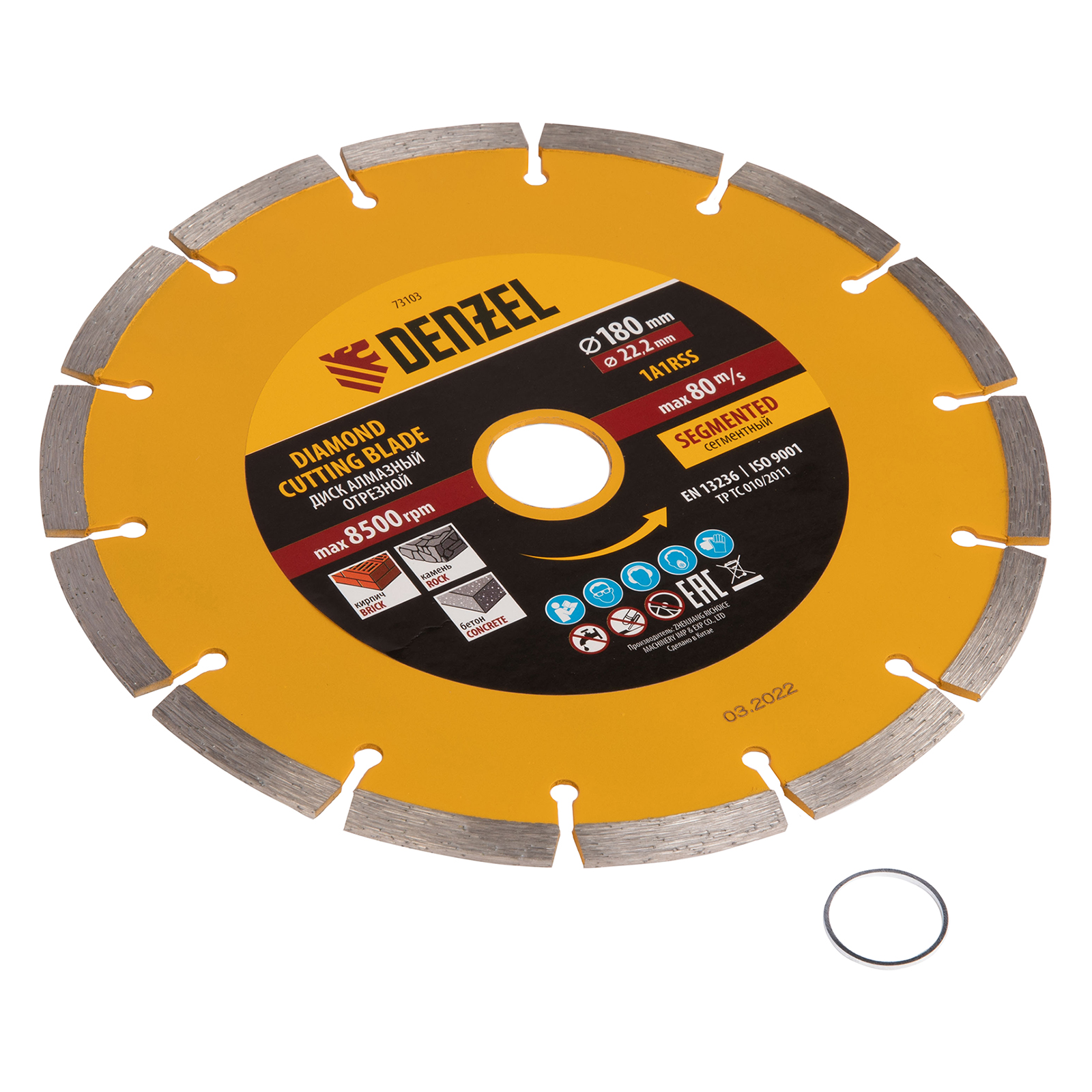 Отрезной сегментный алмазный диск Denzel 73103 диаметром 180 х 22,2 мм — оснастка для УШМ, использующаяся для сухой резки свежего и старого бетона, камня, кирпича, шлакоблока, мрамора, тротуарной плитки, гранита. Диск сегментного типа отличается высокой производительностью даже при интенсивных нагрузках. Подходит для бытового и профессионального использования.