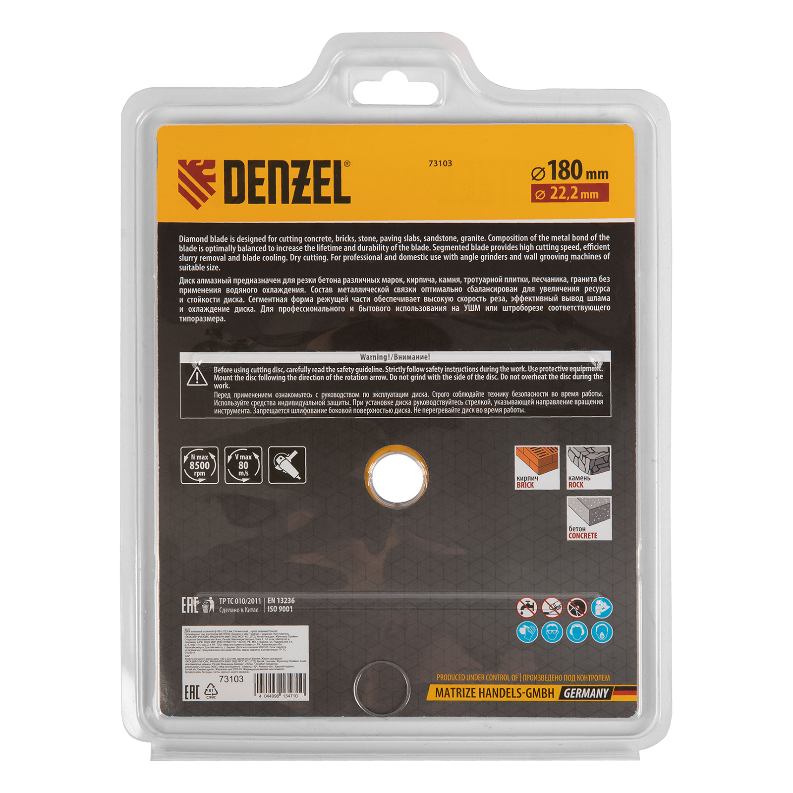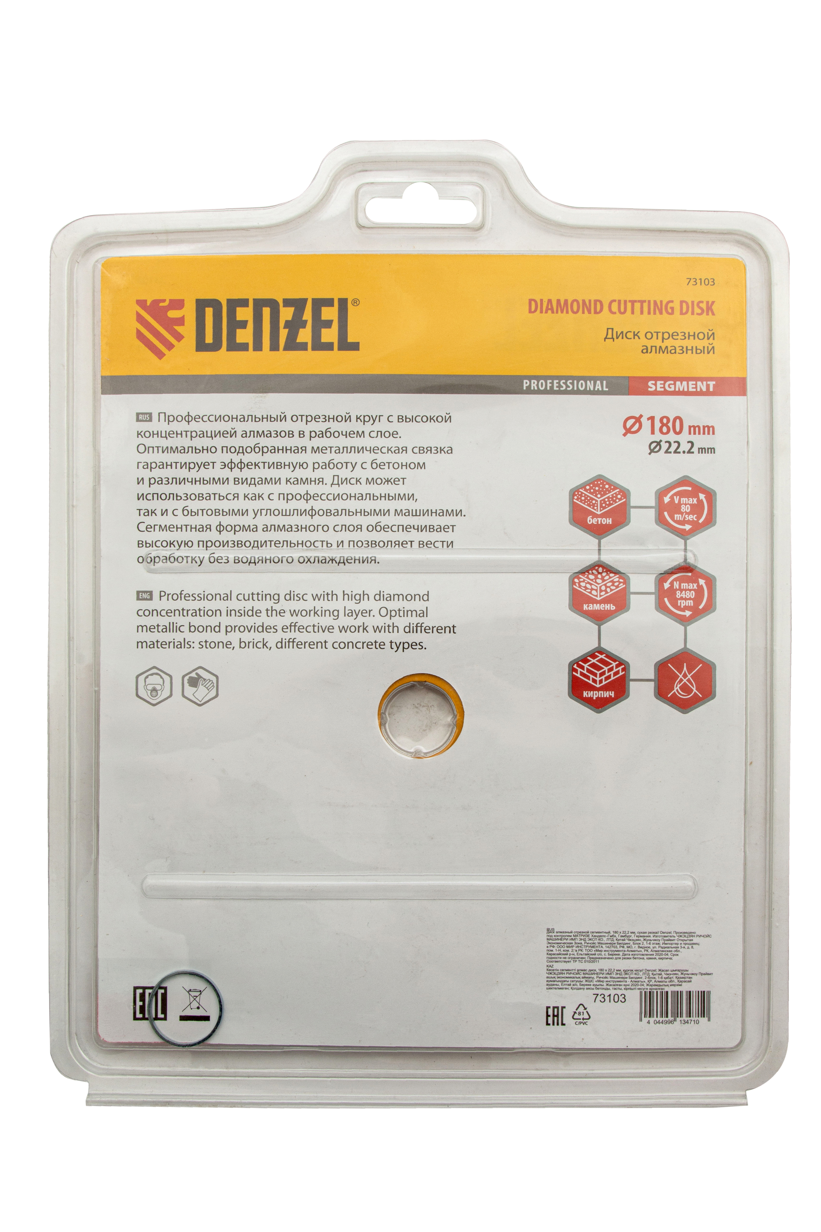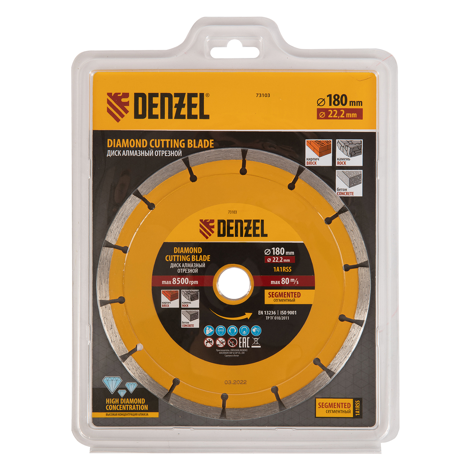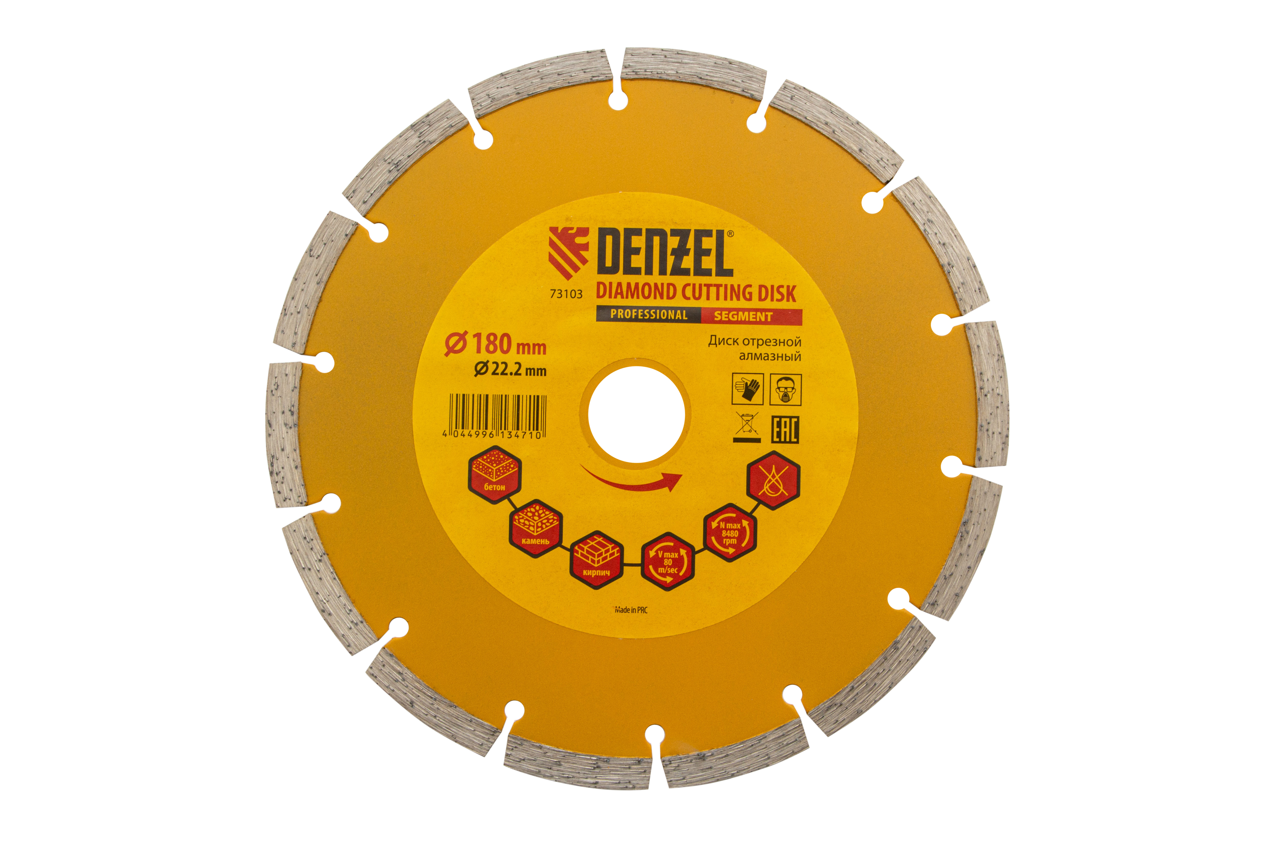 <p>Отрезной сегментный алмазный диск Denzel 73103 диаметром 180 х 22,2 мм — оснастка для УШМ, использующаяся для сухой резки свежего и старого бетона, камня, кирпича, шлакоблока, мрамора, тротуарной плитки, гранита. Диск сегментного типа отличается высокой производительностью даже при интенсивных нагрузках. Подходит для бытового и профессионального использования.</p><h2>Преимущества</h2><ul><li>Высокая скорость реза — рабочая часть шириной 7 мм отличается плотной концентрацией алмазов.</li><li>Удобное применение — диск разделен на сегменты для эффективного отвода шлама, водяное охлаждение не требуется.</li><li>Надежность — рабочая часть, изготовленная по технологии холодного прессования, выдерживает высокие нагрузки.</li><li>Эффективная резка плотных материалов — сбалансированная металлическая связка устойчива к перегреву и перегрузкам.</li></ul>
