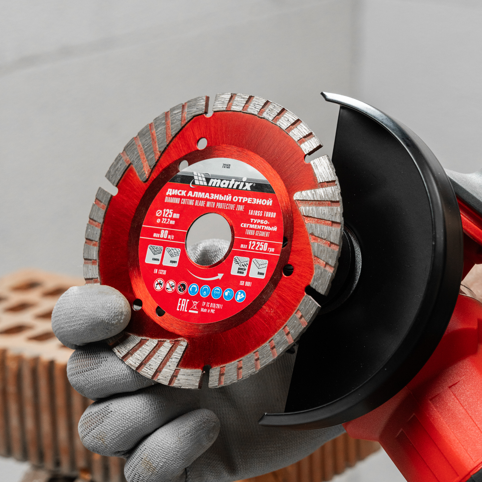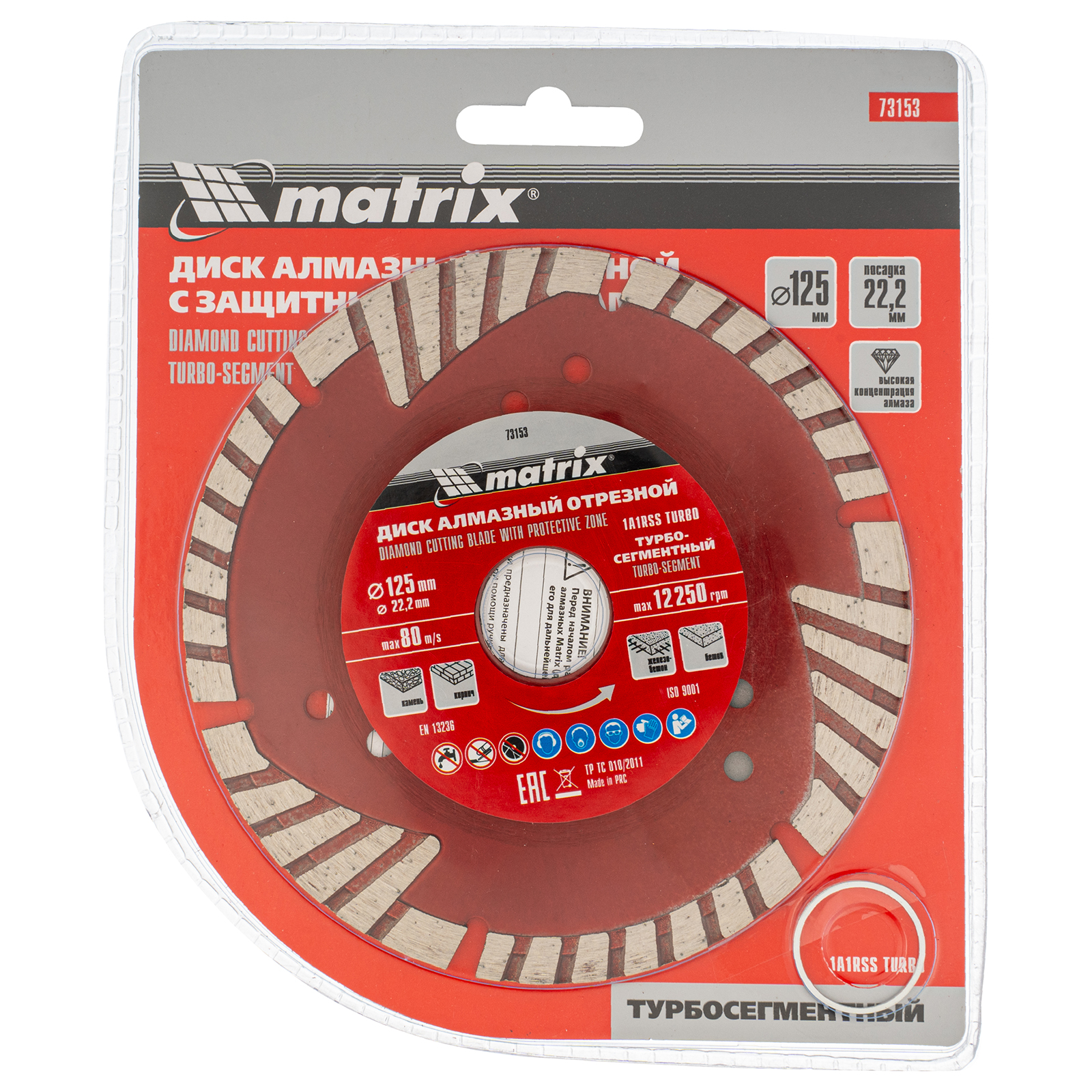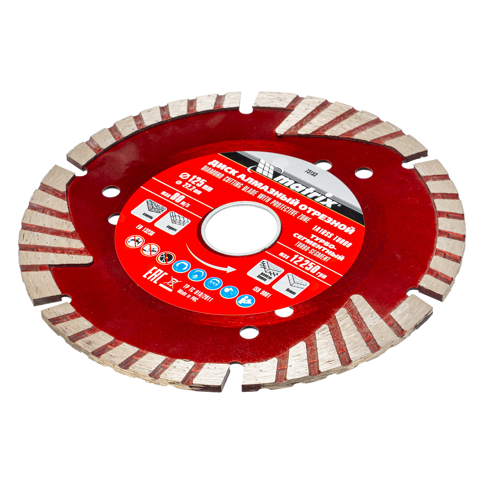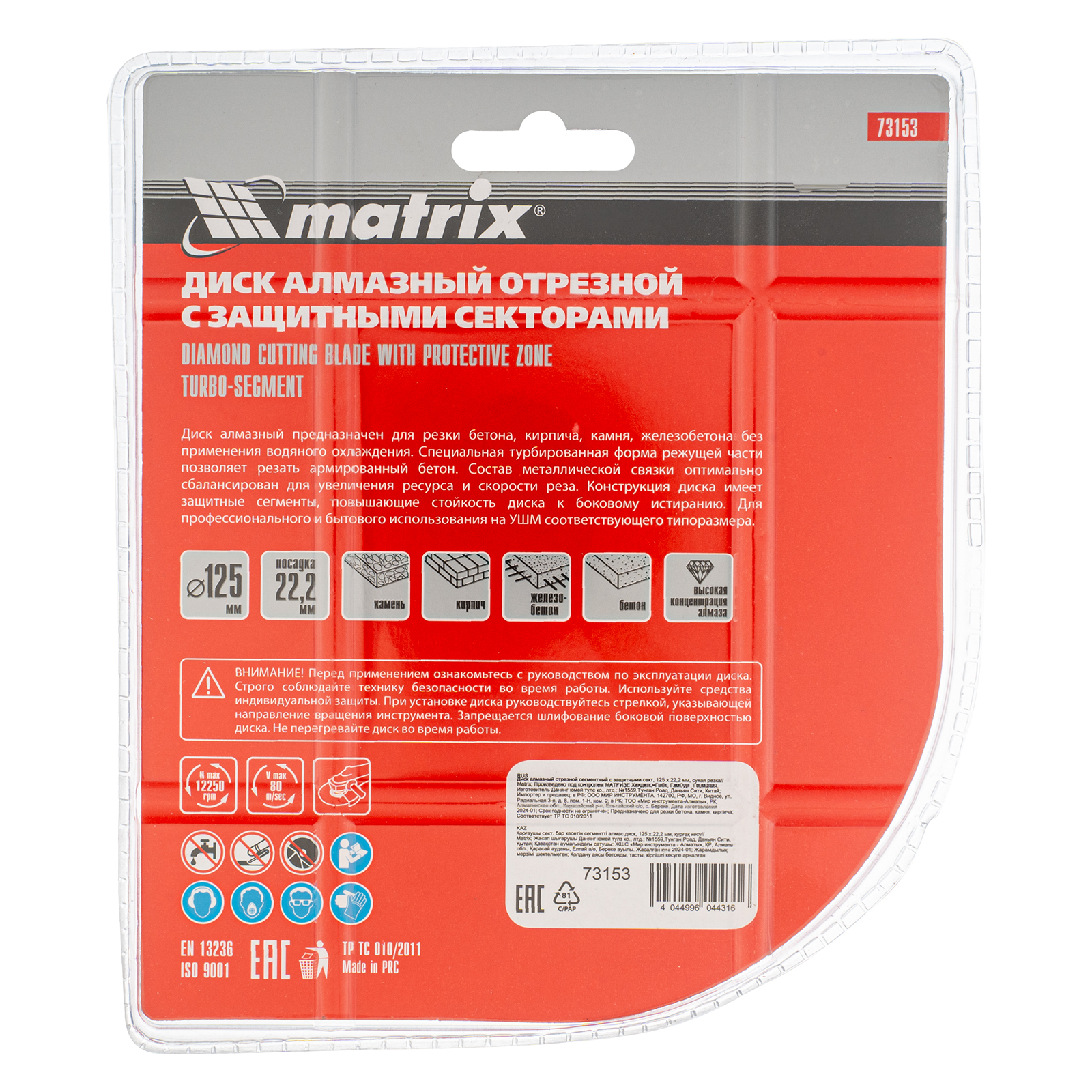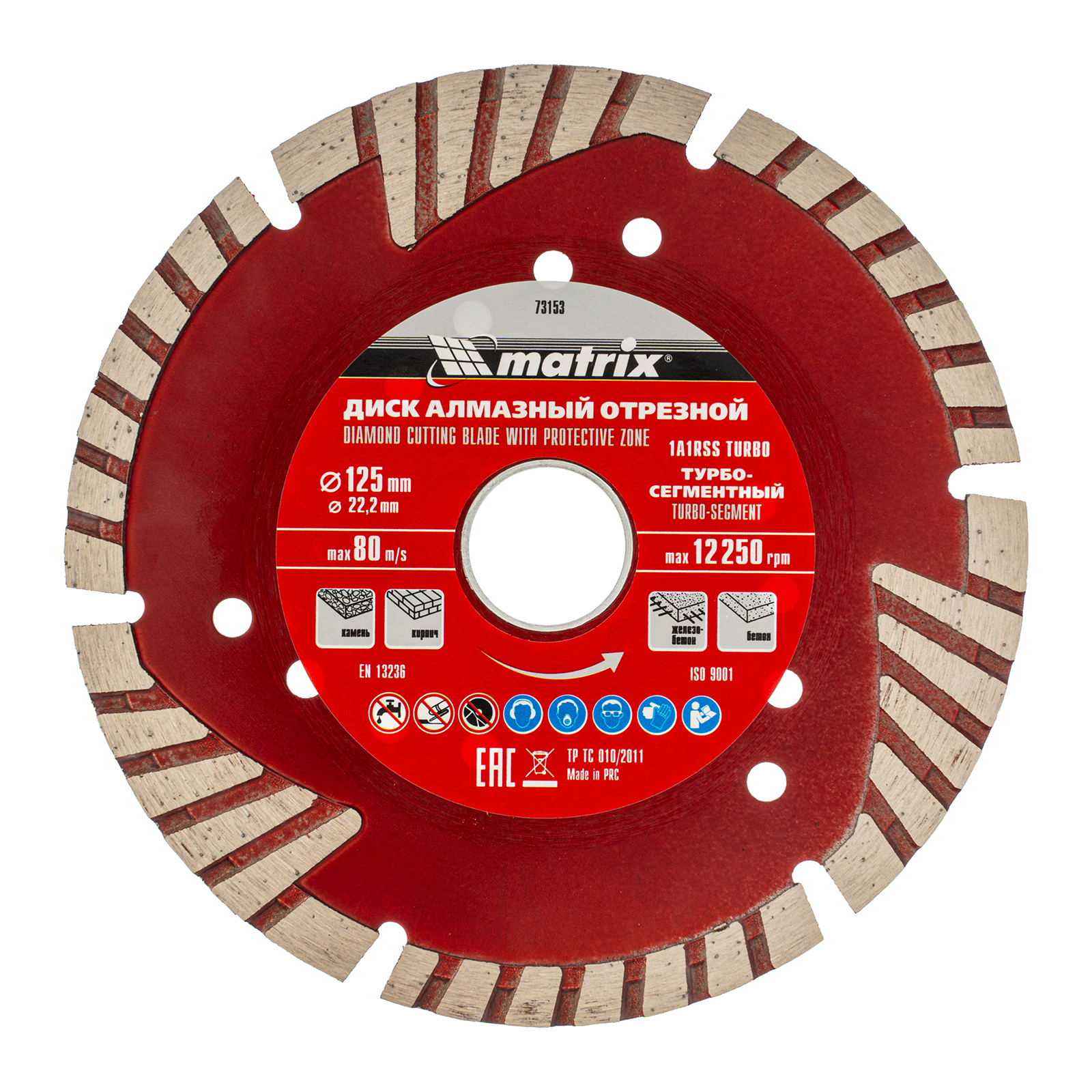 Алмазный отрезной сегментный диск Matrix 73153 с защитными секторами, диаметром 125 х 22,2 мм, применяется для сухой резки бетона разной прочности, камня, кирпича, шлакоблока и тротуарной плитки. Используется как оснастка для углошлифовальных машин с соответствующим посадочным диаметром. Диск изготовлен методом холодного прессования и выдерживает повышенные нагрузки при прохождении арматуры в слабоармированном железобетоне.
