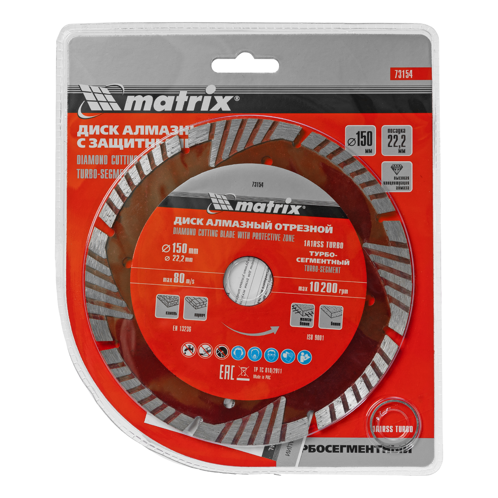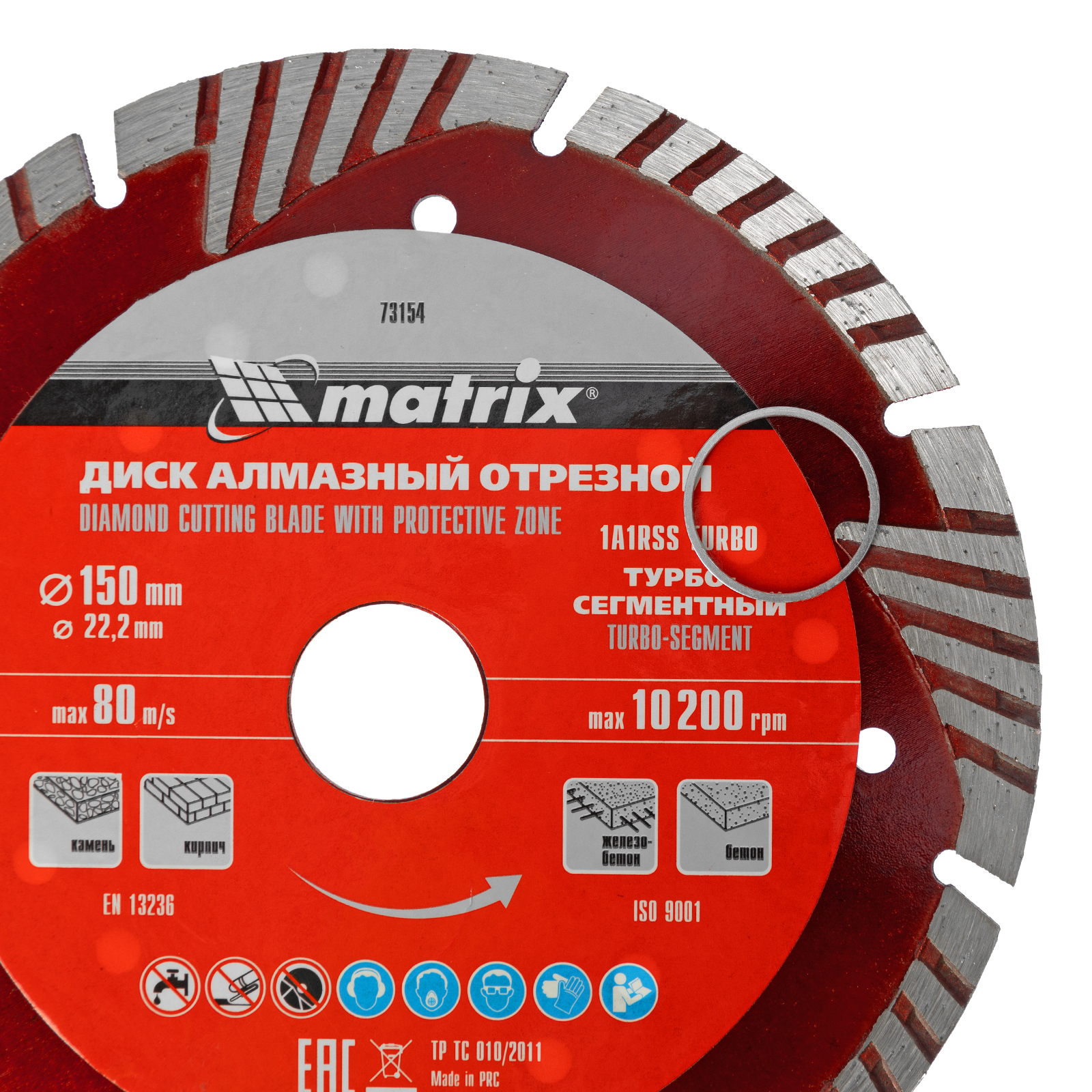 Алмазный отрезной сегментный диск Matrix 73154 с защитными секторами, диаметром 150 х 22,2 мм, применяется для сухой резки бетона разной прочности, камня, кирпича, шлакоблока и тротуарной плитки. Используется как оснастка для углошлифовальных машин с соответствующим посадочным диаметром. Диск изготовлен методом холодного прессования и выдерживает повышенные нагрузки при прохождении арматуры в слабоармированном железобетоне.
