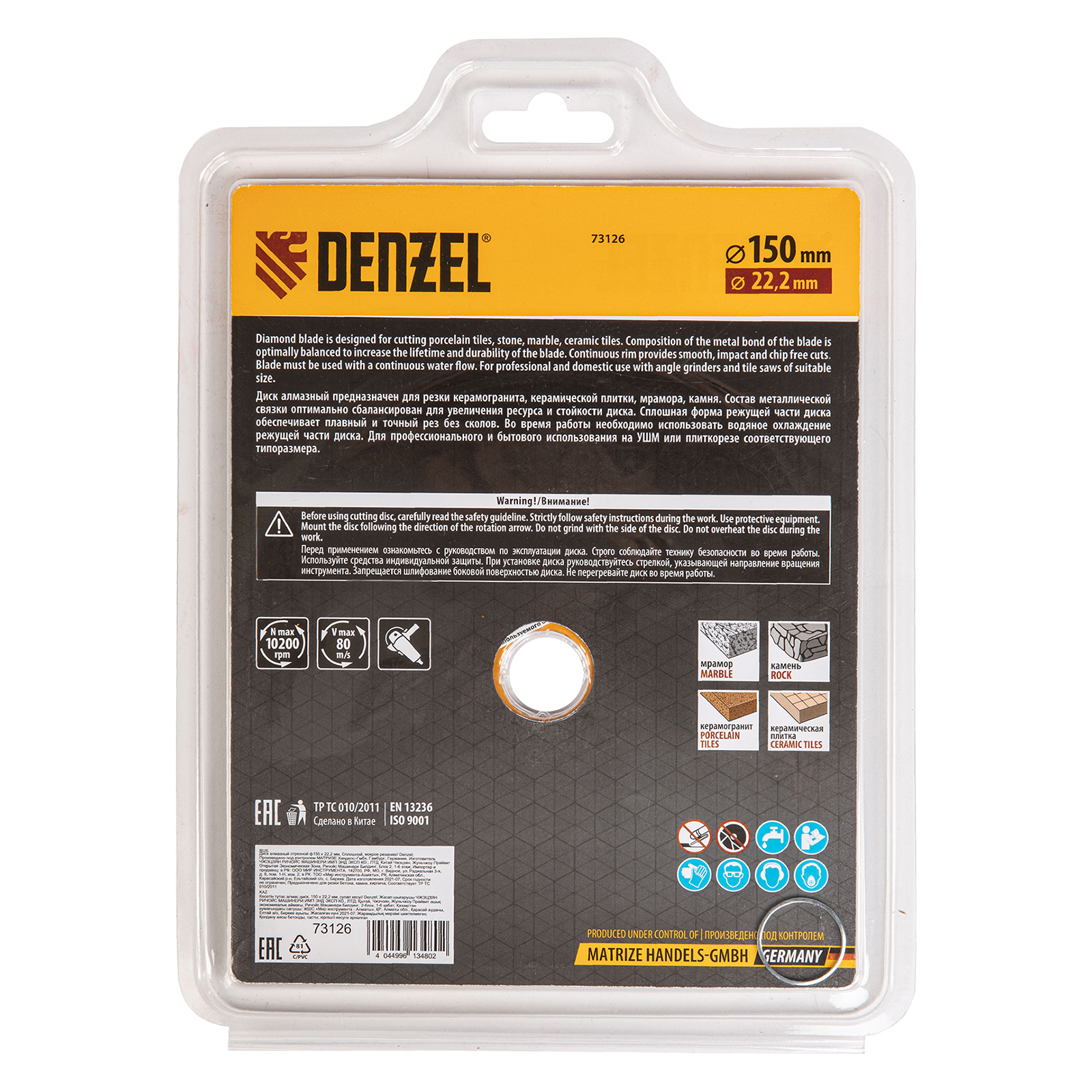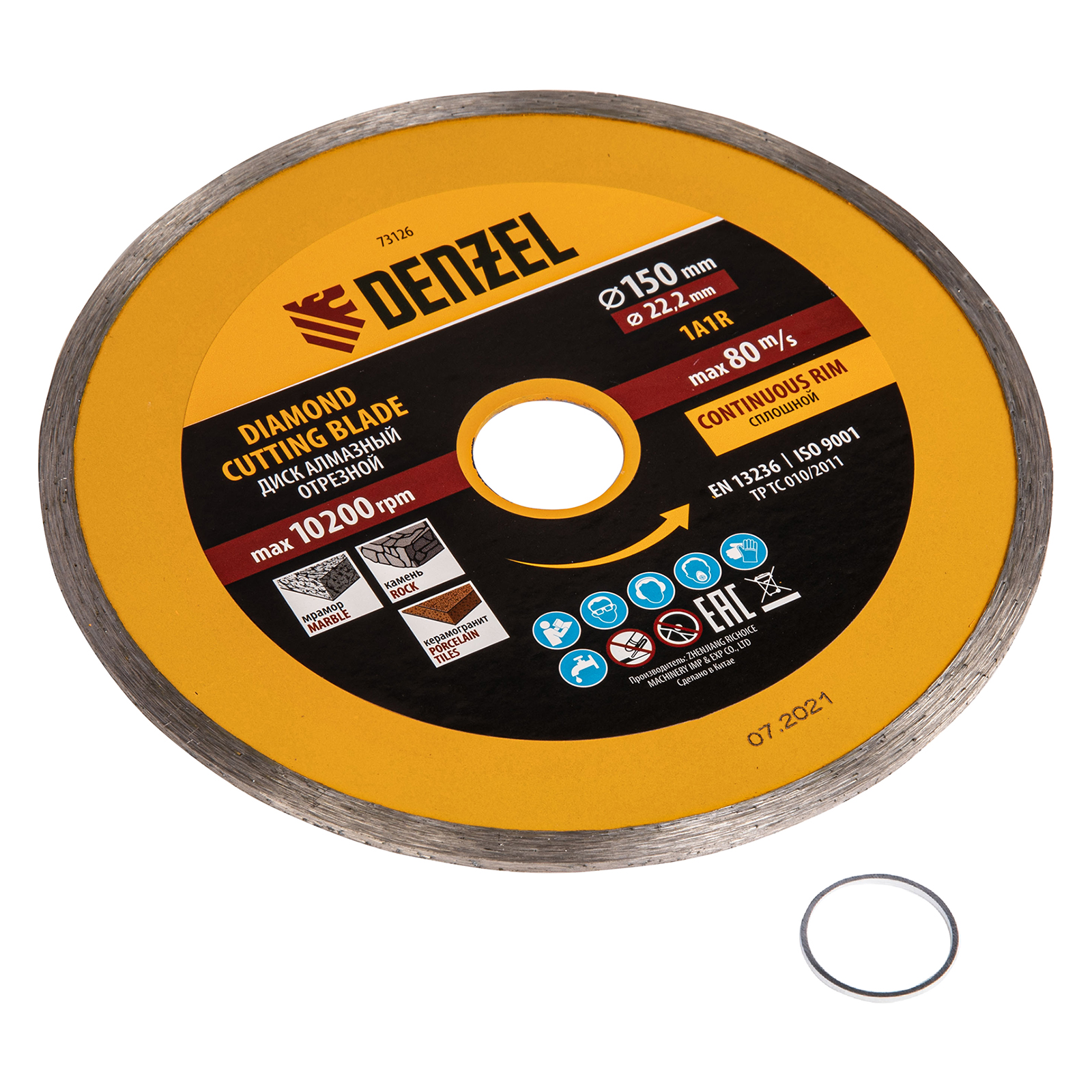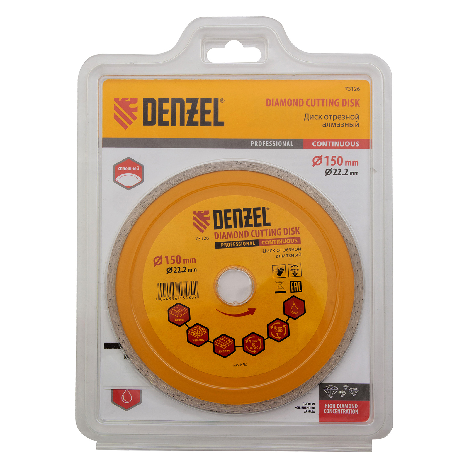 Отрезной алмазный диск Denzel «Сплошной» 73126 диаметром 150 х 22,2 мм используется для «мокрого» резания совместно с углошлифовальной машиной или плиткорезом с соответствующим посадочным диаметром. Режет камень, мрамор, керамогранитную и керамическую плитку. Диск отличается хорошей производительностью за счет высокой скорости реза, поэтому подходит для профессионального применения.