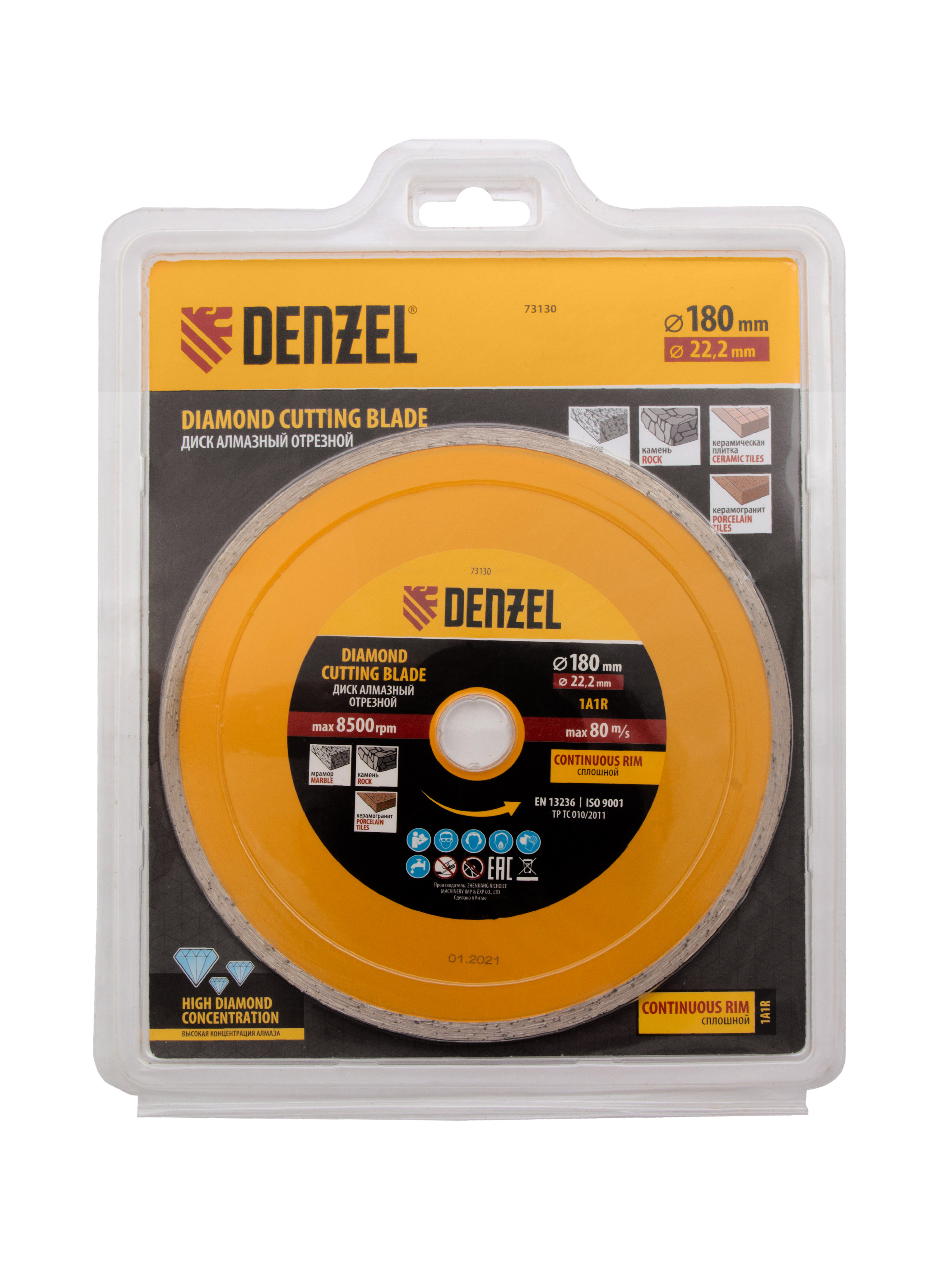 Отрезной алмазный диск Denzel «Сплошной» 73130 диаметром 180 х 22,2 мм используется для «мокрого» резания совместно с углошлифовальной машиной или плиткорезом с соответствующим посадочным диаметром. Режет камень, мрамор, керамогранитную и керамическую плитку. Диск отличается хорошей производительностью за счет высокой скорости реза, поэтому подходит для профессионального применения.