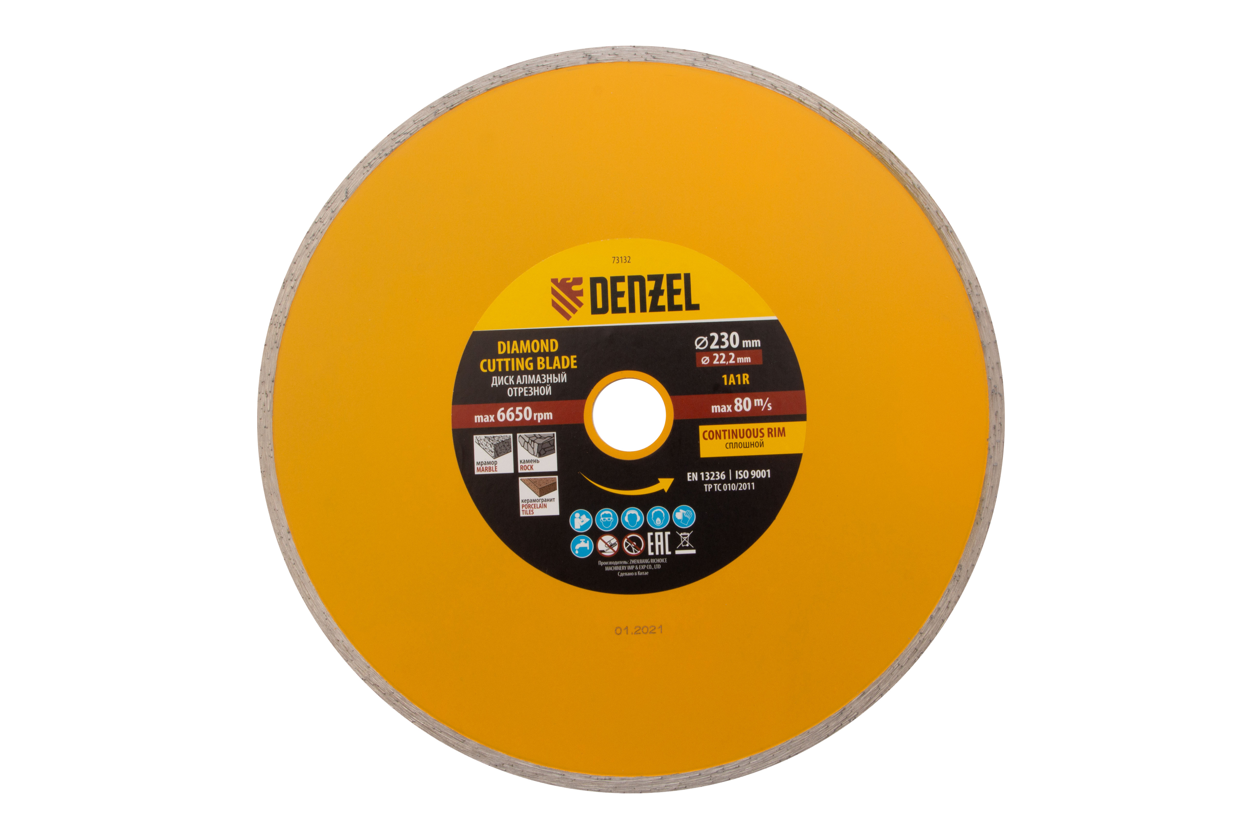 Отрезной алмазный диск Denzel «Сплошной» 73132 диаметром 230 х 22,2 мм используется для «мокрого» резания совместно с углошлифовальной машиной или плиткорезом с соответствующим посадочным диаметром. Режет камень, мрамор, керамогранитную и керамическую плитку. Диск отличается хорошей производительностью за счет высокой скорости реза, поэтому подходит для профессионального применения.