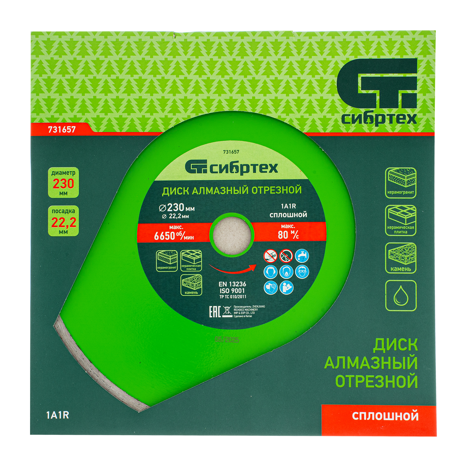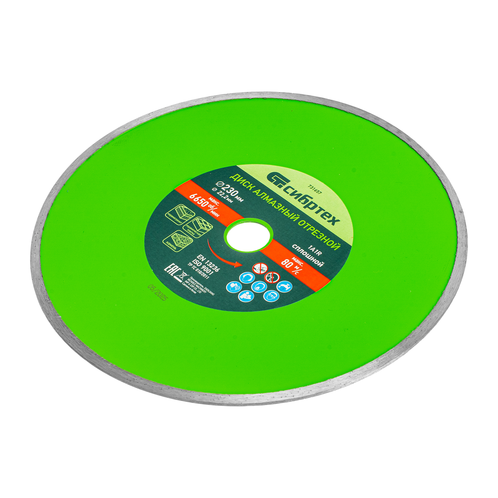 Алмазный отрезной сплошной диск Сибртех 731657 диаметром 230 х 22,2 мм применяется для мокрой резки керамогранитной, керамической плитки, а также мрамора и камня. Используется в качестве оснастки для болгарок и плиткорезов с посадочным диаметром 22,2 мм. Диск обладает хорошим рабочим ресурсом и рассчитан на долгую службу. Рез материалов необходимо проводить с использованием водяного охлаждения.