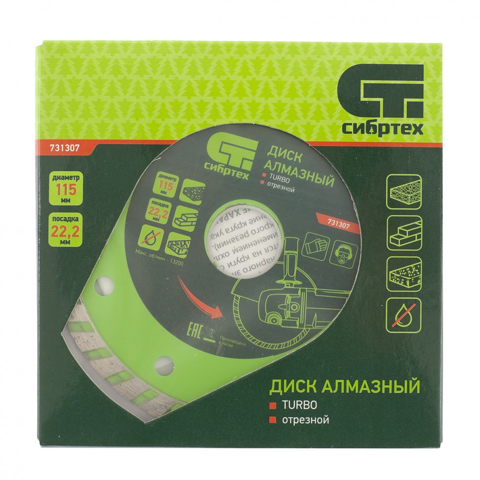 Алмазный отрезной диск Сибртех Turbo 731307 для сухой резки, диаметром 115 х 22,2 мм, устанавливается на углошлифовальную машину. Позволяет резать твердые материалы: бетон, железобетон, камень, песчаник. Диск предназначен для бытового использования.