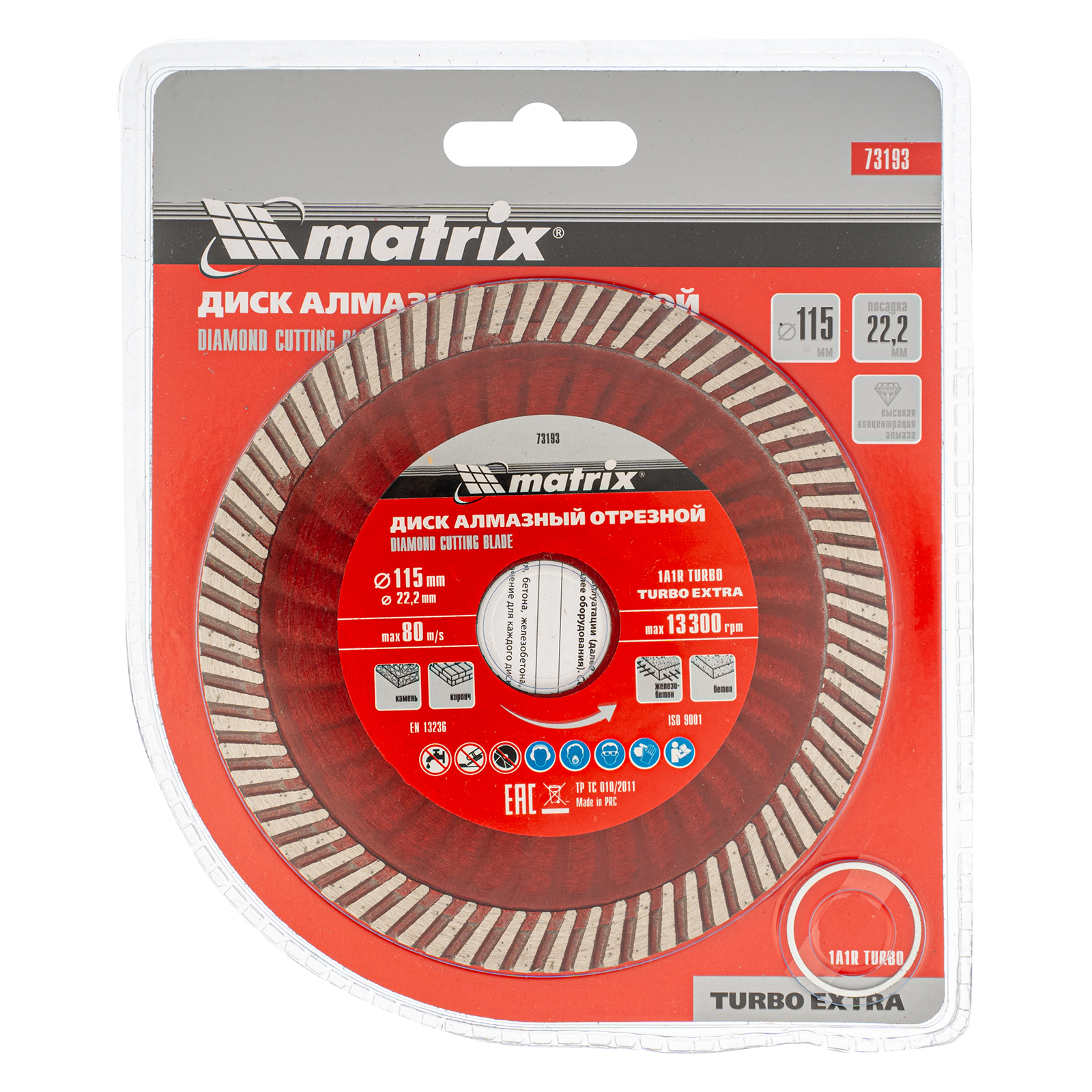 <p>Отрезной алмазный диск Matrix Turbo Extra 73193, 115 х 22,2 мм, используется для сухой резки бетона, железобетона, кирпича, тротуарной плитки, шлакоблока и камня. Он устанавливается на углошлифовальные машины с посадочным диаметром 22,2 мм. Обеспечивает высокую скорость реза, поэтому подходит для интенсивного применения.</p><h2>Преимущества</h2><ul><li>Экстратурбированная форма — в процессе реза обеспечивается эффективное охлаждение и удаление шлама.</li><li>Повышенная производительность — рабочий слой шириной 7 мм состоит из синтетических алмазов высокого качества.</li><li>Оптимально сбалансированный состав связки — режущий слой равномерно стачивается, своевременно вскрывая новые алмазы.</li><li>Эффективное решение бытовых и профессиональных задач — концентрация алмазов повышена, диск рассчитан на долгую эксплуатацию.</li></ul>