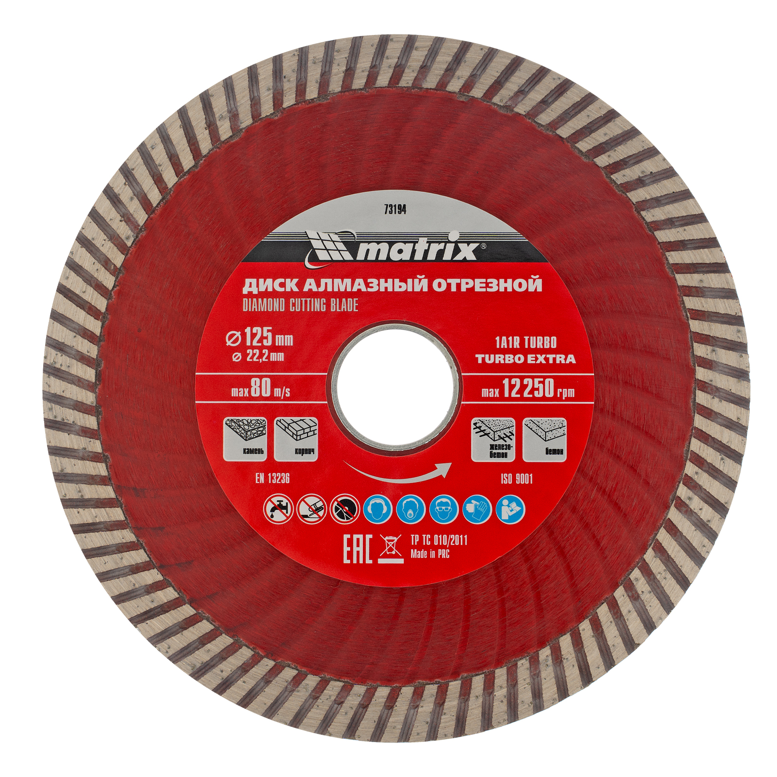<p>Отрезной алмазный диск Matrix Turbo Extra 73194, 125 х 22,2 мм, используется для сухой резки бетона, железобетона, кирпича, тротуарной плитки, шлакоблока и камня. Он устанавливается на углошлифовальные машины с посадочным диаметром 22,2 мм. Обеспечивает высокую скорость реза, поэтому подходит для интенсивного применения.</p><h2>Преимущества</h2><ul><li>Экстратурбированная форма — в процессе реза обеспечивается эффективное охлаждение и удаление шлама.</li><li>Повышенная производительность — рабочий слой шириной 7 мм состоит из синтетических алмазов высокого качества.</li><li>Оптимально сбалансированный состав связки — режущий слой равномерно стачивается, своевременно вскрывая новые алмазы.</li><li>Эффективное решение бытовых и профессиональных задач — концентрация алмазов повышена, диск рассчитан на долгую эксплуатацию.</li></ul>