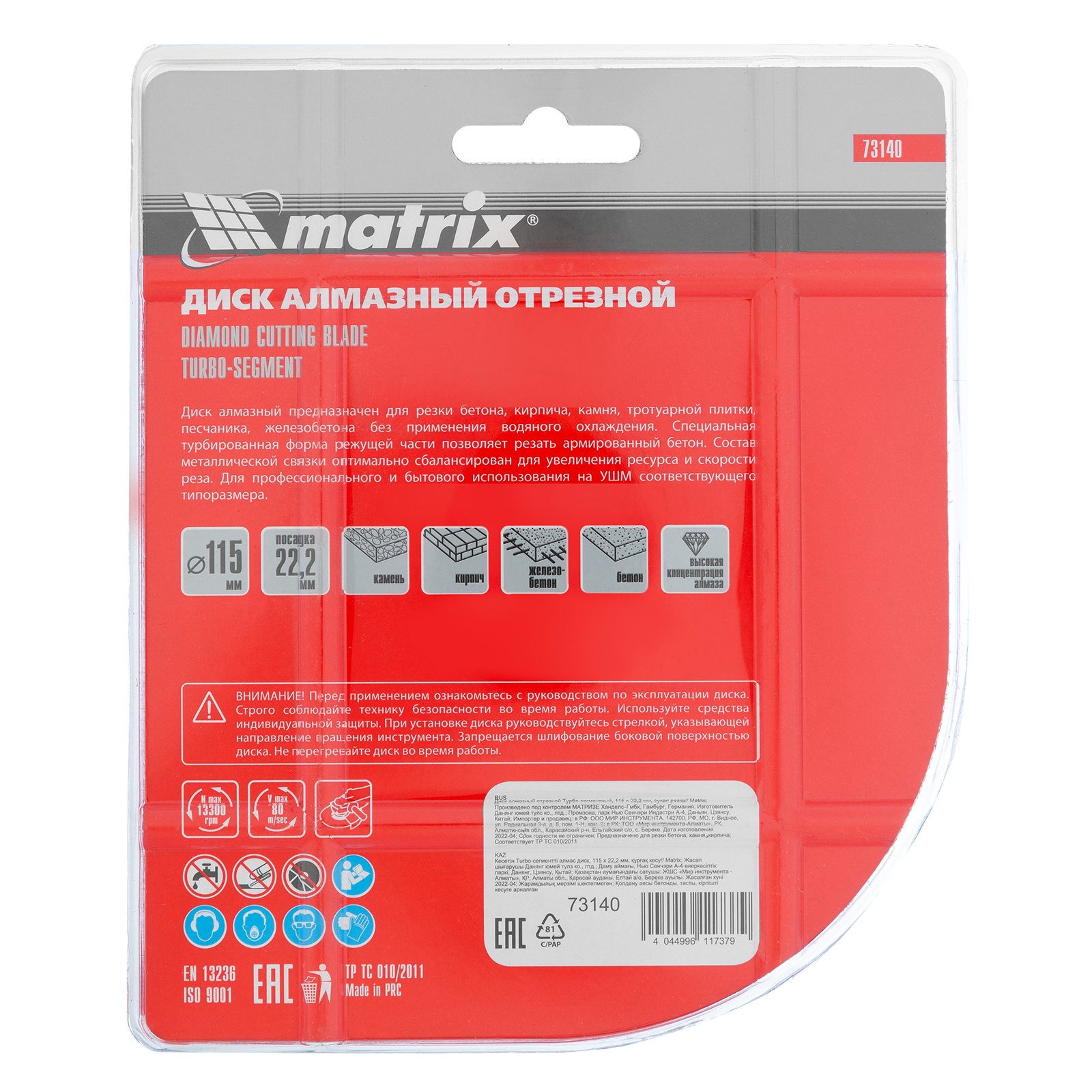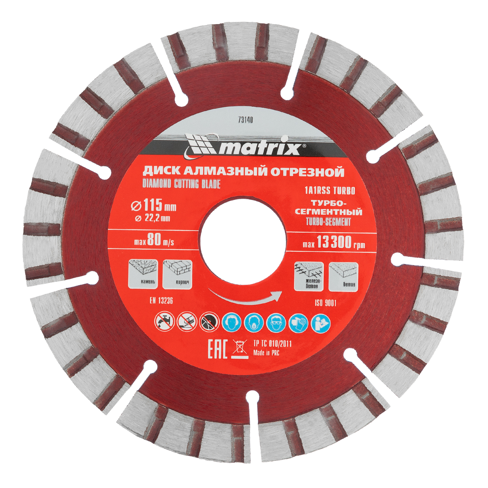 Турбо-сегментный отрезной алмазный диск Matrix 73140 диаметром 115 х 22,2 мм предназначен для сухой резки бетона различной прочности, камня, кирпича, тротуарной плитки, шлакоблока. Устанавливается на углошлифовальную машину с посадочным размером 22,2 мм. Благодаря специально подобранной металлической связке диск демонстрирует высокие результаты работы даже при резке слабоармированного железобетона. Оснастка оптимальна для бытового применения.