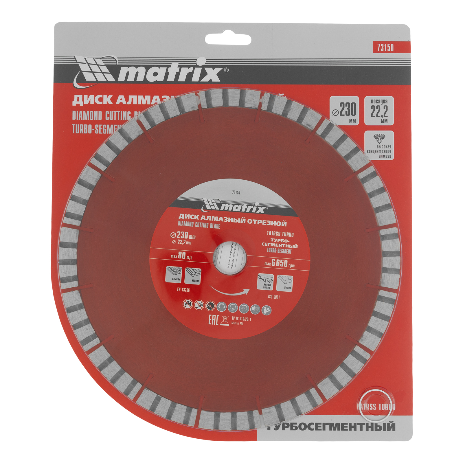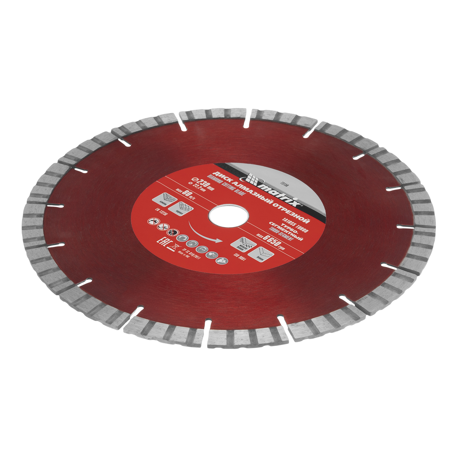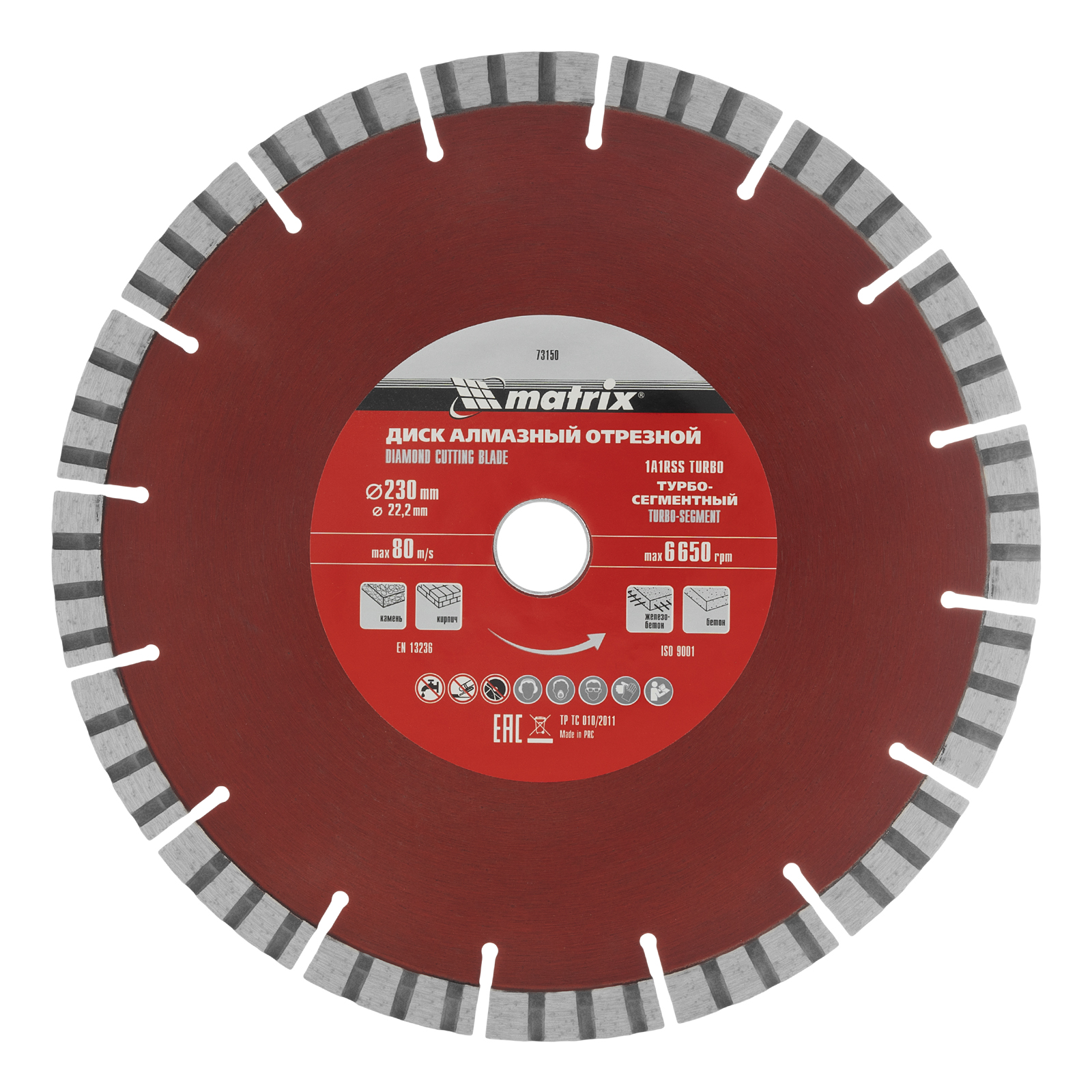 Турбо-сегментный отрезной алмазный диск Matrix 73150 диаметром 230 х 22,2 мм предназначен для сухой резки бетона различной прочности, камня, кирпича, тротуарной плитки, шлакоблока. Устанавливается на углошлифовальную машину с посадочным размером 22,2 мм. Благодаря специально подобранной металлической связке диск демонстрирует высокие результаты работы даже при резке слабоармированного железобетона. Оснастка оптимальна для бытового применения.