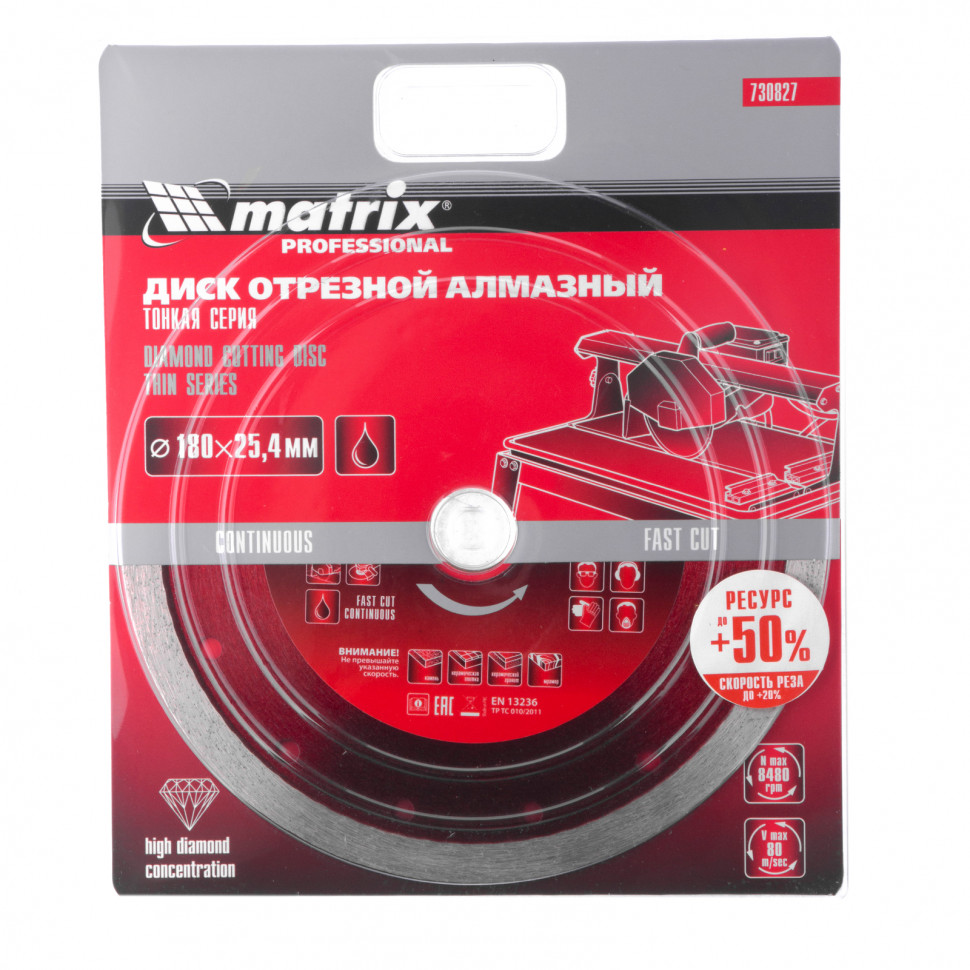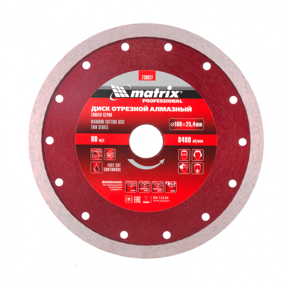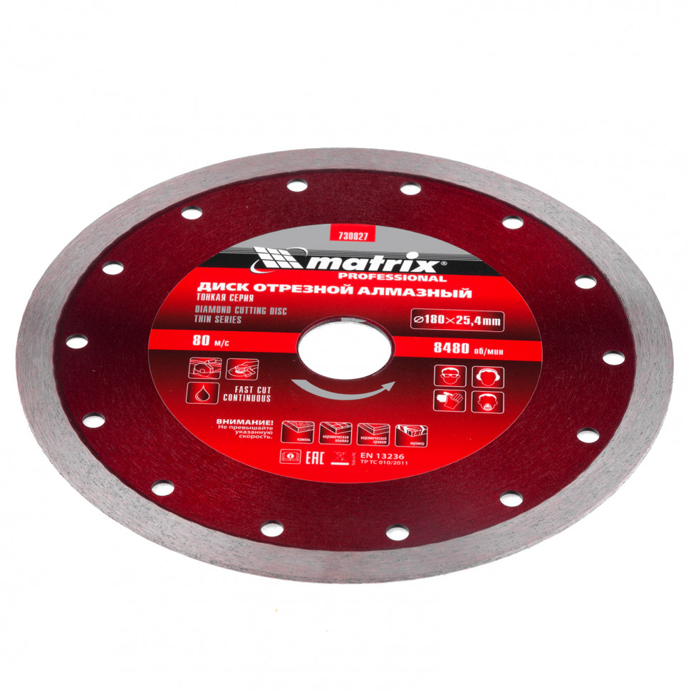 Отрезной сплошной алмазный диск Matrix ф180х25,4 мм 730827, тонкий, обеспечивает мокрое резание плотных материалов: керамогранита, керамической и кафельной плитки, мрамора, натурального и искусственного камня. Он устанавливается на УШМ или плиткорезы и используется с применением водяного охлаждения. Диск увеличивает производительность на 20% благодаря небольшой толщине 2 мм и снижению нагрузки на инструмент.