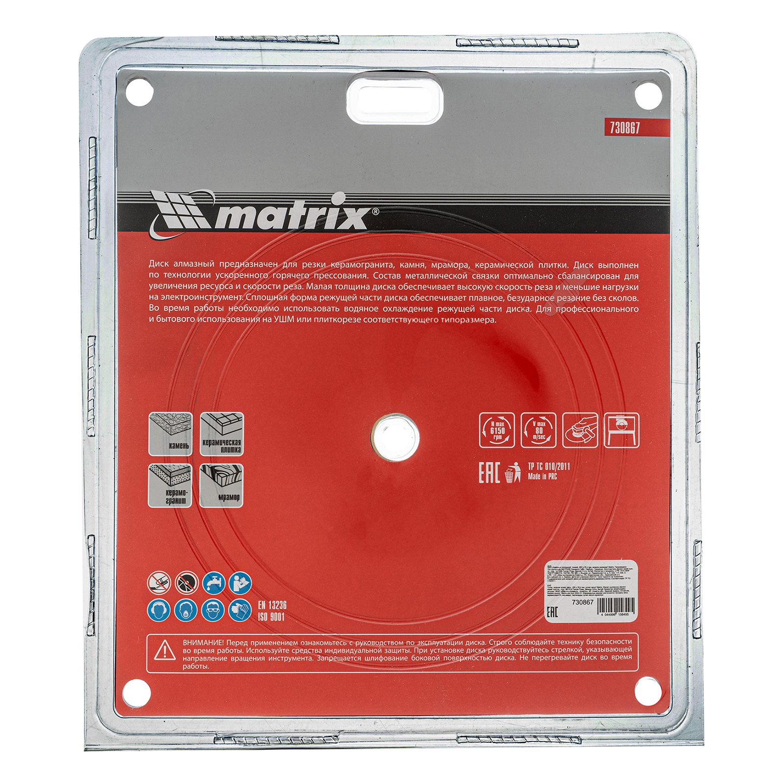 Тонкий сплошной алмазный диск Matrix 730867 диаметром 250 х 25,4 мм предназначен для «мокрого» резания плотных материалов: керамогранита, керамической и кафельной плитки, мрамора, натурального и искусственного камня. Устанавливается на УШМ или плиткорез. Благодаря небольшой толщине 2,3 мм диск снижает нагрузку на инструмент и увеличивает производительность на 20%. Подходит для бытового и профессионального использования. Во время работы рекомендуется использовать водяное охлаждение.