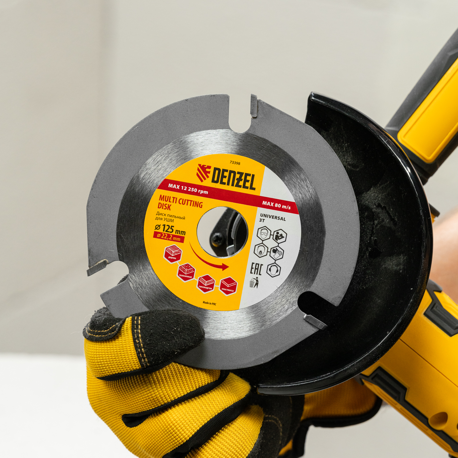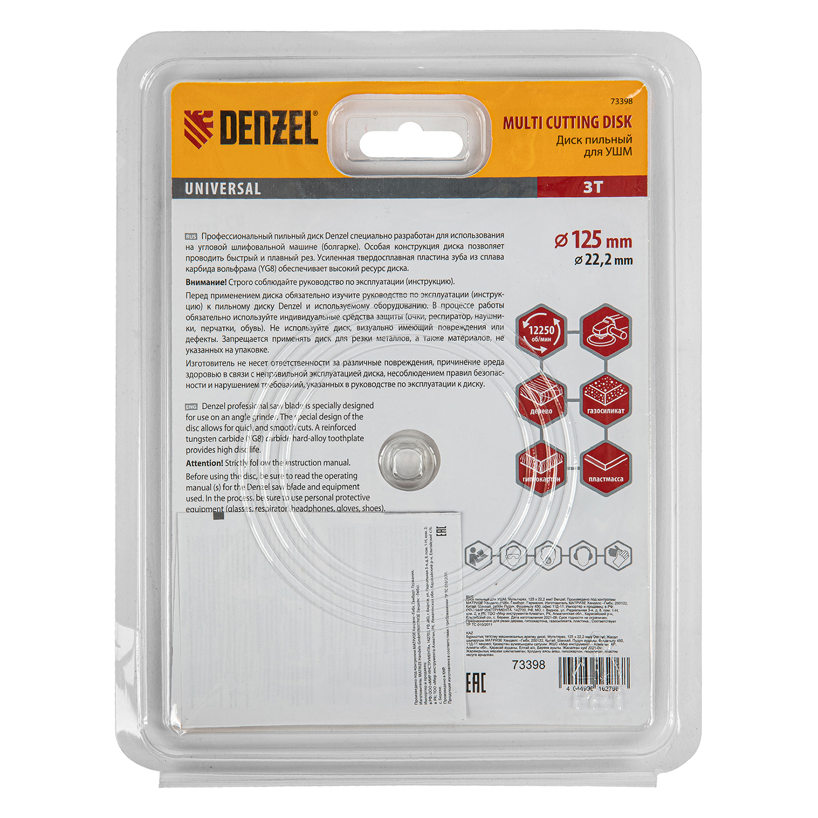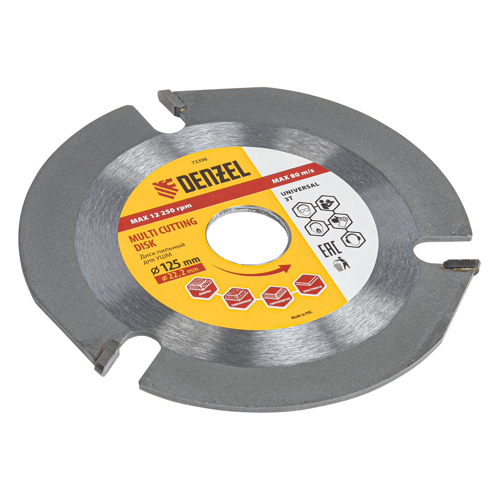 <p>Пильный диск для УШМ Denzel Мультирез 73398 диаметром 125 х 22,2 мм, — оснастка для углошлифовальных машин, позволяющая быстро распилить древесину, тонкий пластик, гипсокартон и газосиликат. Будет полезен как профессиональному мастеру, так и домашнему умельцу. Перед эксплуатацией необходимо изучить инструкцию как диска, так и углошлифовальной машины.</p><h2>Преимущества</h2><ul><li>Высокий ресурс — усиленные режущие пластины изготовлены из высокотвердого сплава карбида вольфрама YG8, прочный корпус не деформируется даже при интенсивном использовании. </li><li>Функциональность — особая форма режущих пластин позволяет делать поперечные выборки древесины и других материалов.</li><li>Высокое качество выполняемых работ — за счет продуманной геометрии диск быстро и плавно режет материалы без рывков.</li></ul>