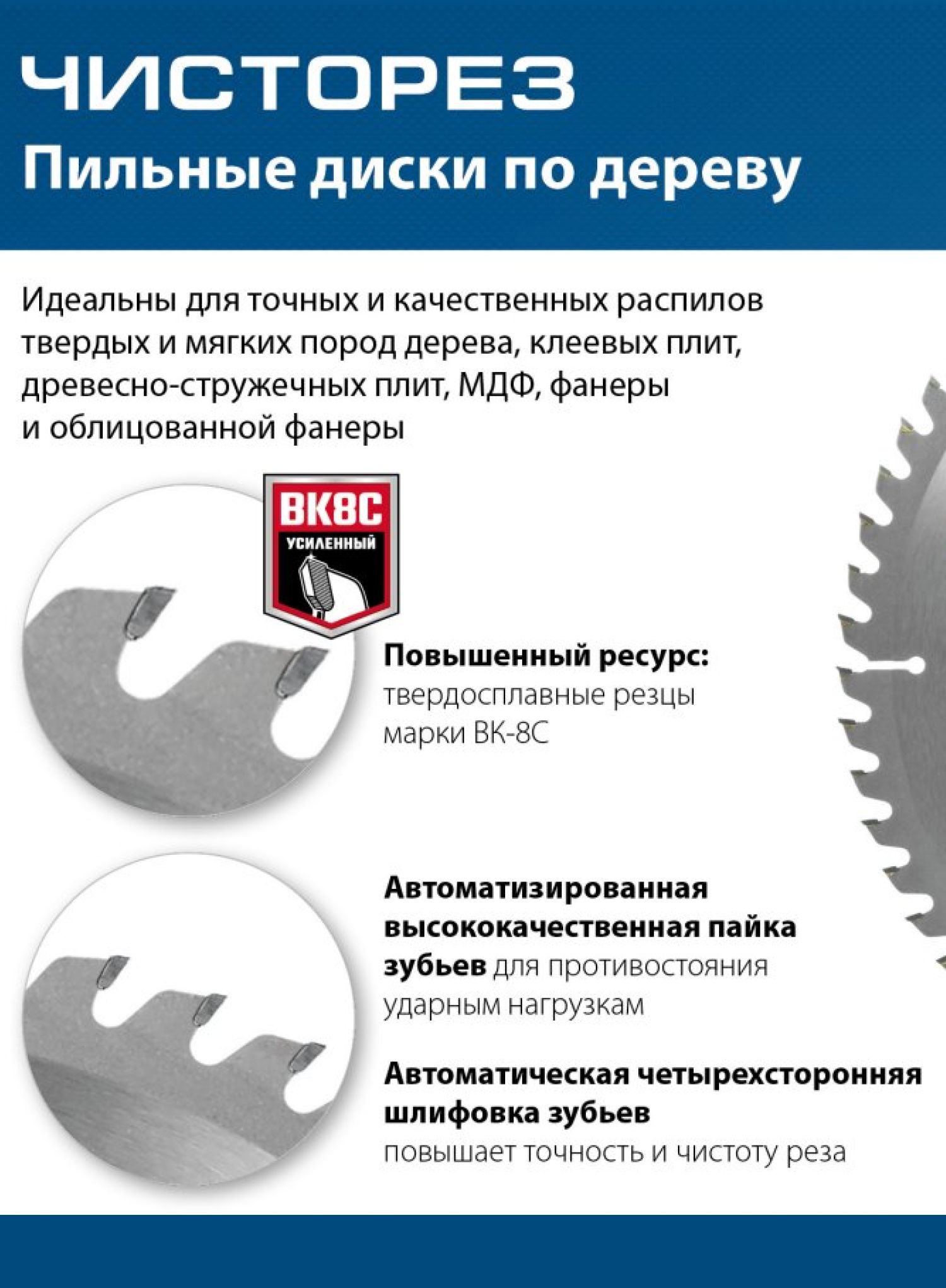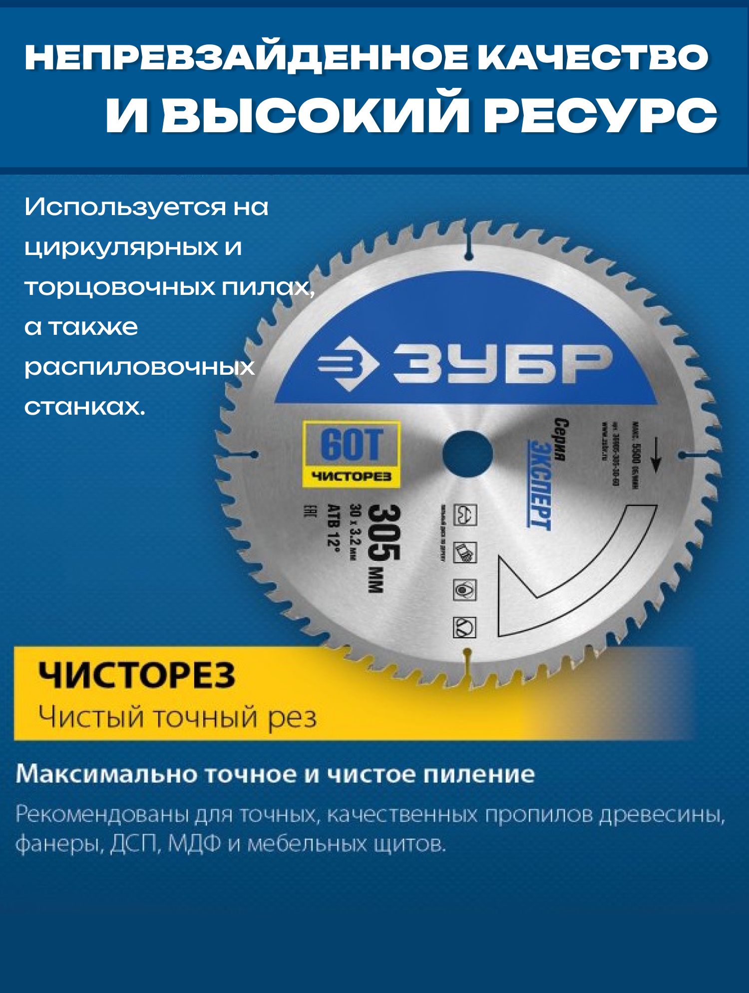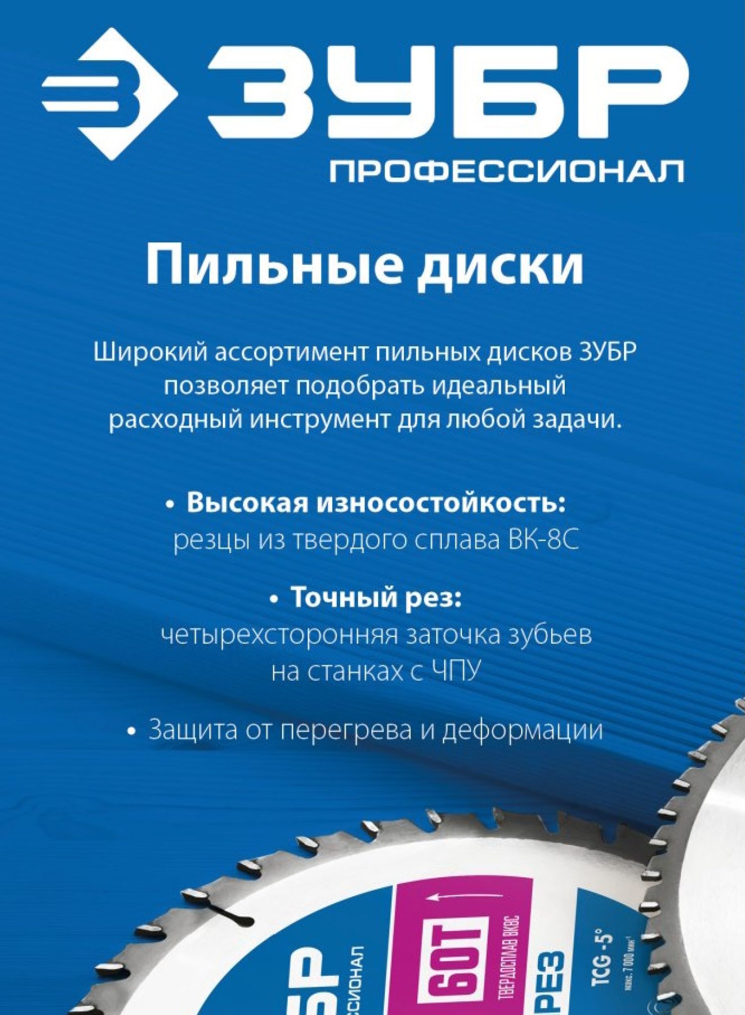 Пильный диск по дереву Чисторез от бренда ЗУБР - это пильный диск для точного и чистого распила всех типов древесины. Диск пильный для пилы применяется для распила твердых и мягких пород дерева, клеевых плит, древесно-стружечных плит и МДФ, фанеры и облицованной фанеры. Компьютерная балансировка пильного диска и закаленный корпус из высоколегированной стали препятствуют возникновению биений при работе диском. Автоматическая трехсторонняя шлифовка зубьев диска для максимально точной геометрии режущих элементов и чистого реза. Твердосплавные резцы марки ВК8С с легкостью справляются с любым древесным материалом.Используется для продольного, поперечного и углового распила древесины и древесных материалов на циркулярных, торцовочных и станковых пилах.