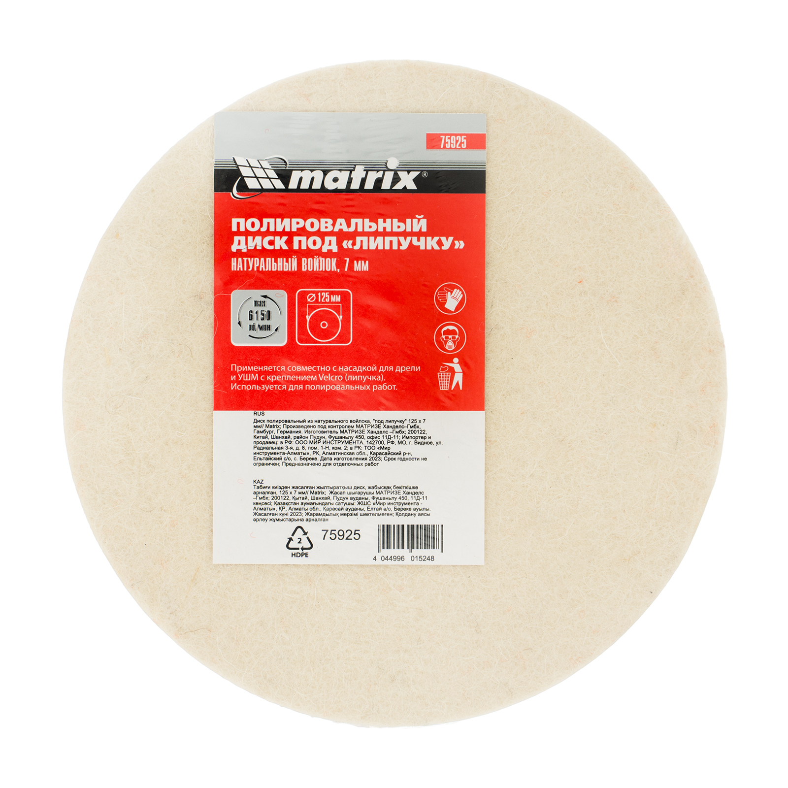 Полировальный диск под «липучку» Matrix 75925 размером 125 х 7 мм предназначен для тонких работ по металлу, стеклу, камню, пластмассе. Устанавливается на полировальную машину, углошлифовальную машинку или дрель, совместимую с опорной тарелкой (насадкой) диаметром 125 мм. Диск изготовлен из натурального войлока, оптимального для полировки материалов, сглаживания микротрещин, придания поверхности блеска, в том числе после обработки мелкозернистым абразивом.