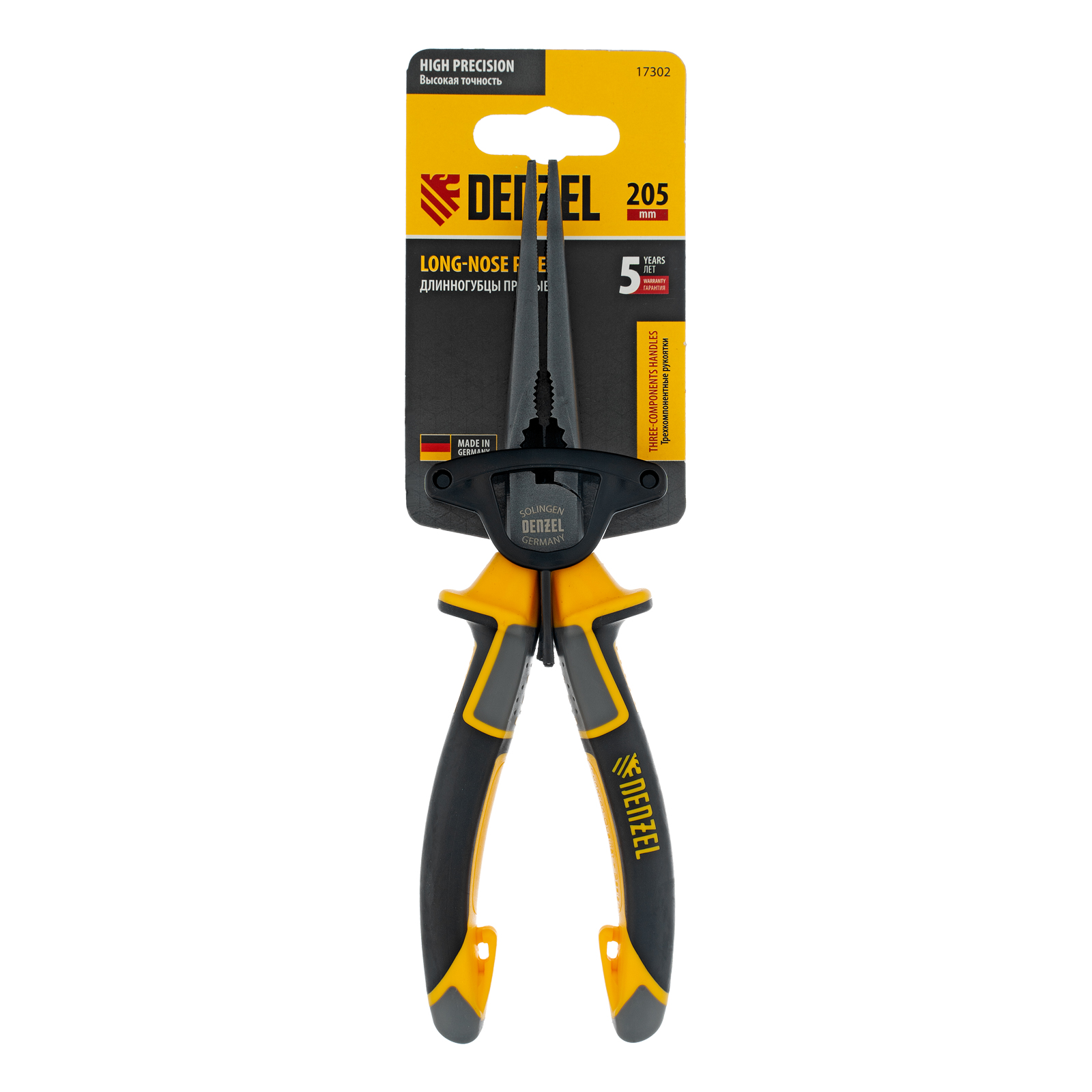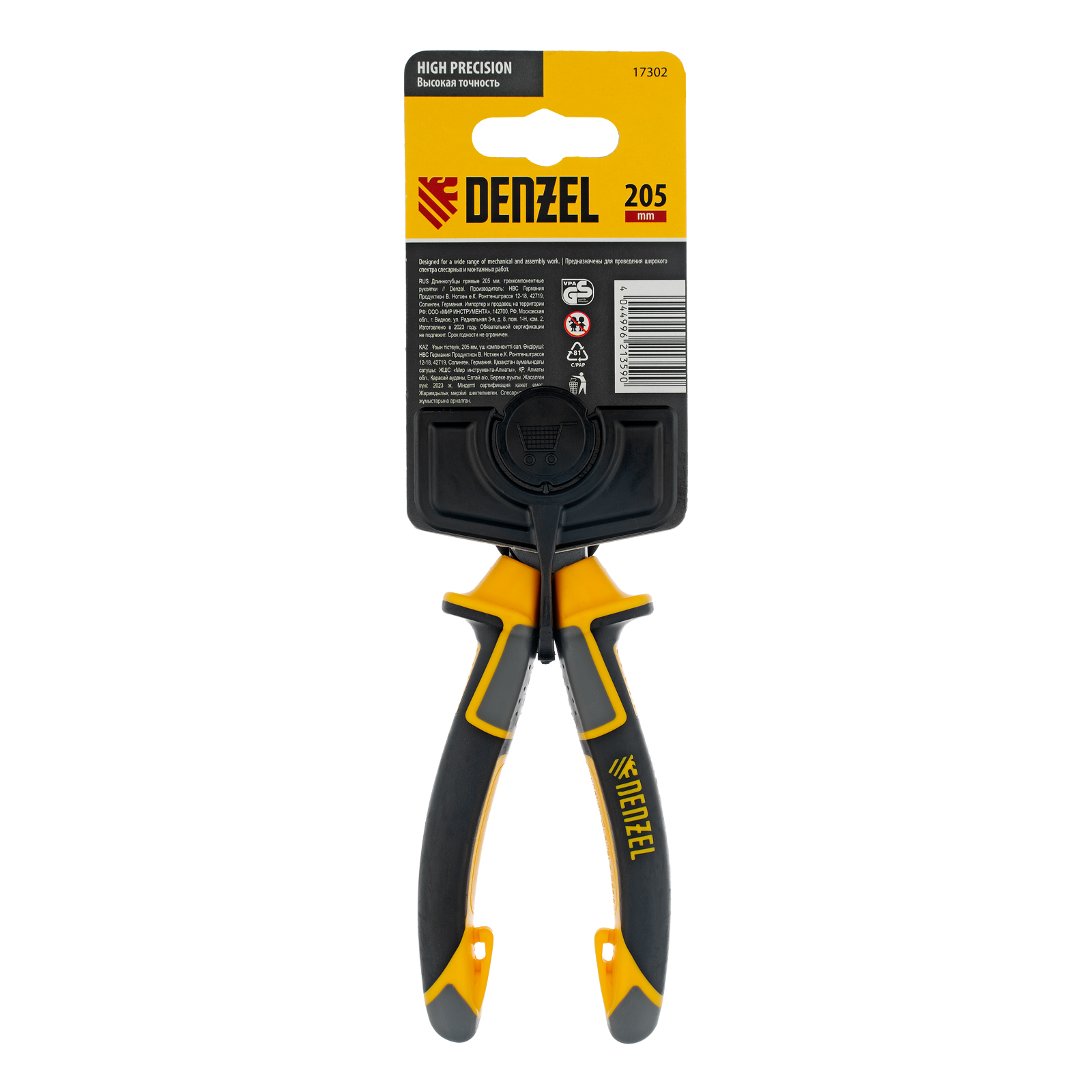 Прямые длинногубцы Denzel 17302 длиной 205 мм, с трехкомпонентными рукоятками, используются для работы с мелкими деталями и крепежом. Позволяют удерживать, сгибать и перекусывать провода или проволоку. Максимальный диаметр перерезаемой мягкой проволоки (алюминиевой, медной, с пределом прочности 220 Н/мм2) составляет 3,9 мм, проволоки средней жесткости и гвоздей (750 Н/мм2) — 3,2 мм, жесткой (1800 Н/мм2) — 2,2 мм. Инструмент оптимален для манипуляций в ограниченном пространстве. Ровные насечки на зажимных частях обеспечивают надежный захват и удержание деталей. Длинногубцы будут полезны во время проведения электромонтажных работ, ремонта оргтехники, техобслуживания автомобиля, пригодятся также в быту.