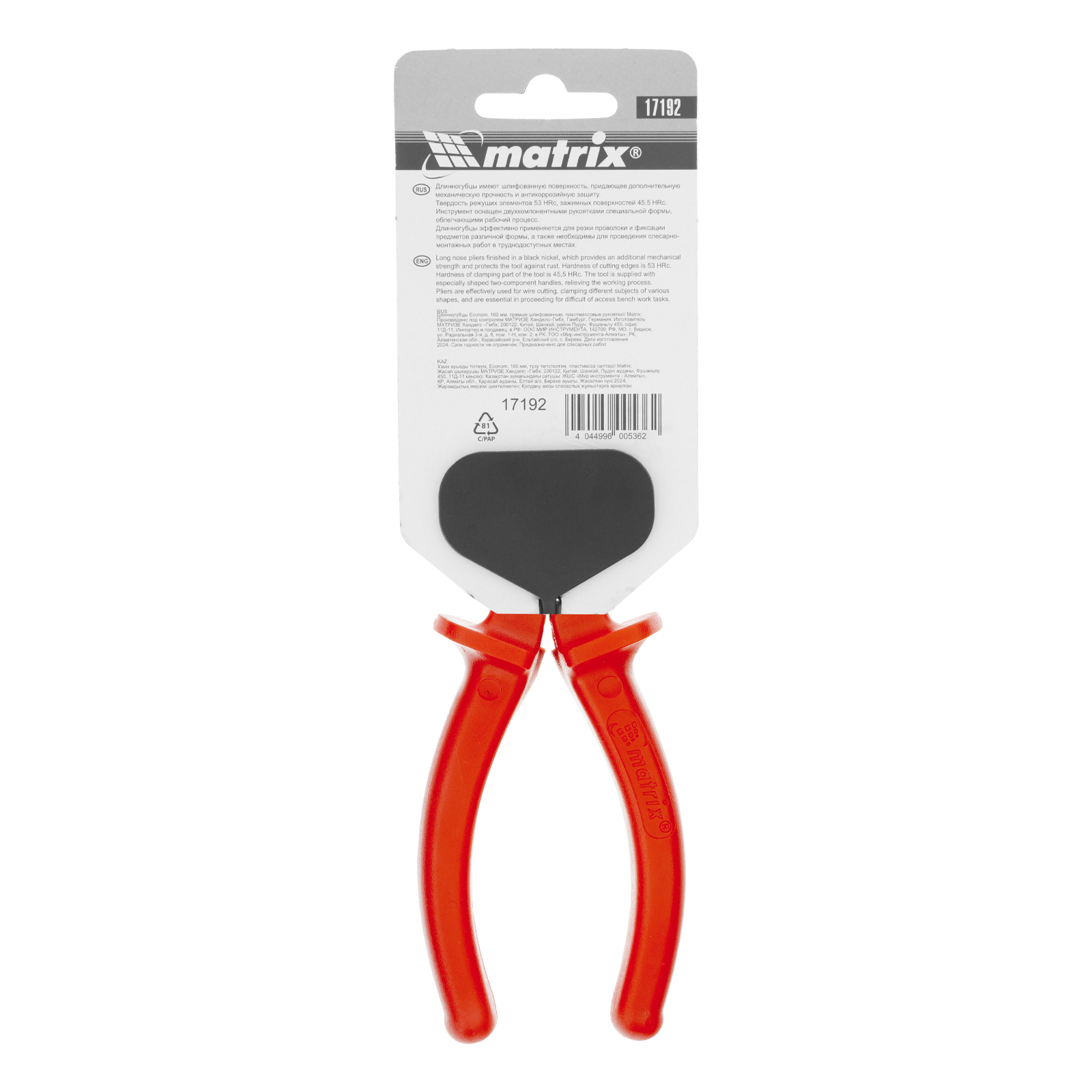 <p>Прямые шлифованные длинногубцы Matrix Econom 17192 длиной 160 мм, с пластмассовыми рукоятками, предназначены для захвата и надежного удержания гвоздей и других мелких деталей, перекусывания проводов, прутков, проволоки и решения широкого спектра ремонтных и монтажных задач. Будут полезны при проведении работ в труднодоступных местах, пригодятся как начинающим мастерам, так и профессионалам.</p><h2>Преимущества</h2><ul><li>Прочность и износостойкость — губки изготовлены из углеродистой стали и отшлифованы, а пластмассовые рукоятки устойчивы к механическим повреждениям.</li><li>Безопасная эксплуатация — упоры на рукоятках предотвращают контакт пальцев с рабочей частью, защищая мастера от травмирования.</li><li>Комфортная работа — губки с мелкими зубцами крепко захватывают и надежно удерживают детали.</li></ul>