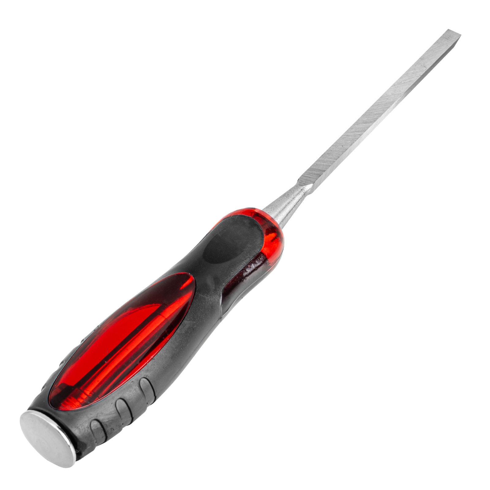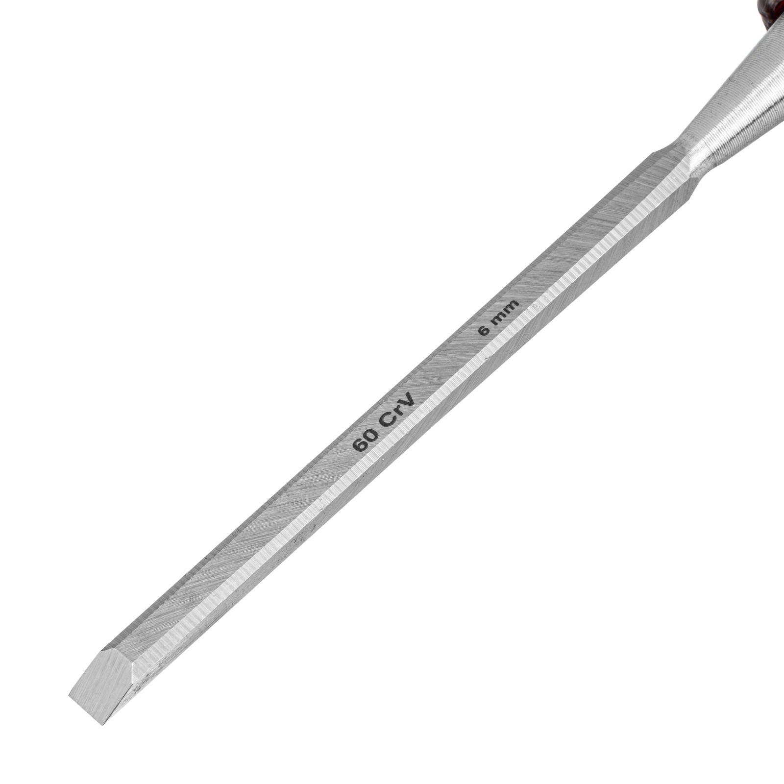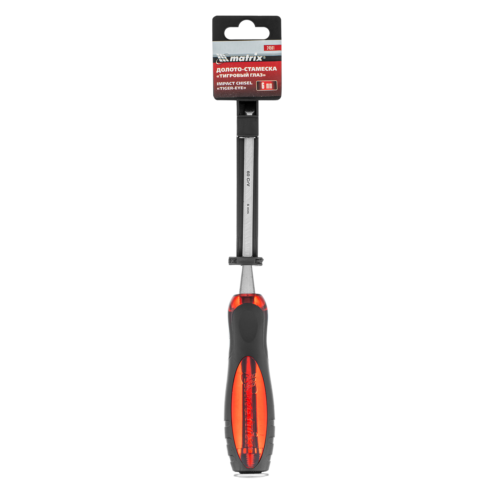 Долото-стамеска Matrix «Тигровый глаз» 24501 с полотном шириной 6 мм и двухкомпонентной обрезиненной рукояткой используется в столярном и плотницком деле, в производстве мебели. Позволяет вырезать углубления, формировать пазы, зачищать шипы и гнезда, снимать фаски. Инструмент выдерживает удары киянкой или молотком, т. к. металлический затыльник защищает его от деформации. Долото относится к профессиональному ручному инструменту, но может применяться и в домашних условиях.