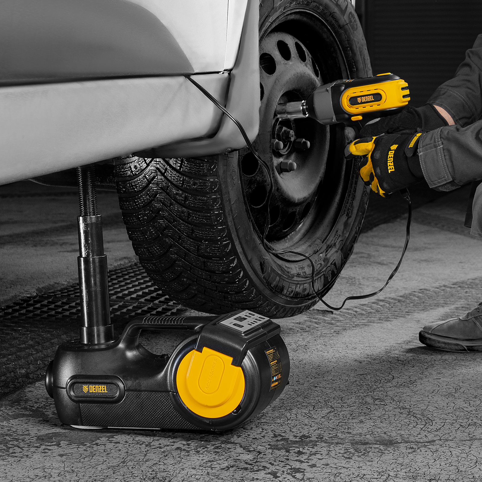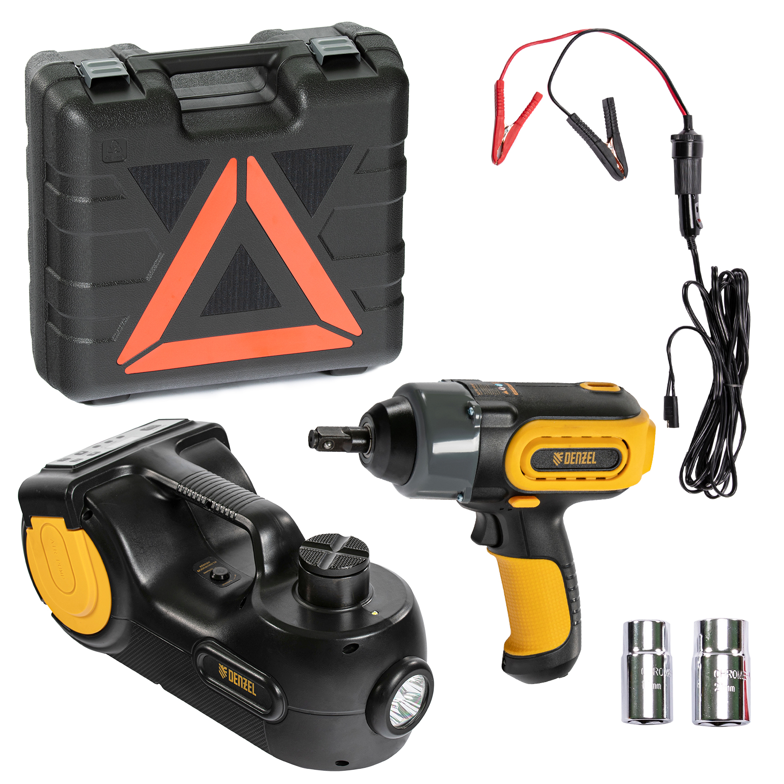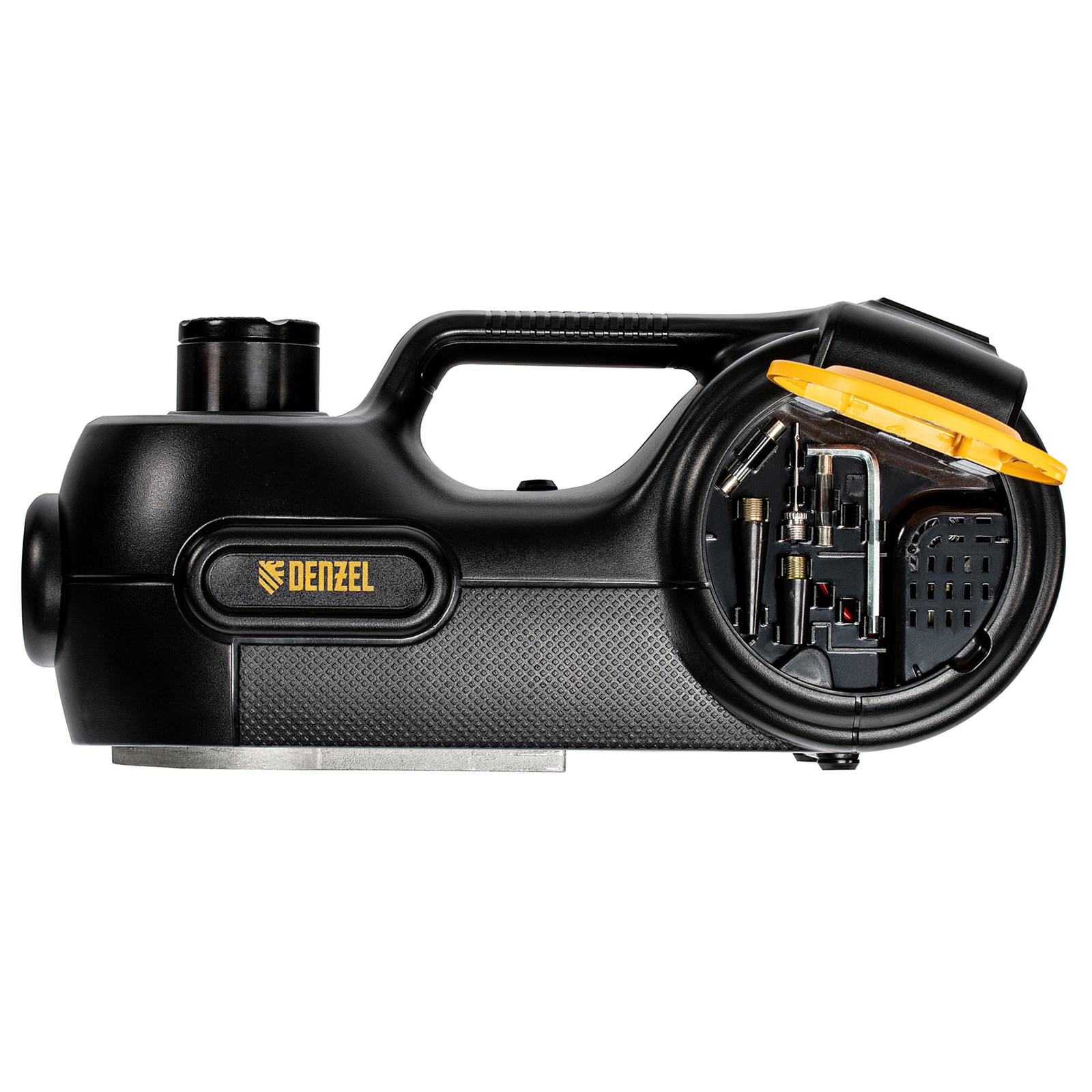 Электрогидравлический домкрат «3 в 1» Denzel 51190 в наборе с электрическим гайковертом работает от сети 12 В и представляет собой устройство для подъема грузов массой до 1,5 т на высоту 155-455 мм. Встроенный компрессор производительностью 35 л/мин служит для подкачки шин, мячей, матрацев и других резиновых изделий. Гайковерт с переключателем направления вращения позволяет откручивать и закручивать резьбовой крепеж во время замены колес. Набор будет полезен в гараже, автомастерской, также пригодится водителям в поездке.