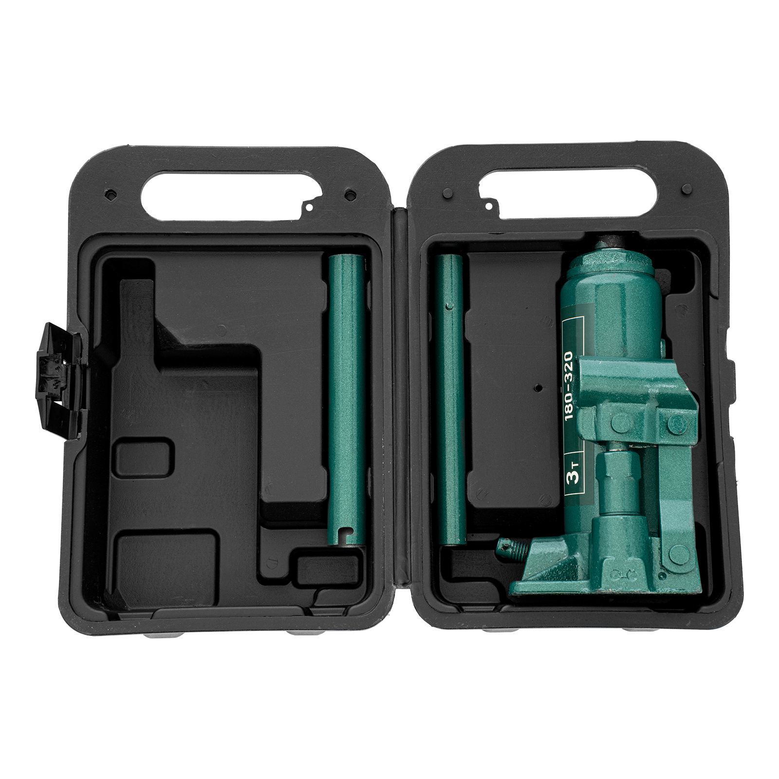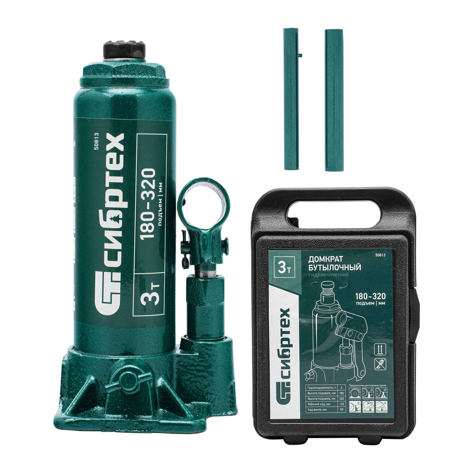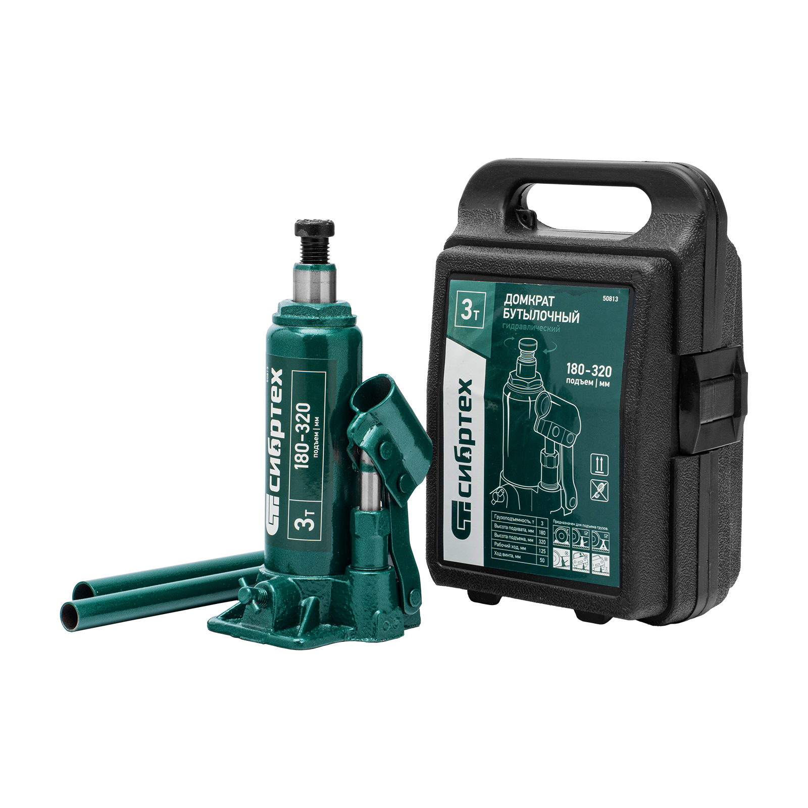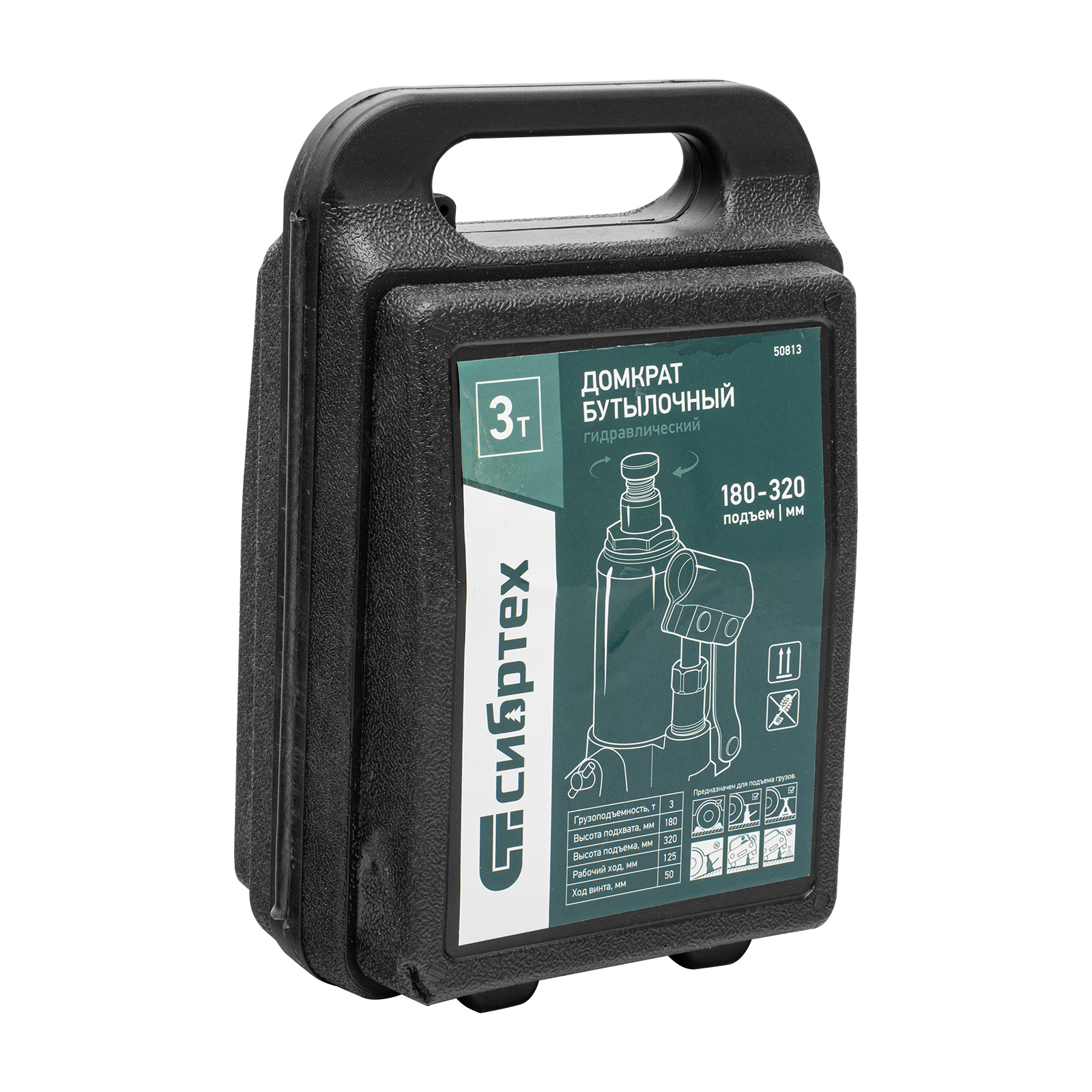 Домкрат гидравлический бутылочный Сибртех 50813, поставляющийся в пластиковом кейсе, предназначен для подъема грузов массой до 3 т на высоту от 180 до 320 мм. Не требует больших усилий от пользователя и значительно облегчает рабочий процесс. Домкрат будет полезен при проведении техобслуживания машины в автосервисе или гараже.