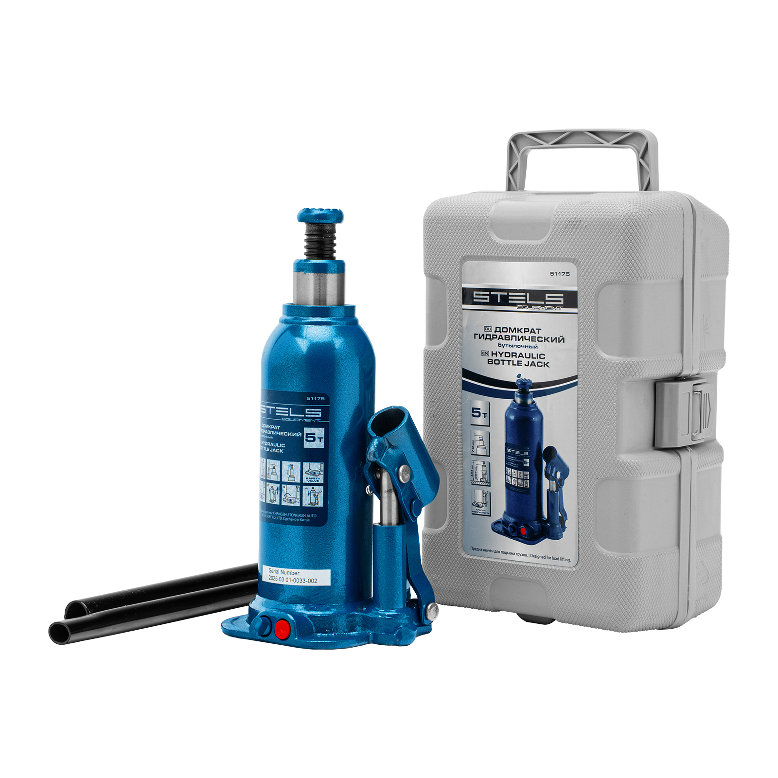 Гидравлический бутылочный домкрат Stels 51175 в пластиковом кейсе предназначен для поднятия грузов весом до 5 т на высоту 207-404 мм. Он не занимает много места и легко помещается в багажник, поэтому его можно брать с собой в дорогу или хранить в гараже. Используется для самостоятельного ремонта авто, также подходит для профессионального применения на станциях технического обслуживания.