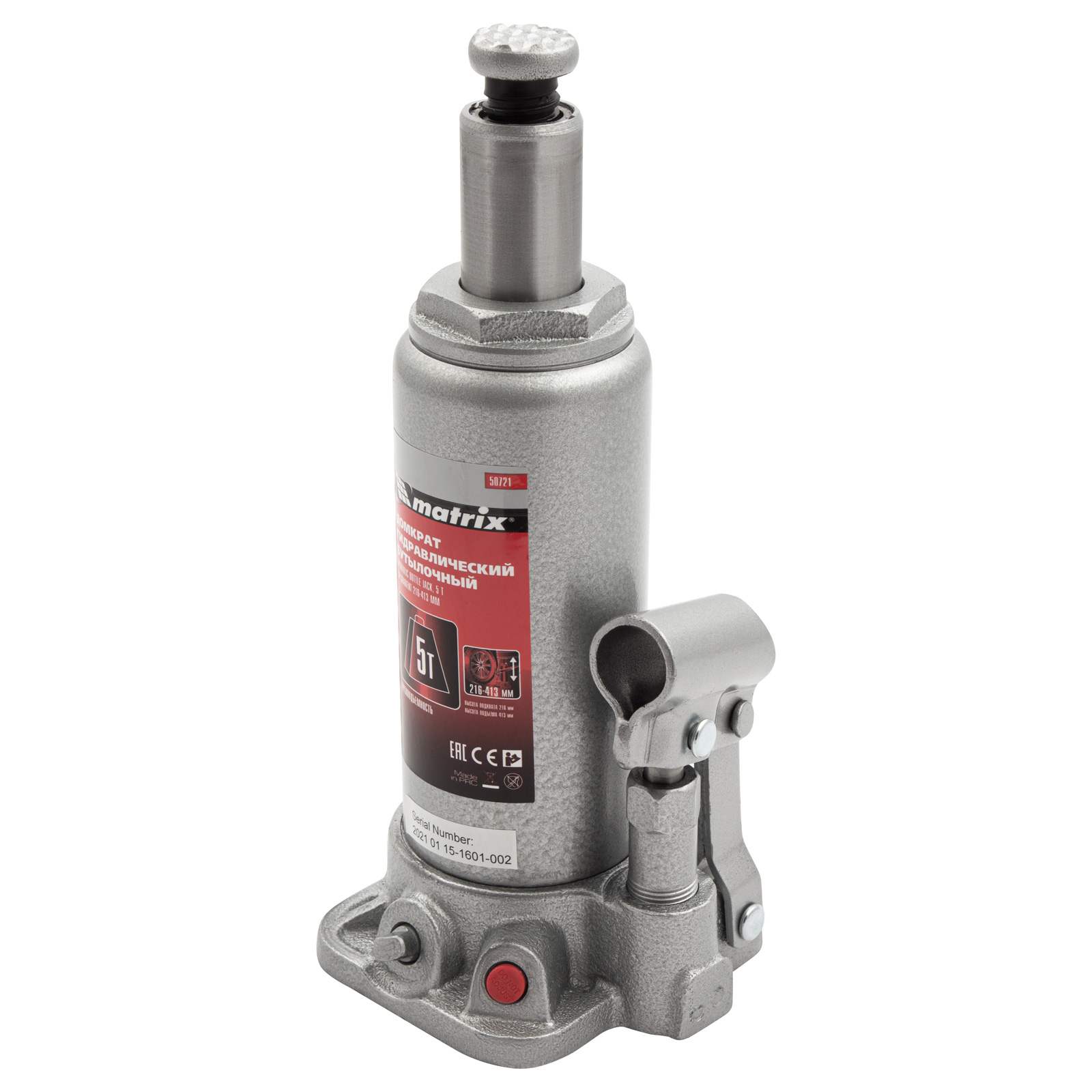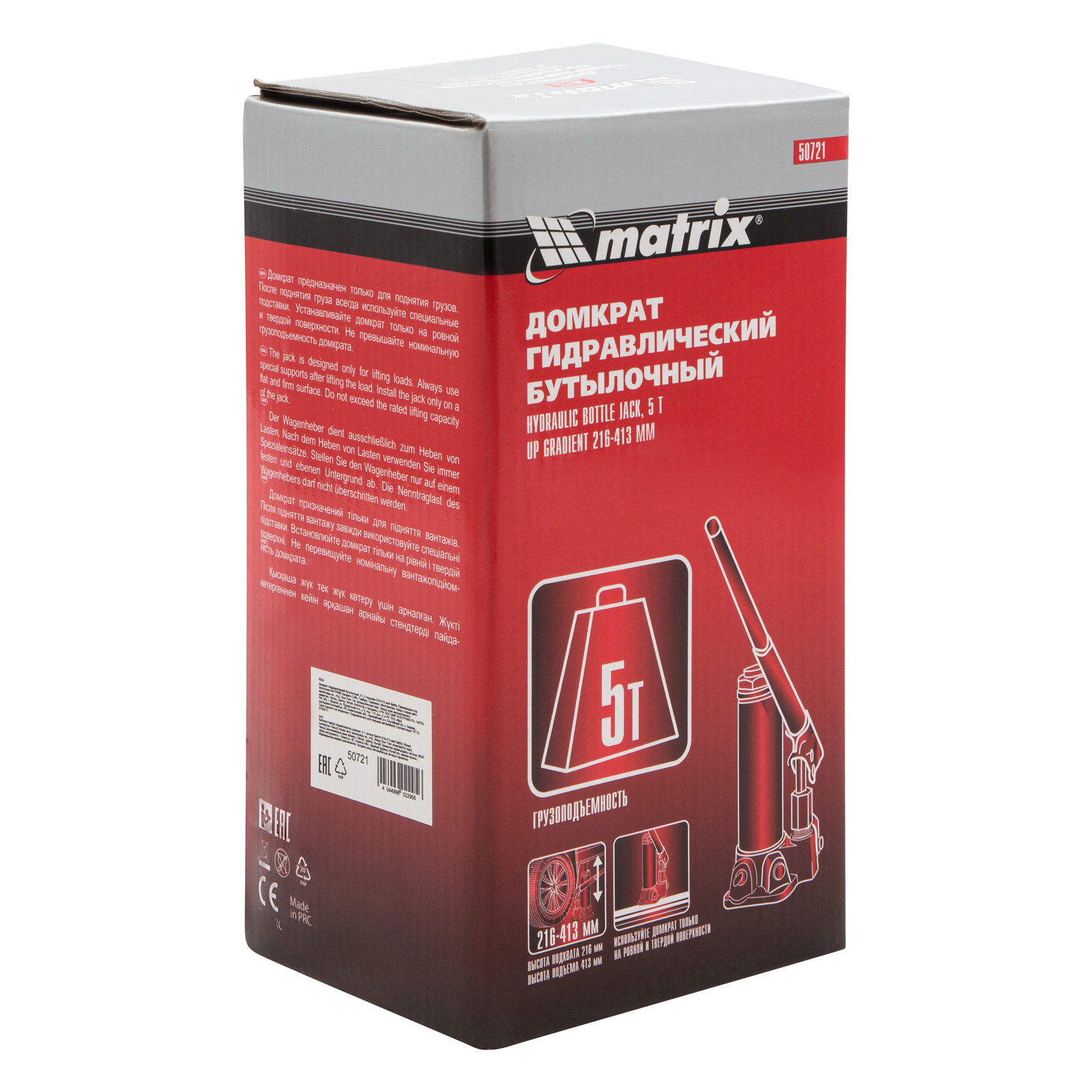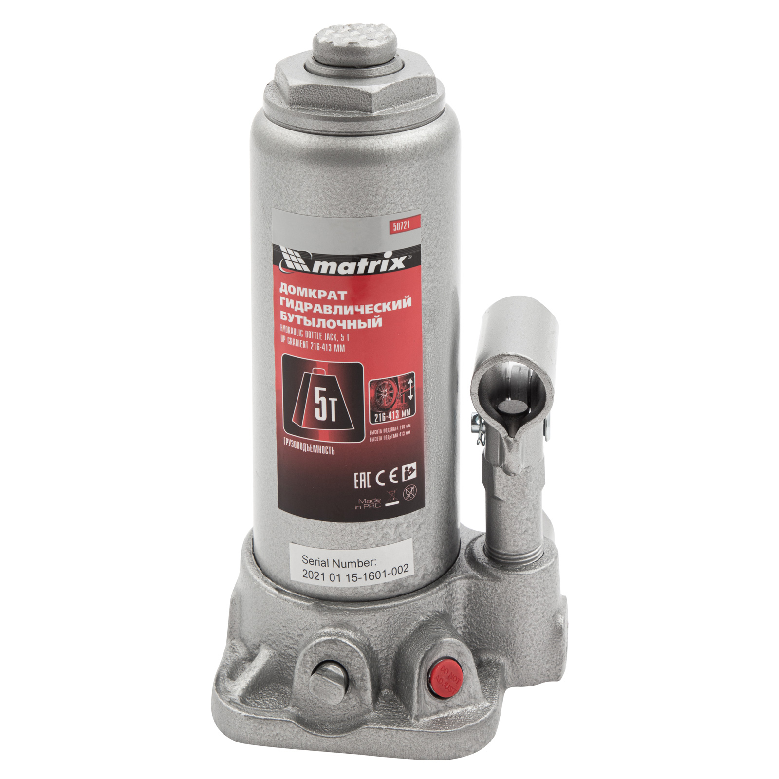 Домкрат гидравлический бутылочный Matrix 50721 используется для поднятия грузов массой до 5 т на высоту 216-413 мм. Подходит для автомобилей с высоким клиренсом. Домкрат будет полезен автолюбителям в гараже и дороге, а также сотрудникам СТО.