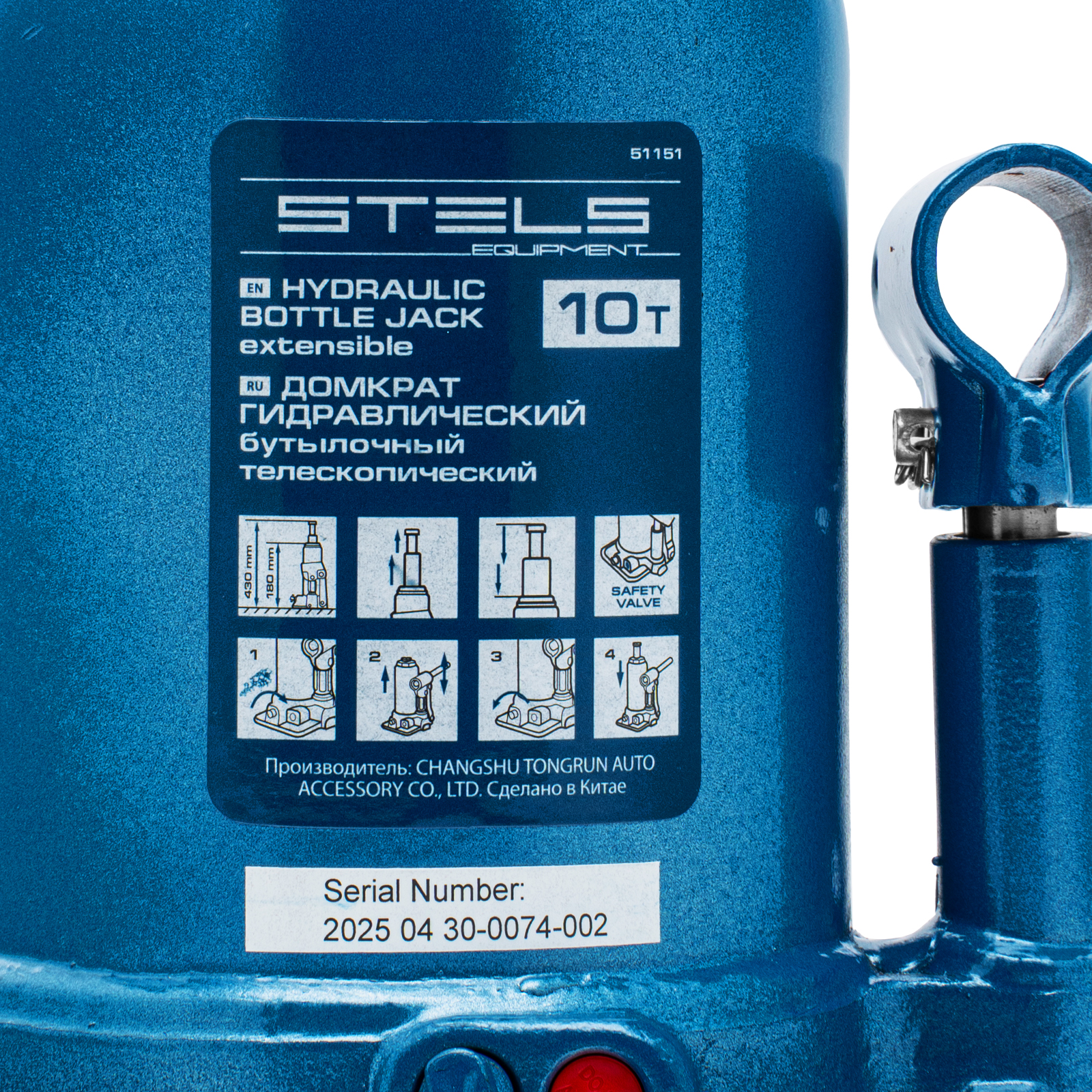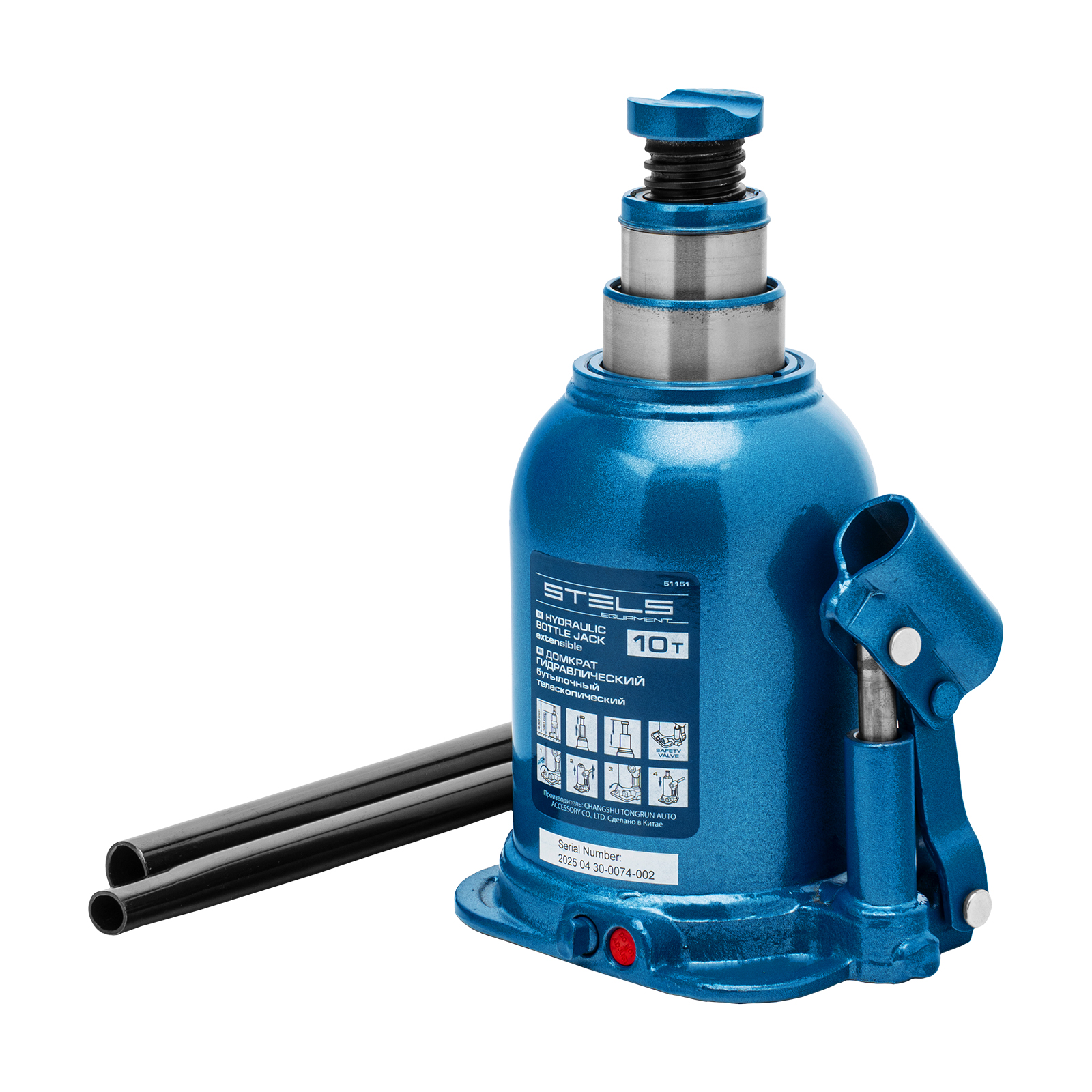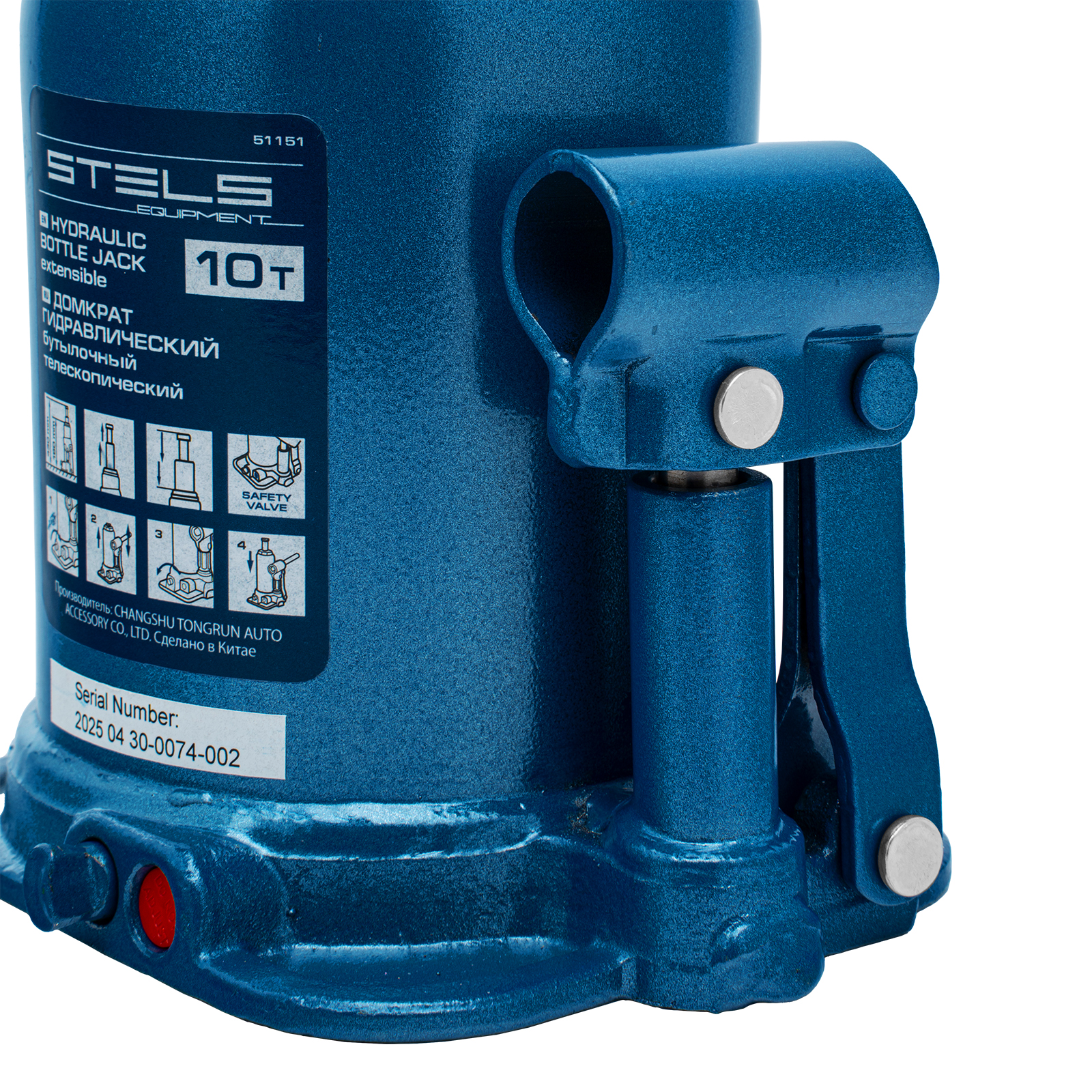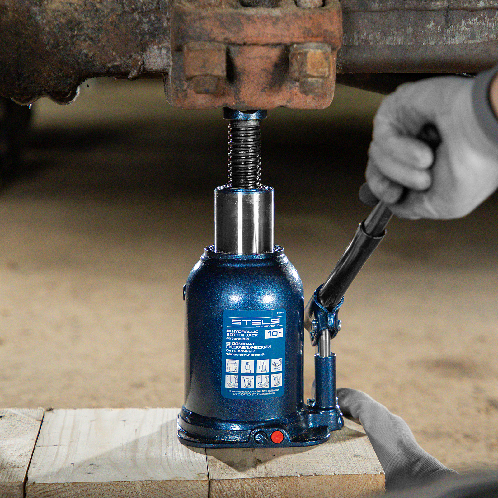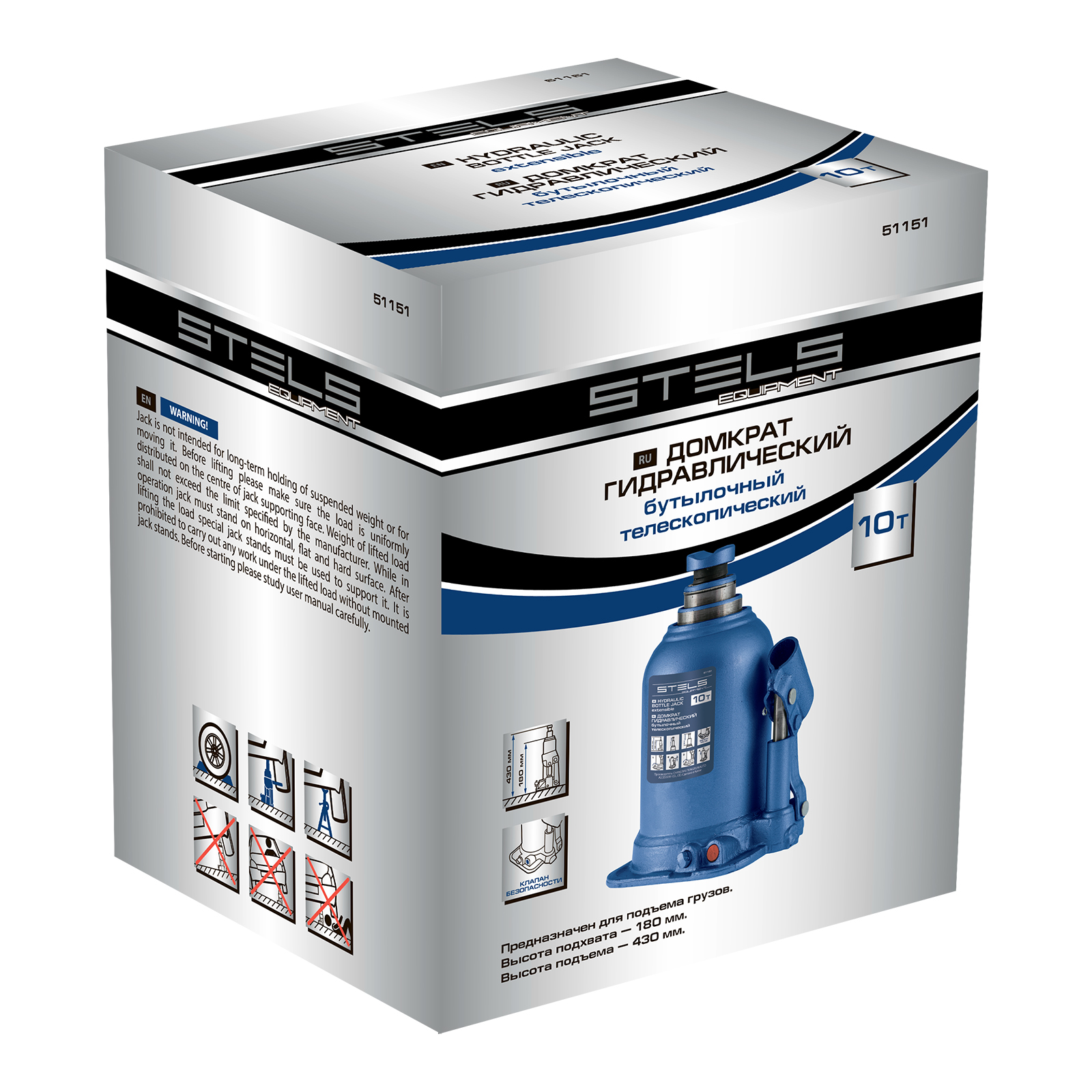 Домкрат гидравлический бутылочный Stels 51151, телескопический, используется для поднятия грузов весом до 10 т с на высоту 180-430 мм. Не требует больших усилий и оптимален для автомобилей с большим клиренсом. Домкрат можно использовать в гараже для самостоятельного ремонта машины или в автосервисе для решения профессиональных задач.