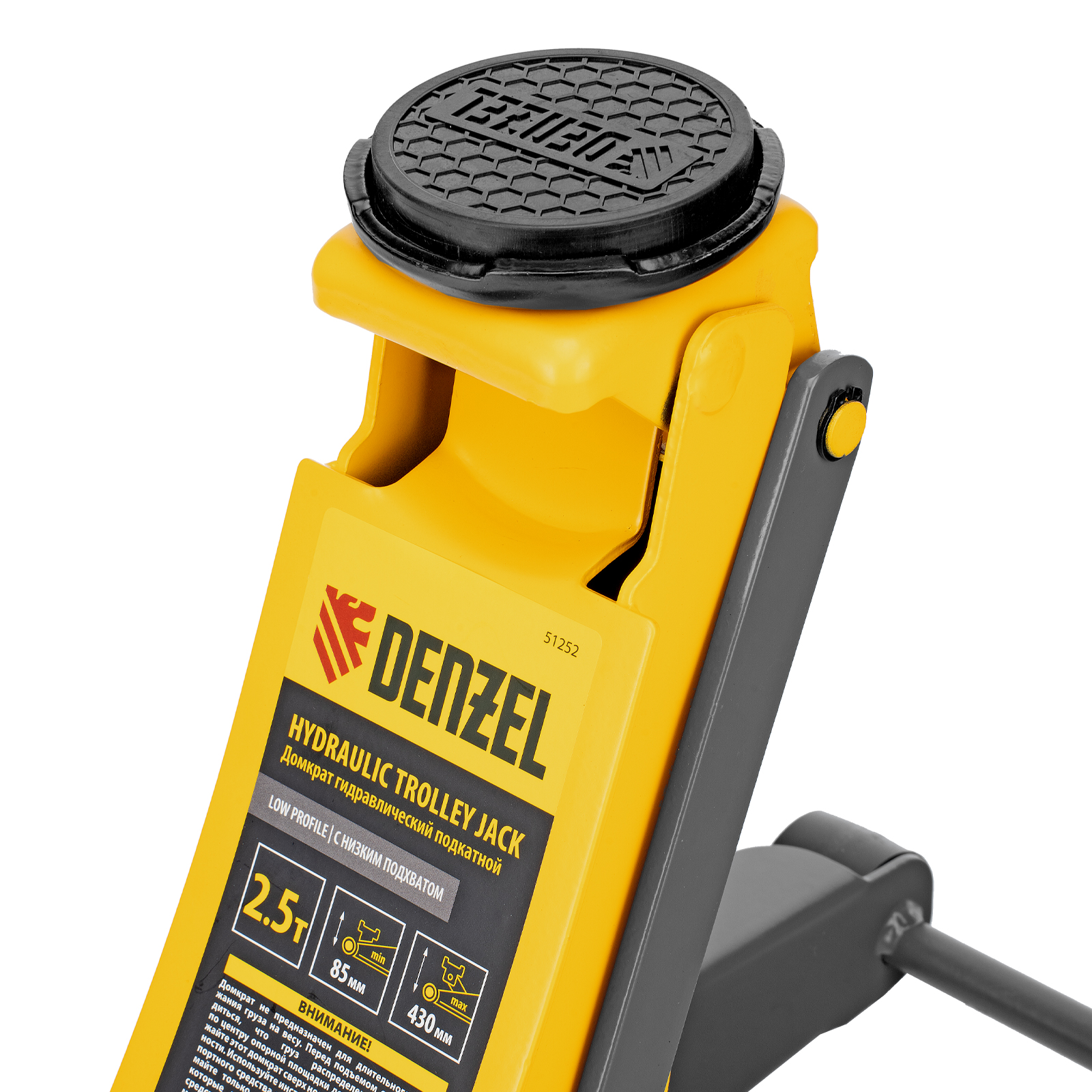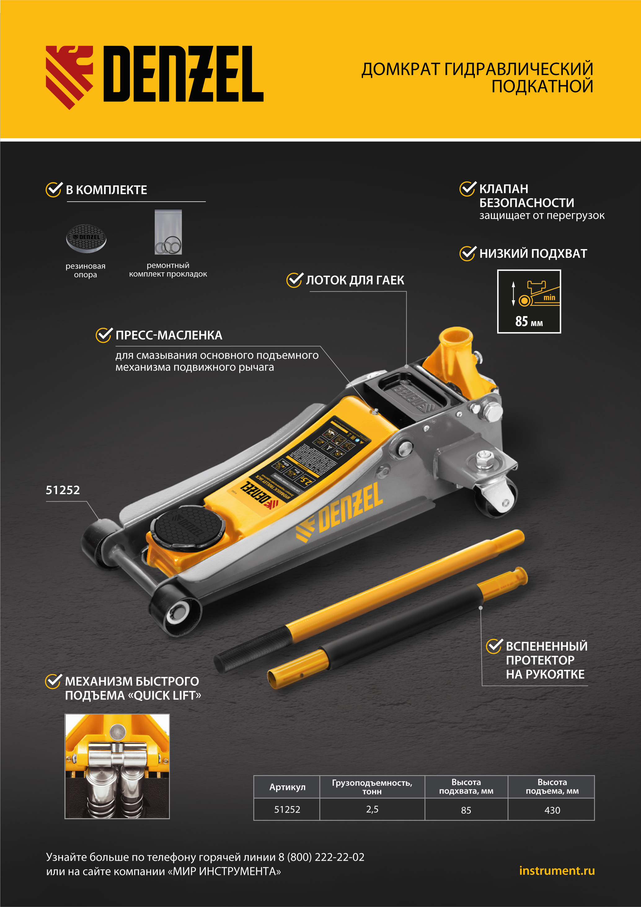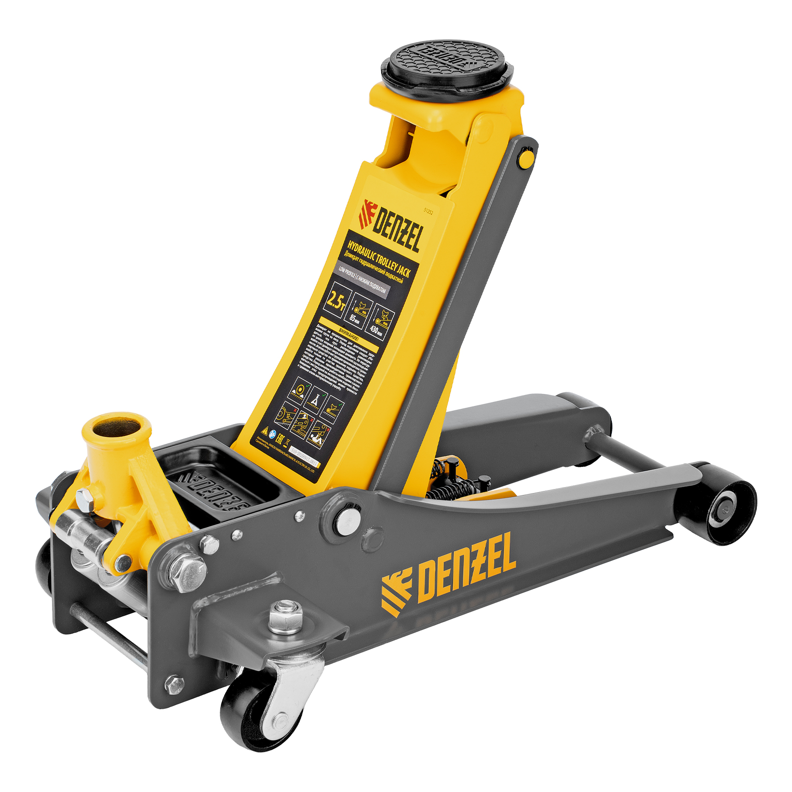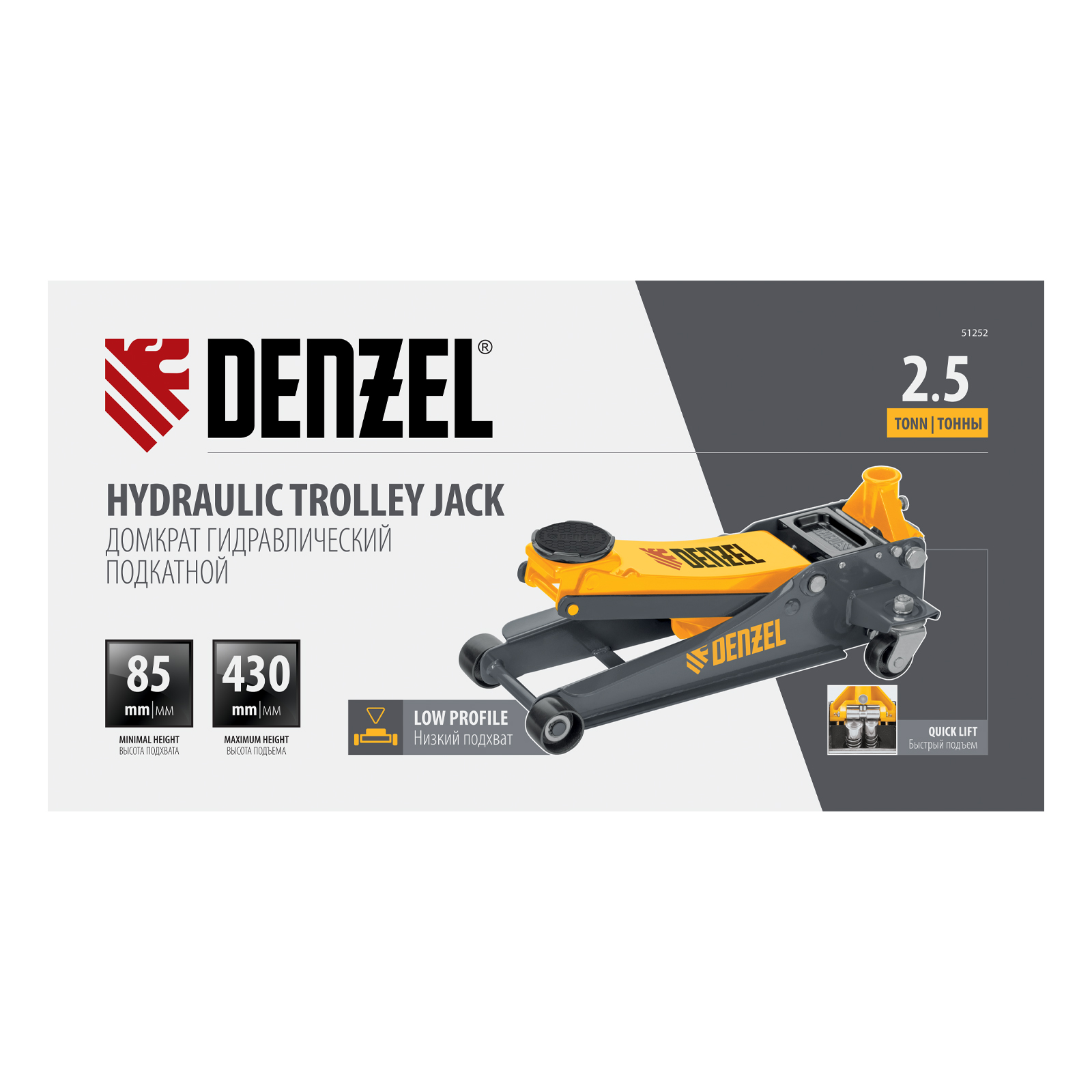 Профессиональный подкатной гидравлический домкрат Denzel 51252 с низким подхватом используется для быстрого подъема на высоту с 85 до 430 мм всех типов автомобилей массой до 2,5 т и с любым клиренсом, в том числе сверхнизким. В гидравлическом блоке предусмотрено 2 насоса (система быстрого подъема QUICK LIFT), благодаря чему для достижения предельной высоты достаточно 6 качков рукоятки. Домкрат подходит для применения на станциях профессионального техобслуживания и шиномонтажа, а также для личного использования.