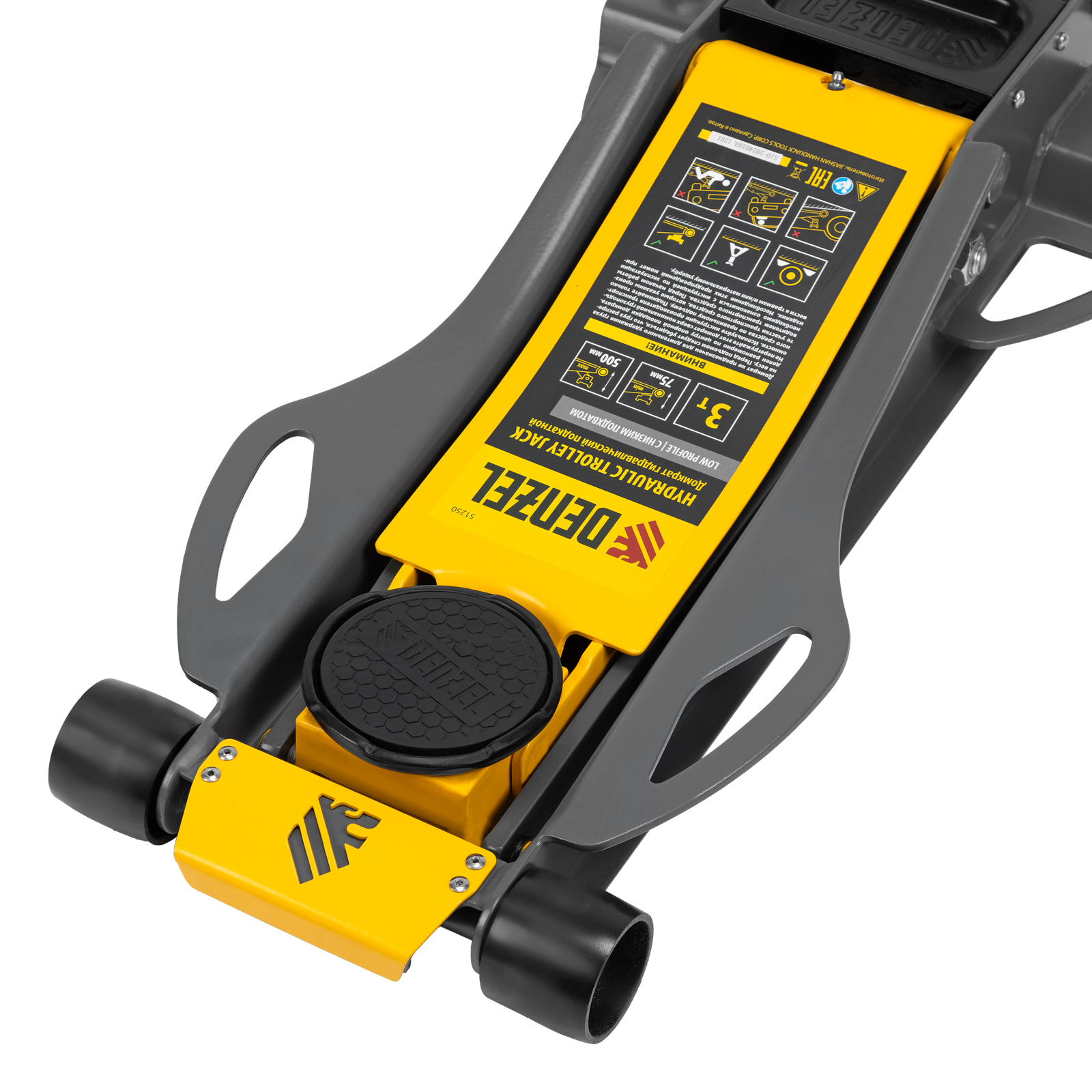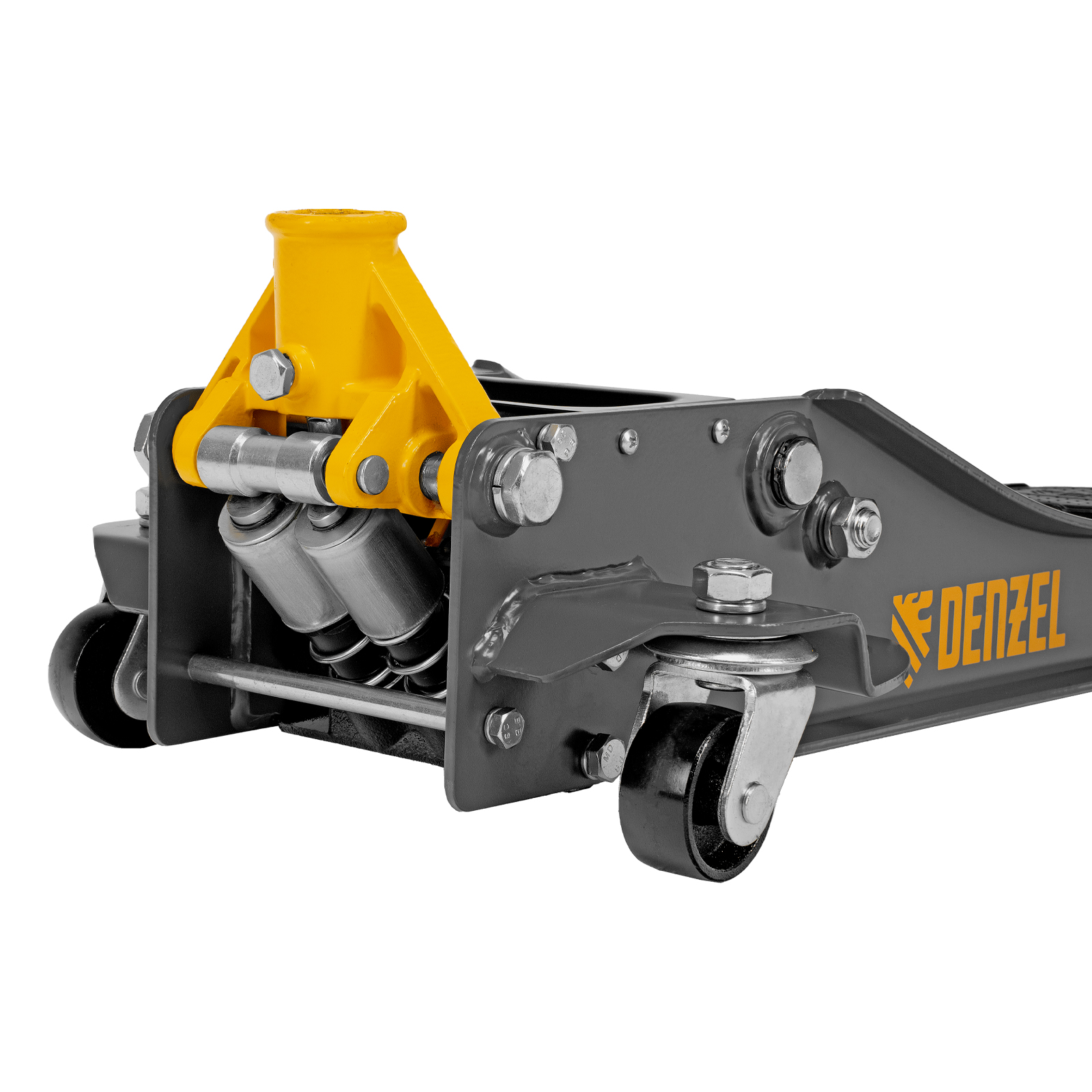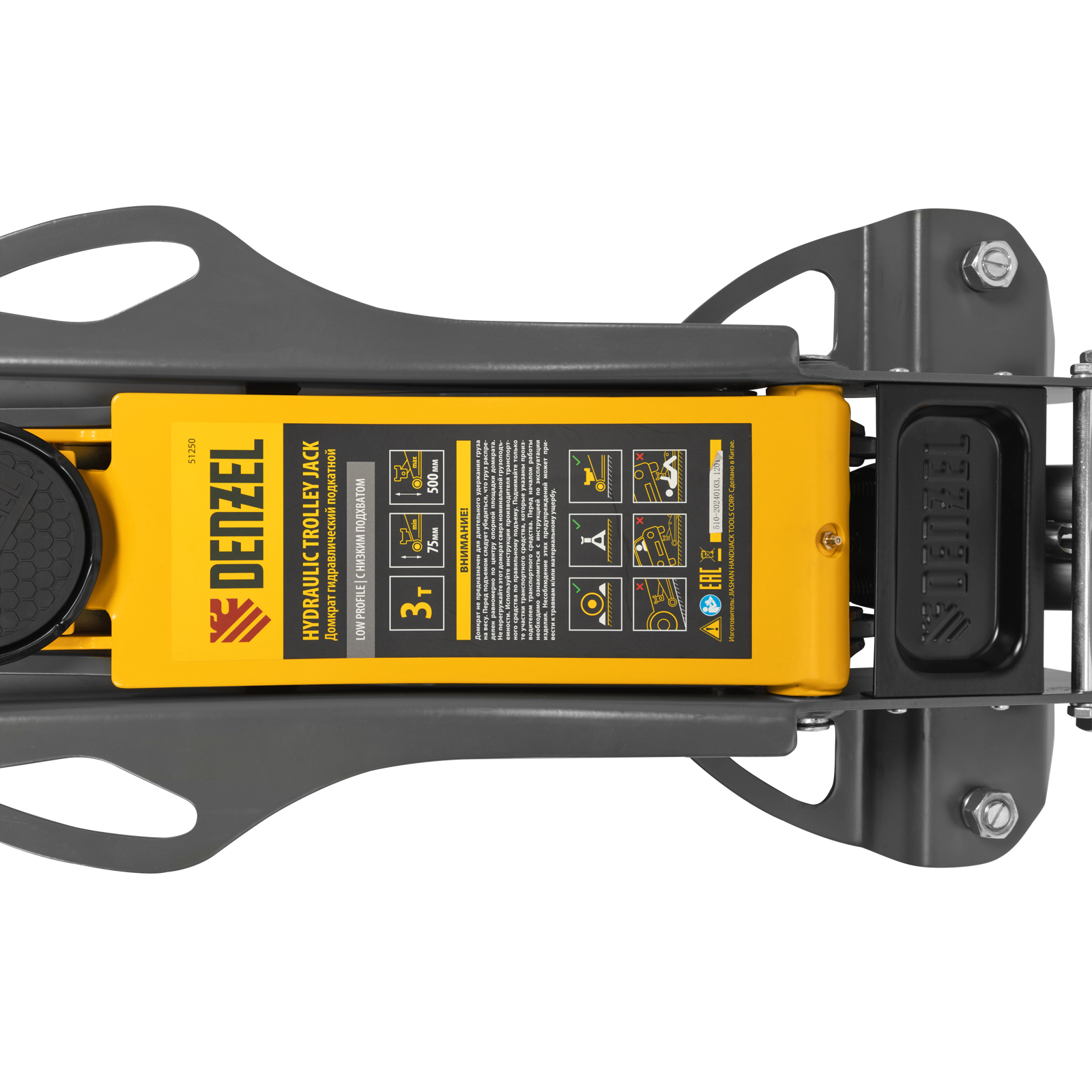 Профессиональный подкатной гидравлический домкрат Denzel 51250 с низким подхватом используется для быстрого подъема на высоту 75-500 мм всех типов автомобилей массой до 3 т и с любым клиренсом, в том числе сверхнизким. В гидравлическом блоке предусмотрено 2 насоса (система быстрого подъема QUICK LIFT), благодаря чему для достижения предельной высоты достаточно 6 качков рукоятки. Домкрат подходит для использования на станциях профессионального техобслуживания и шиномонтажа, а также для личного использования.