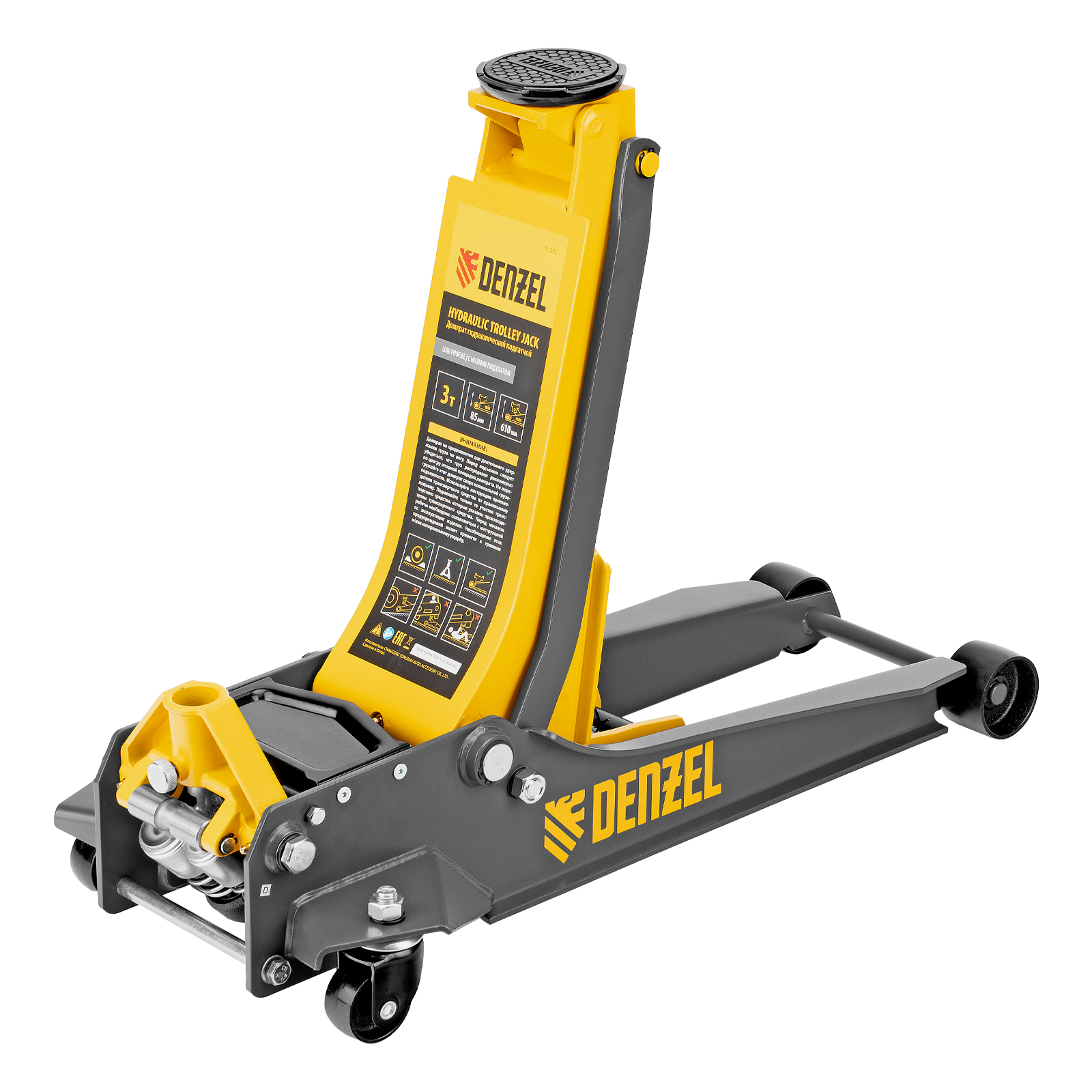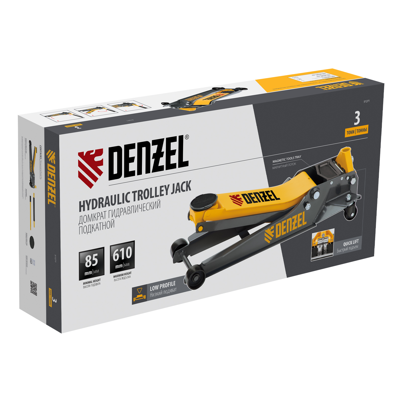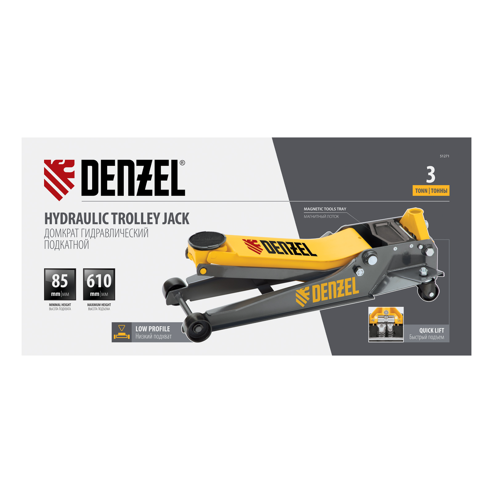 Профессиональный подкатной гидравлический домкрат Denzel 51271 с низким подхватом используется для быстрого подъема на высоту 85-610 мм всех типов автомобилей с любым клиренсом и массой до 3 т, в том числе SUV. В гидравлическом блоке предусмотрено 2 насоса (система быстрого подъема QUICK LIFT), благодаря чему для достижения предельной высоты достаточно 6 качков рукоятки. Домкрат подходит для использования на станциях техобслуживания и шиномонтажа.