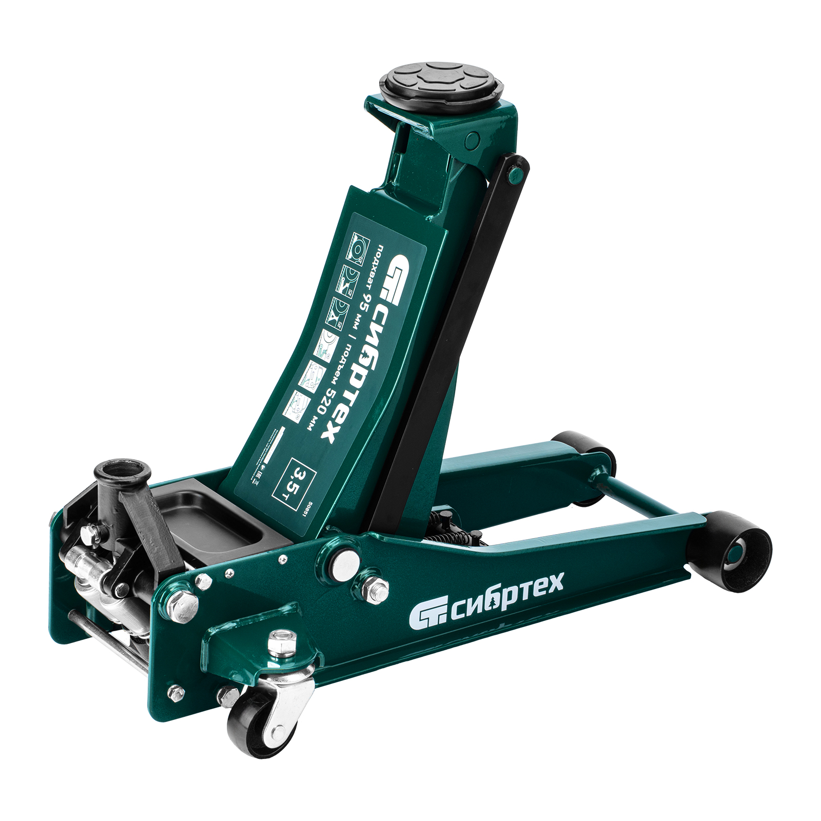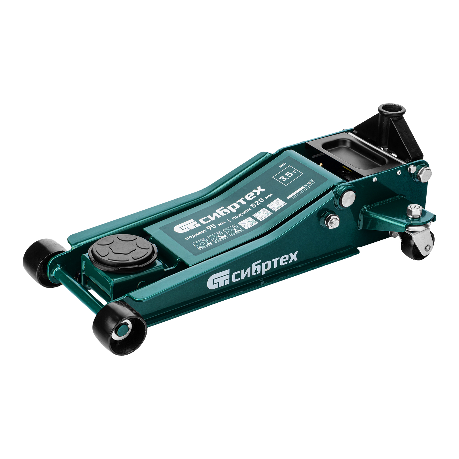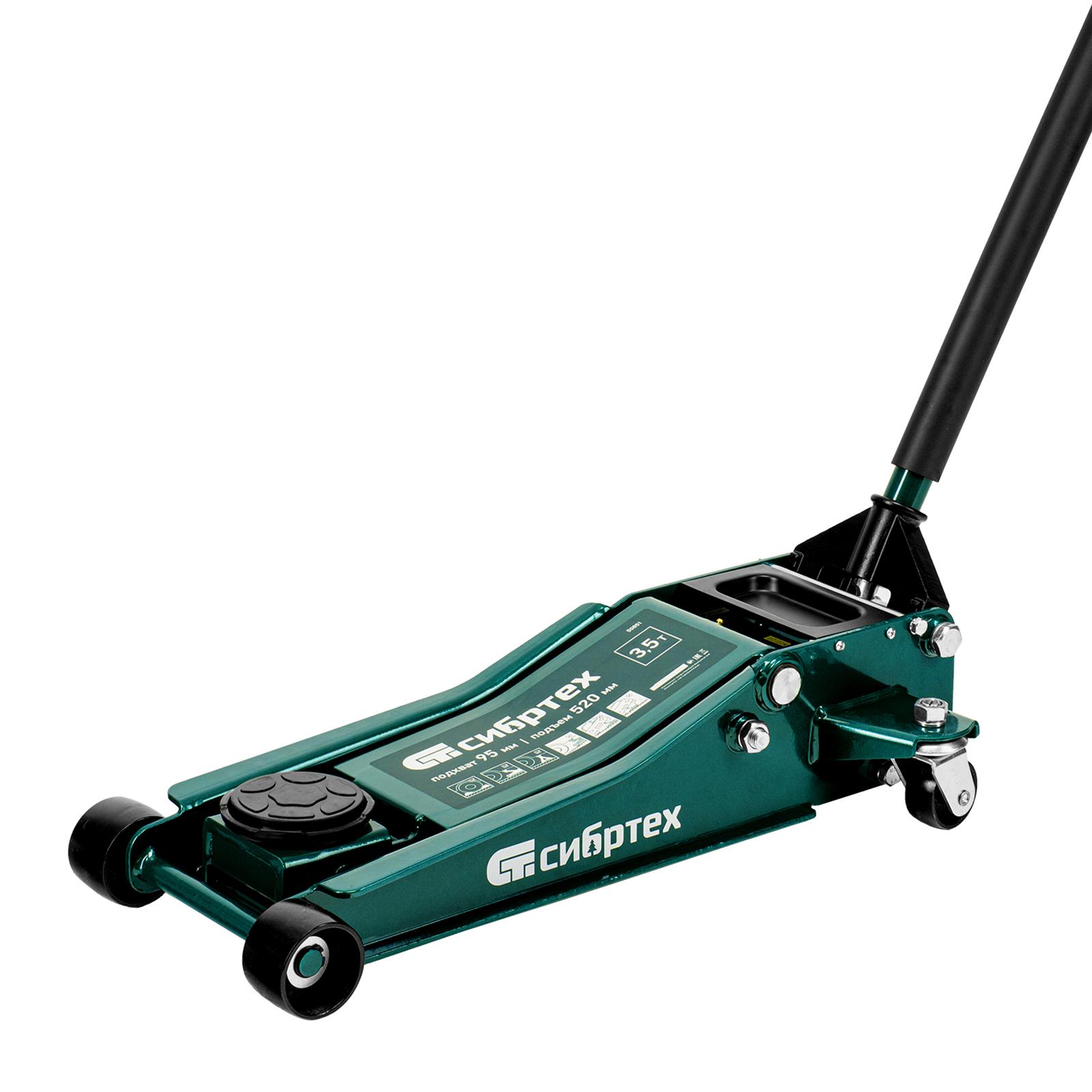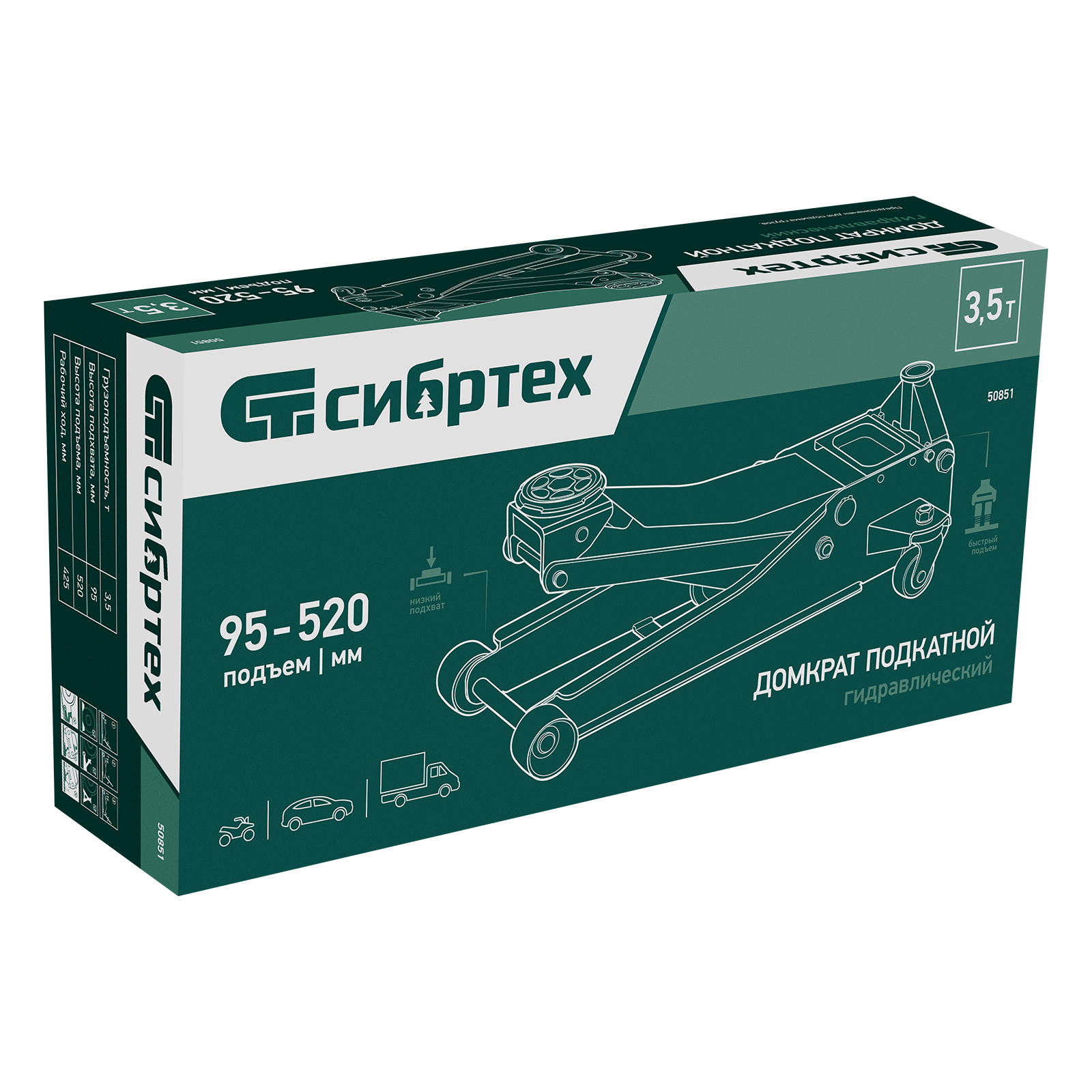 Гидравлический подкатной домкрат Сибртех 50851 с низким подхватом предназначен для быстрого подъема грузов массой 3,5 тонны на высоту с 95 до 520 мм. В гидравлическом блоке предусмотрено 2 насоса (система быстрого подъема QUICK LIFT), благодаря чему для достижения предельной высоты достаточно 6 качков рукоятки. Подходит не только для машин с небольшим клиренсом, но и для автомобилей класса SUV с увеличенным дорожным просветом. Рекомендован для профессионального использования, незаменим на предприятии автосервиса.
