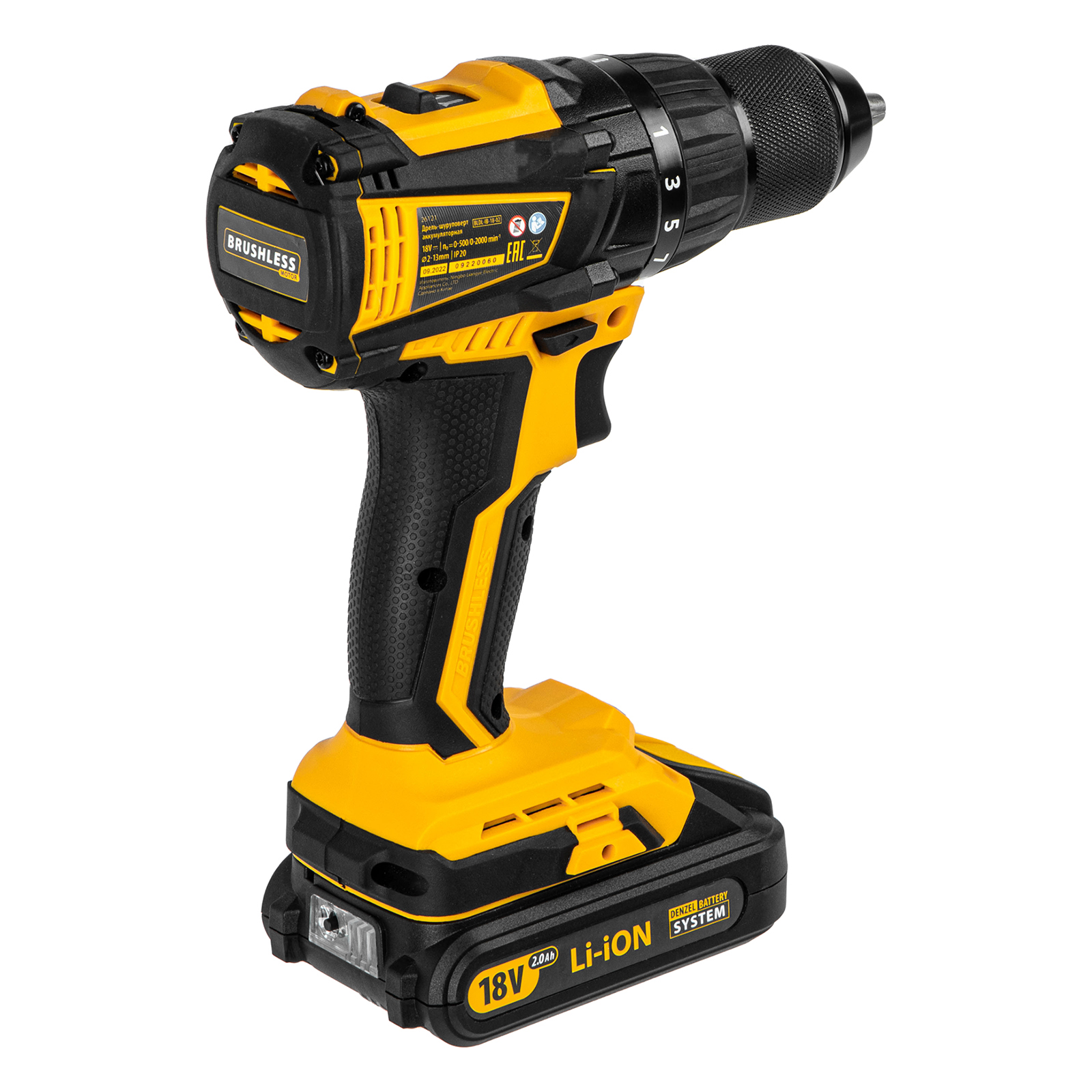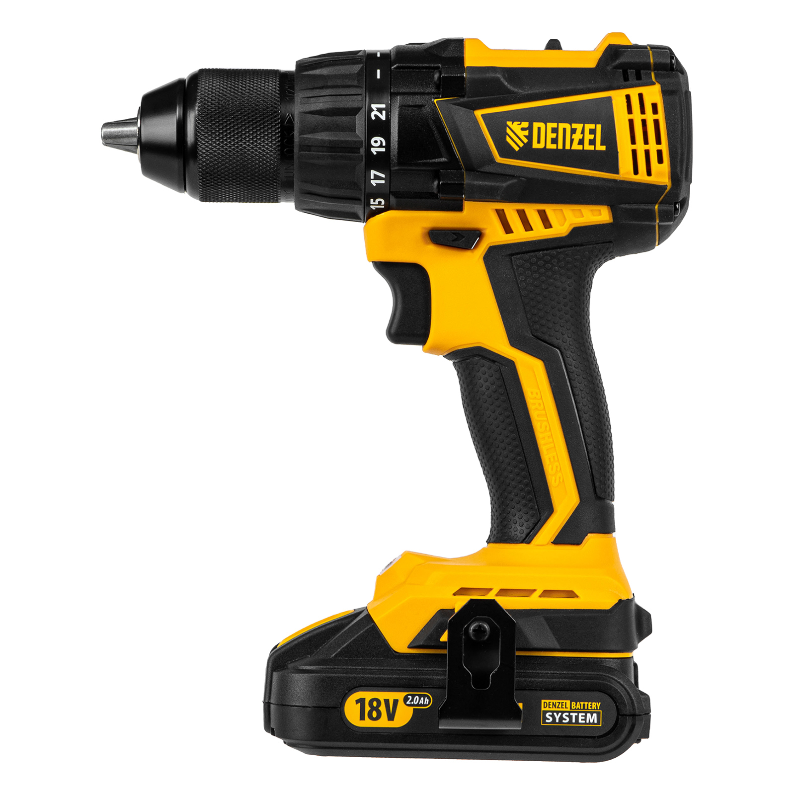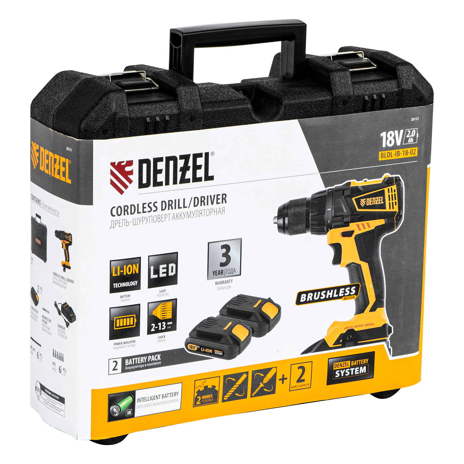 - Универсальность — аккумуляторы 2 Ач Li-ion с интеллектуальной системой распознавания нагрузки совместимы с любым инструментом 18V Denzel battery system.
