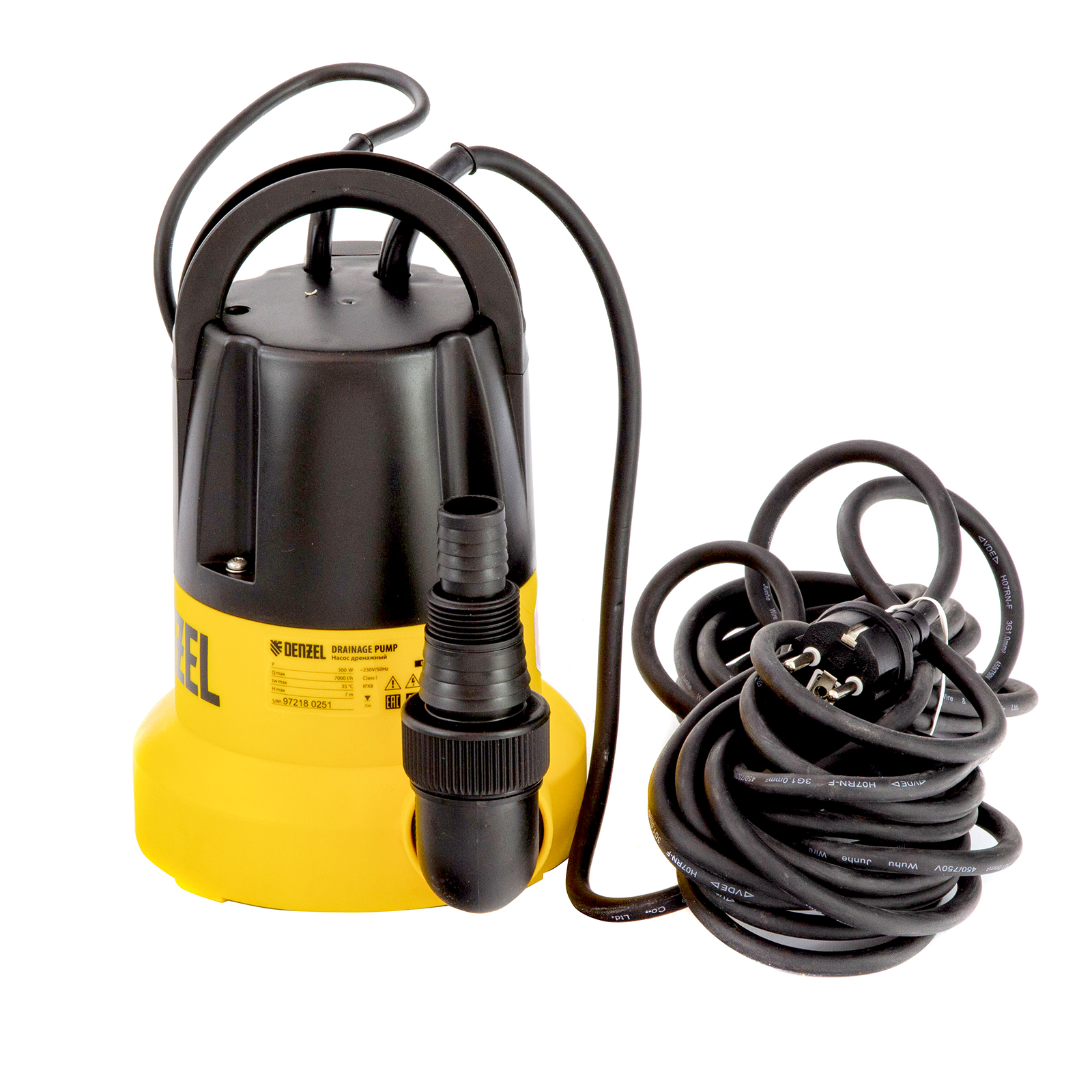 Дренажный насос Denzel DP500E 97218 мощностью 500 Вт обеспечивает высоту подъема 7 м и производительность 7000 л/ч. Используется для подачи чистой воды из колодцев и организации систем полива.