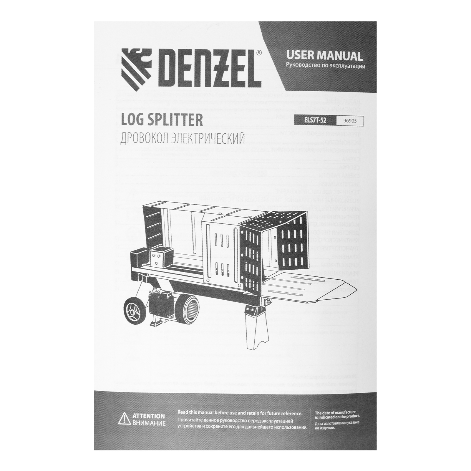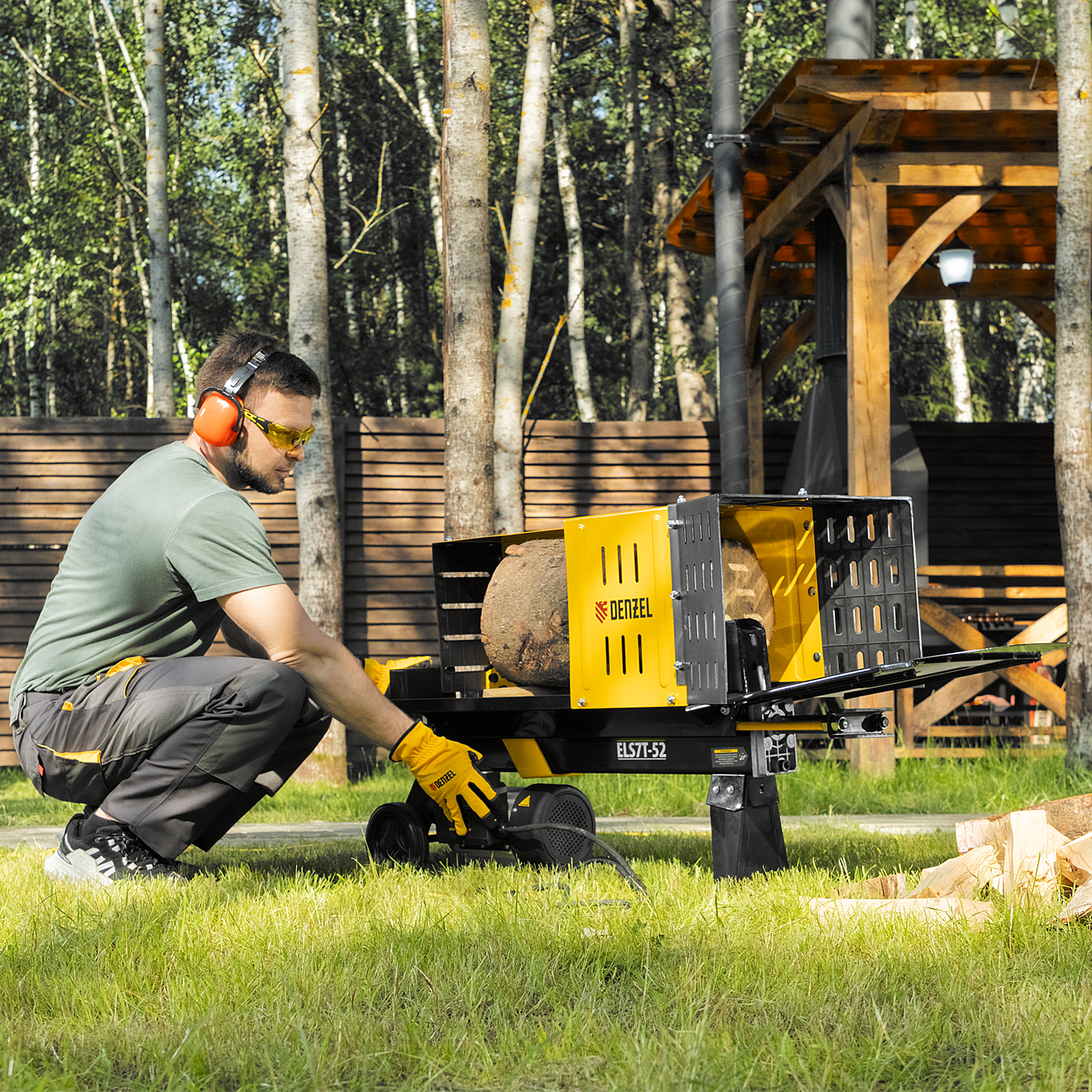 Дровокол электрический ELS7T-52, 2300 Вт, сила раскола 7т, макс. размеры полена D250 x 520 мм Denzel