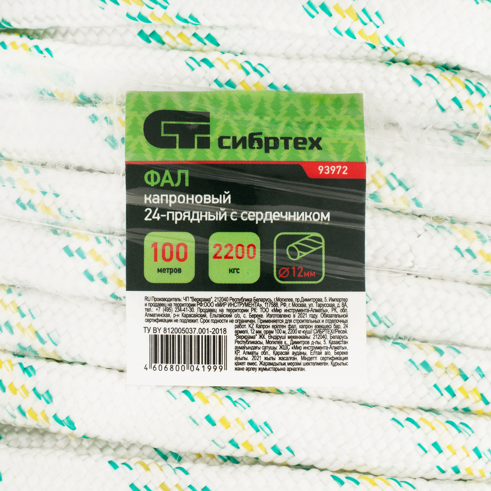 <p>Плетеный капроновый фал Сибртех 93972 с сердечником, 24-прядный, длиной 100 м и диаметром 12 мм, используется для подъема и закрепления грузов, установки различных конструкций. Востребован в сельском хозяйстве, строительстве, нефтяной промышленности, на транспорте, в спорте, рыболовстве. Также применяется в ходе спасательных работ. Шнур имеет полиамидный сердечник, обладает высокой упругостью и выдерживает разрывную нагрузку 2200 кгс.</p><h2>Преимущества</h2><ul><li>Повышенная прочность — фал изготовлен из крученой полиамидной нити.</li><li>Износостойкость — капрон не гниет, устойчив к воздействию микроорганизмов и агрессивных жидкостей.</li><li>Возможность использования при любых погодных условиях — изделие не впитывает влагу, устойчиво к перепадам температур.</li><li>Намотка 100 м — длины фала достаточно для решения поставленных задач.</li></ul>