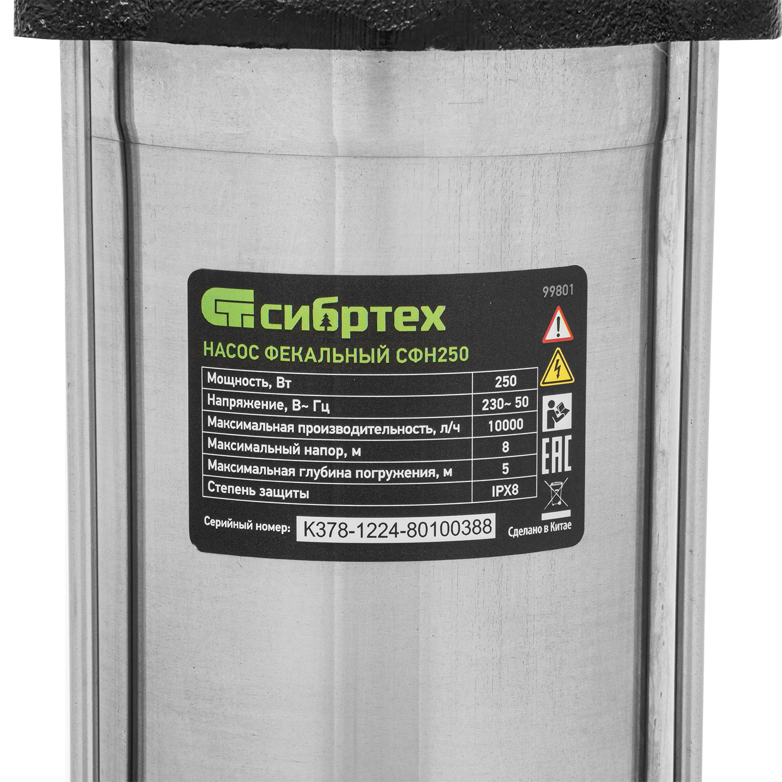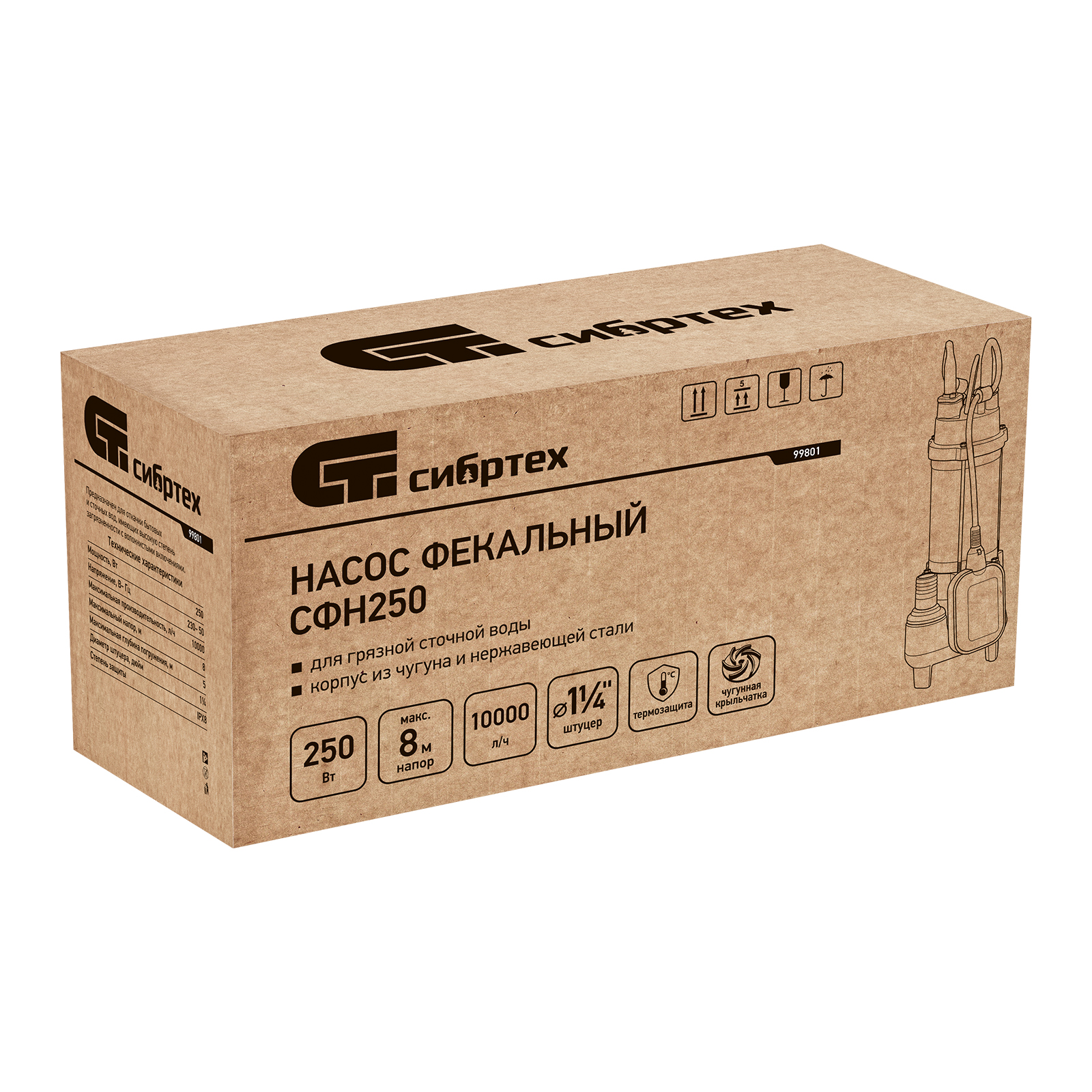 Фекальный насос Сибртех СФН250 99801 обеспечивает напор 8 м, имеет мощность 250 Вт и производительность до 10000 л/ч и применяется для откачки грязной воды из затопленных помещений, нечистот из выгребных ям и канализации. Также его можно использовать для организации принудительной канализационной системы или системы полива на даче. Диаметр штуцера для шланга составляет 1 1/4 дюйма. Насос подходит для работы с холодными стоками, при этом температура перекачиваемой жидкости не должна превышать 35 градусов. Благодаря чугунному импеллеру насос справляется с перекачкой воды, содержащей фракции диаметром до 15 мм.
