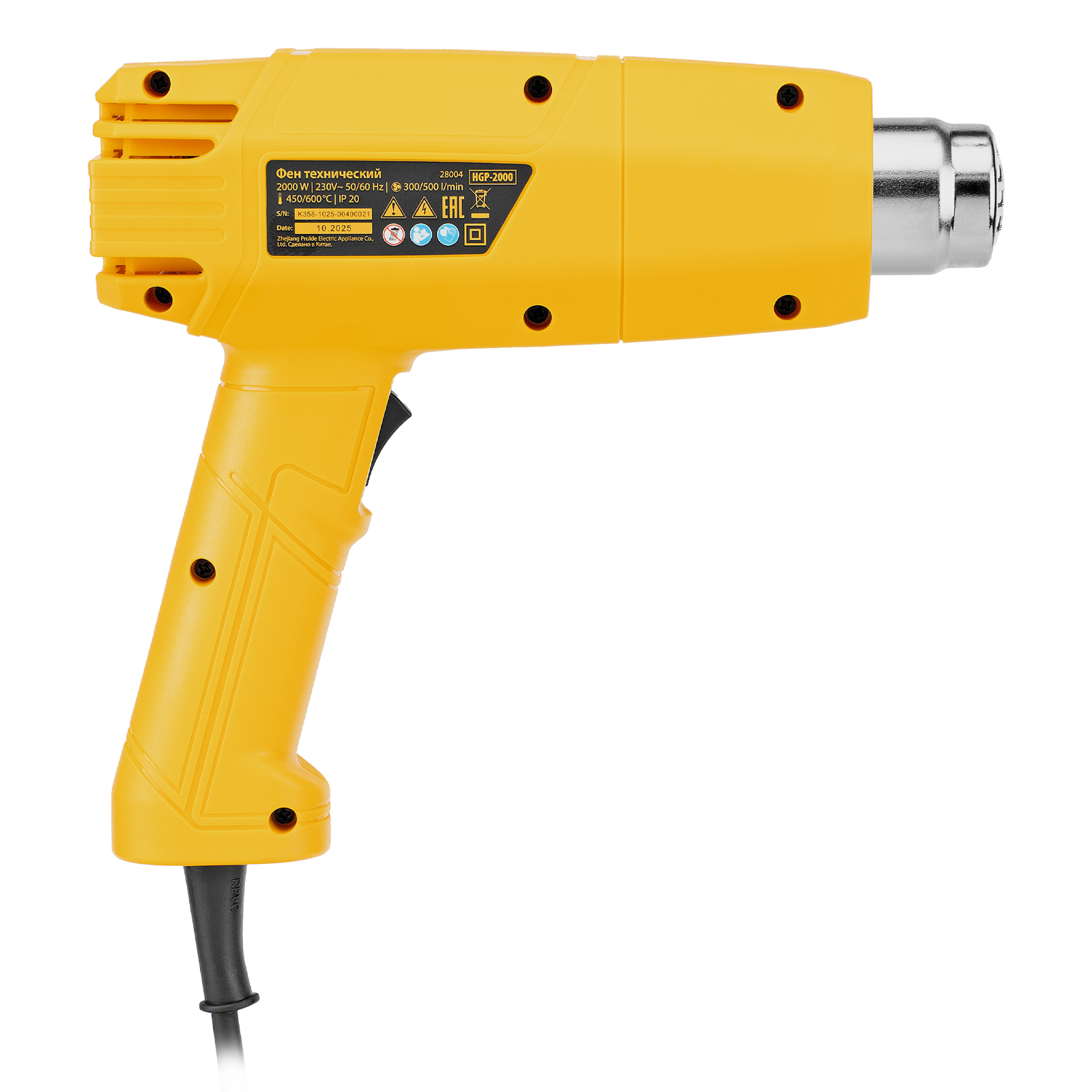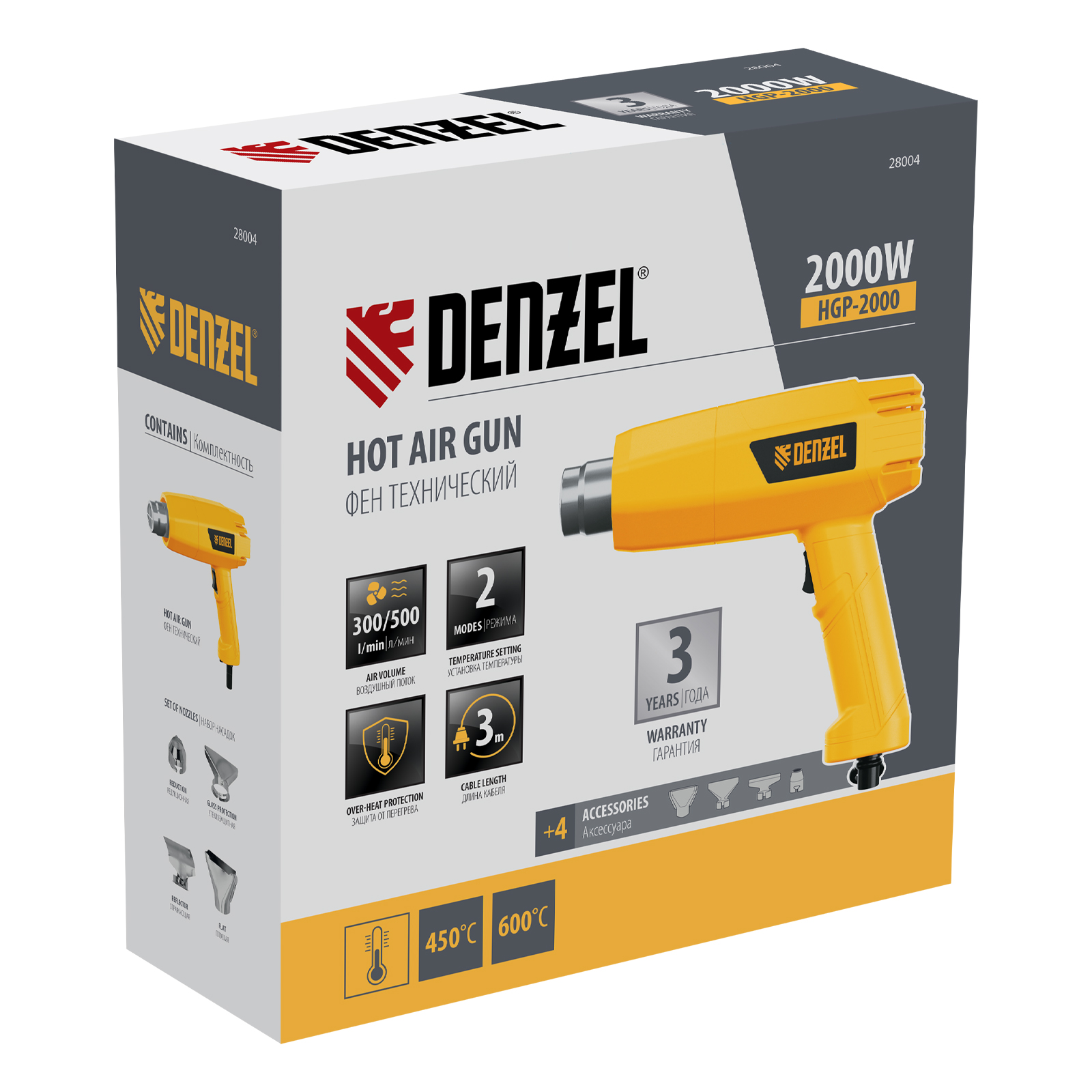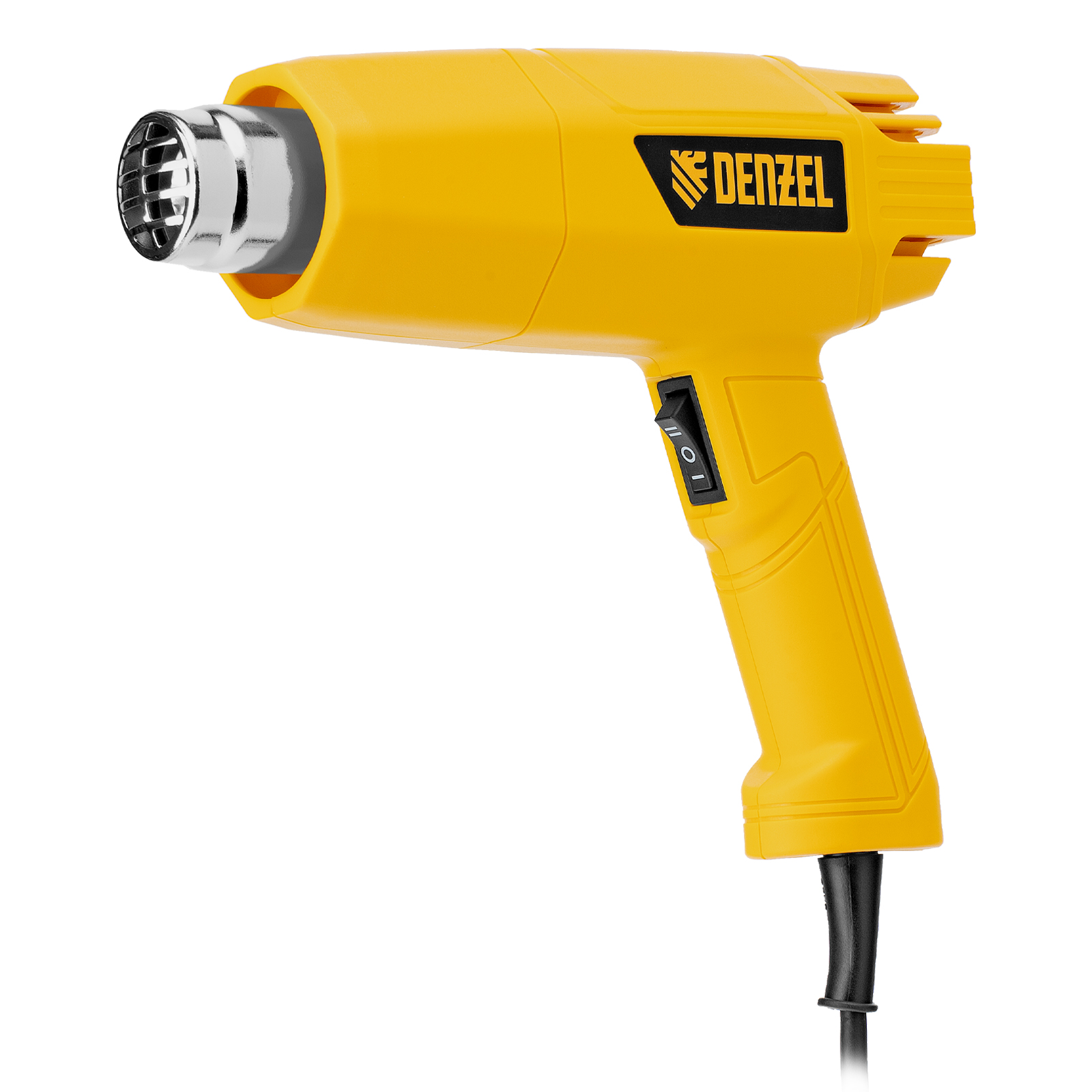 Технический фен Denzel HGP-2000 28004 мощностью 2000 Вт способен работать в двух режимах: подача воздуха объемом 300 л/мин при температуре 450 °C и генерация воздушного потока 500 л/мин при температуре 600 °C. Нужный режим легко устанавливается при помощи переключателя. Инструмент используется для просушивания поверхностей и соединений, сварки пластиковых труб, снятия обоев, линолеума и удаления лакокрасочных покрытий, размораживания труб, установки термоусадочных трубок, а также решения других задач.