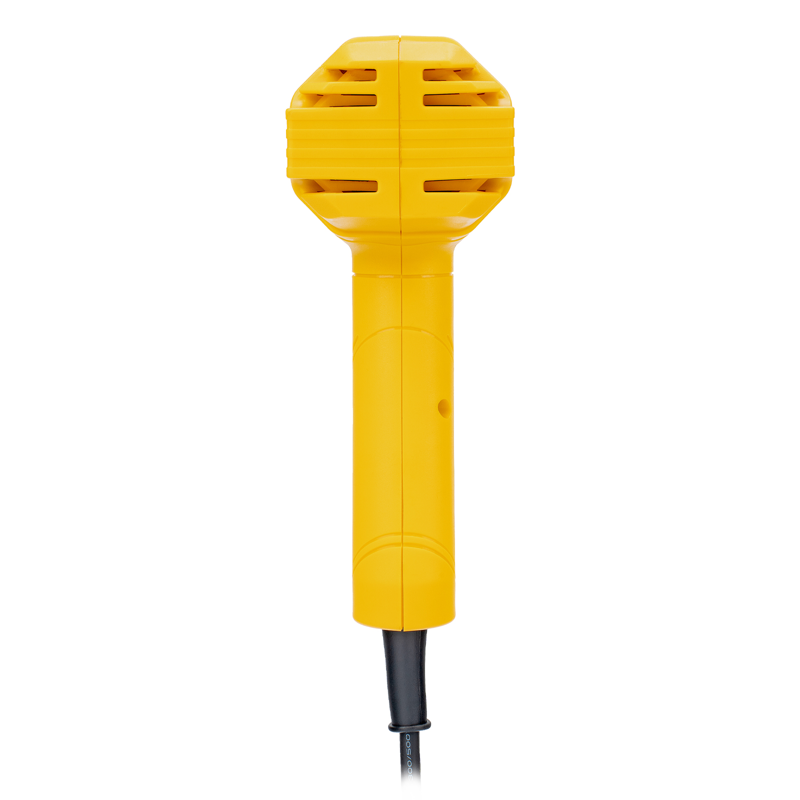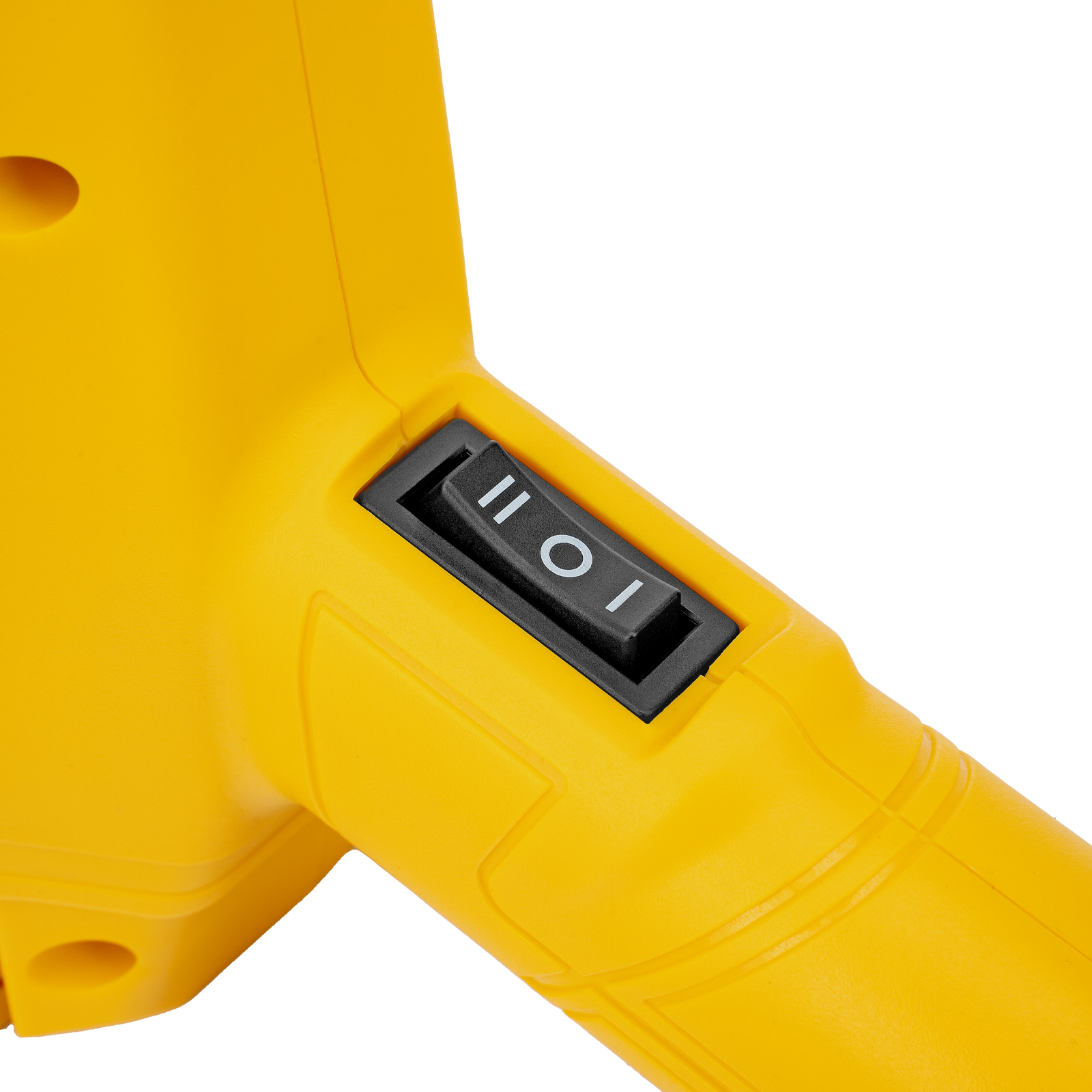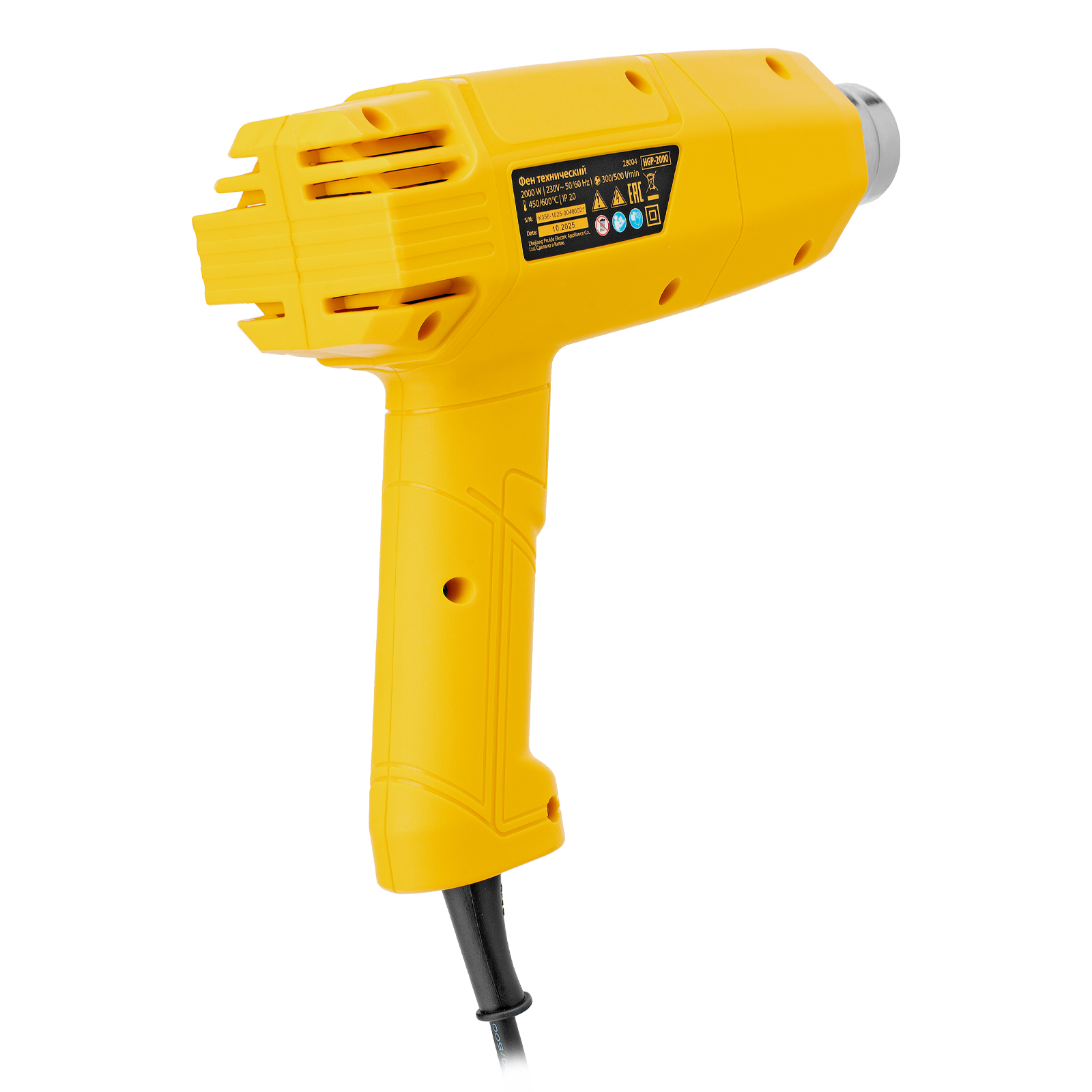 Технический фен Denzel HGP-2000 28004 мощностью 2000 Вт способен работать в двух режимах: подача воздуха объемом 300 л/мин при температуре 450 °C и генерация воздушного потока 500 л/мин при температуре 600 °C. Нужный режим легко устанавливается при помощи переключателя. Инструмент используется для просушивания поверхностей и соединений, сварки пластиковых труб, снятия обоев, линолеума и удаления лакокрасочных покрытий, размораживания труб, установки термоусадочных трубок, а также решения других задач.
