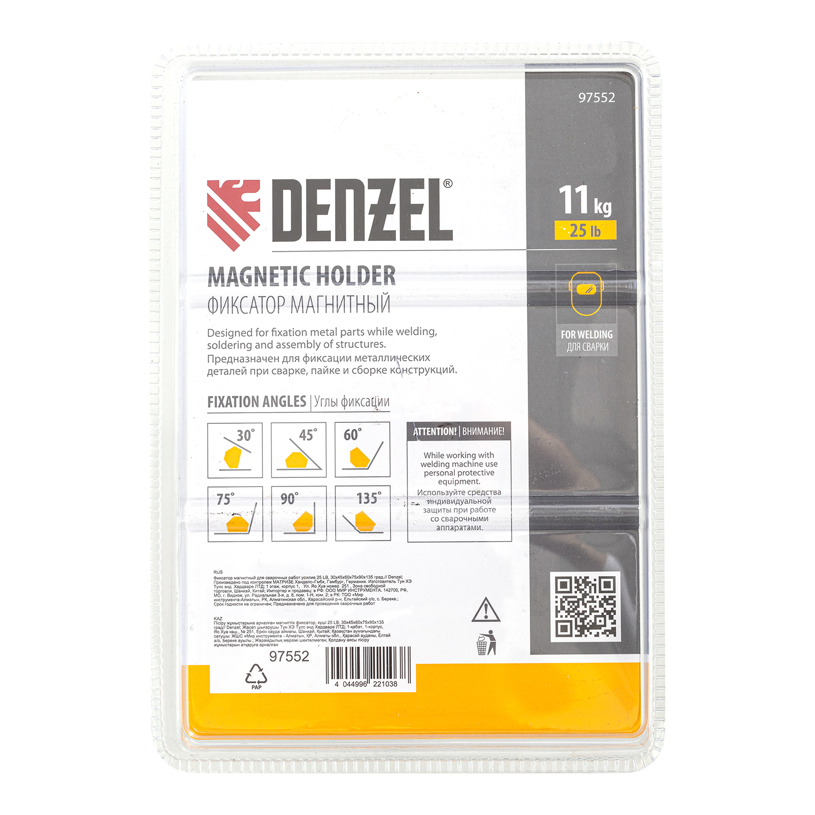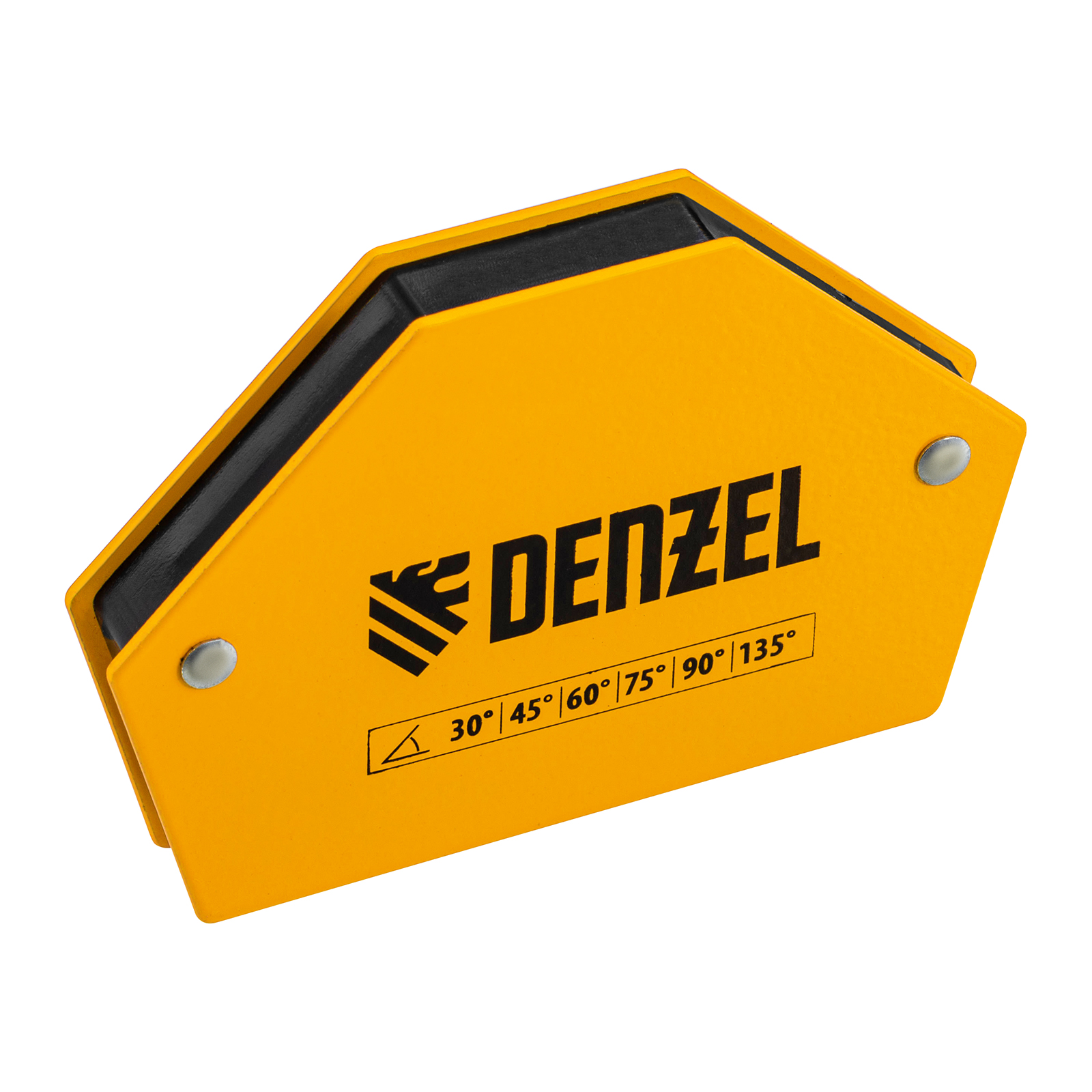 Фиксатор магнитный Denzel 97552 выдерживает усилие 25 LB (11 кг), позволяет соединять металлические детали разного размера под углом 30°, 45°, 60°, 75°, 90° и 135° и используется при проведении сварочных работ.