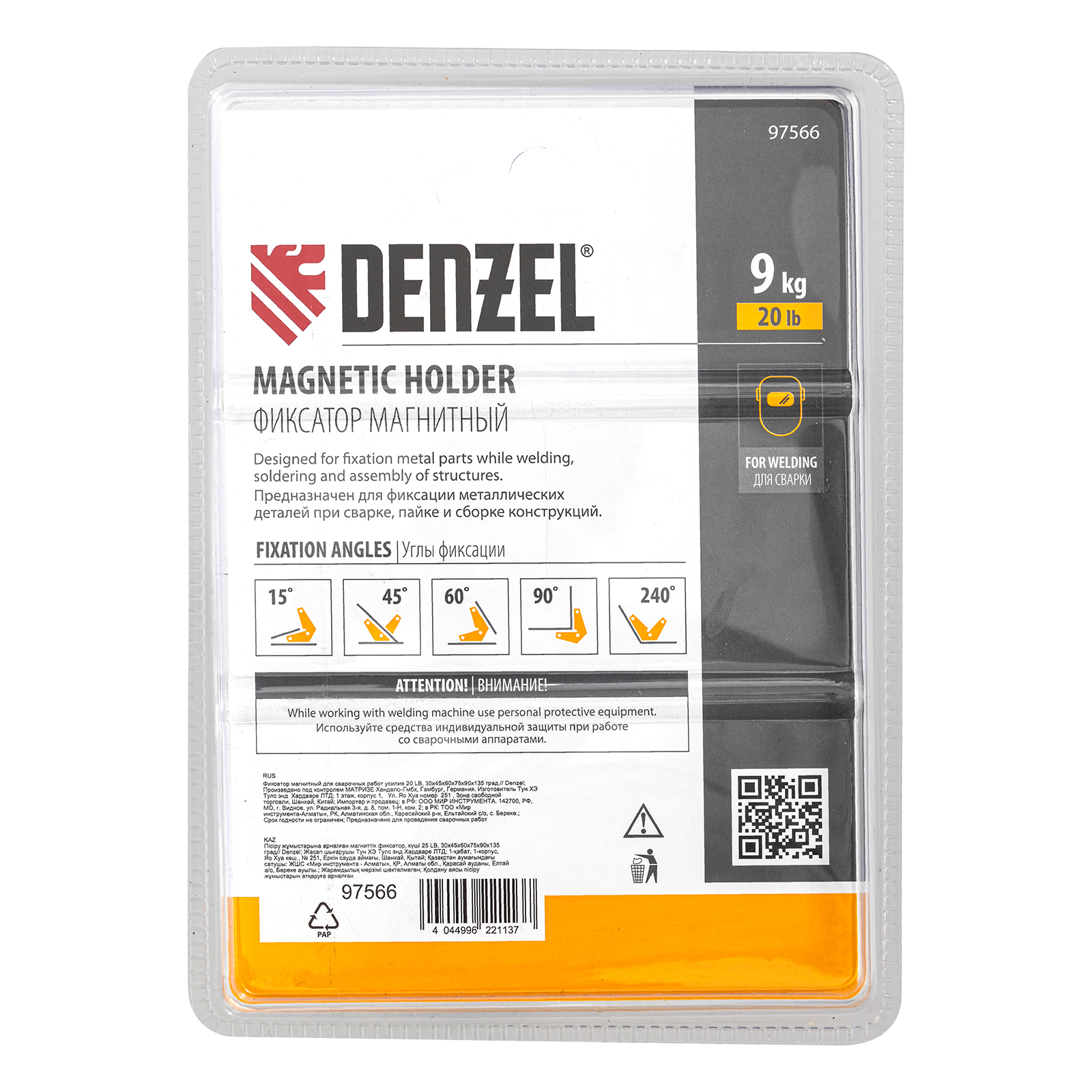 Магнитный фиксатор Denzel 97566 выдерживает усилие 25 LB (10 кг), позволяет соединять металлические детали под углом 30°, 45°, 60°, 75°, 90° и 135° и используется при проведении сварочных работ.