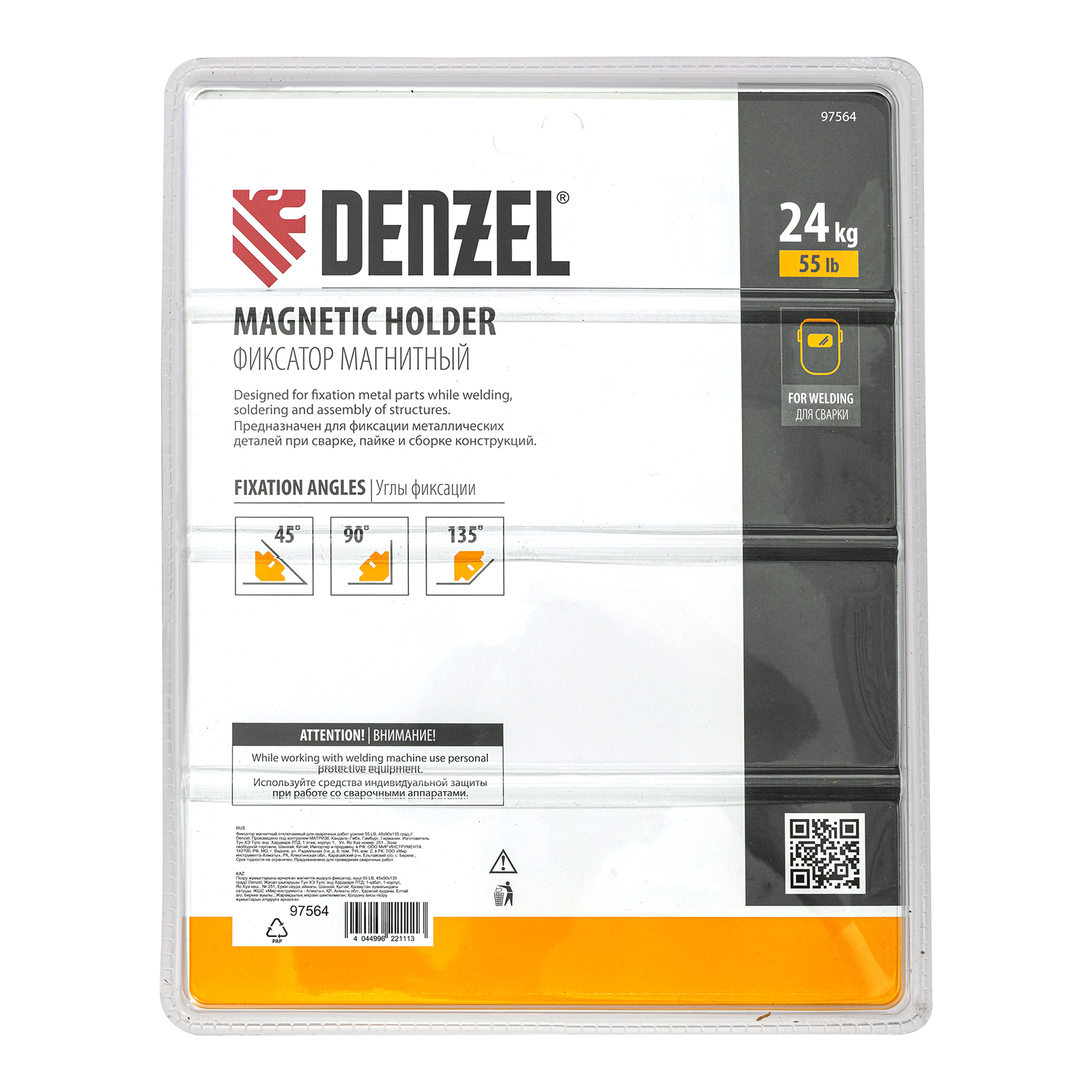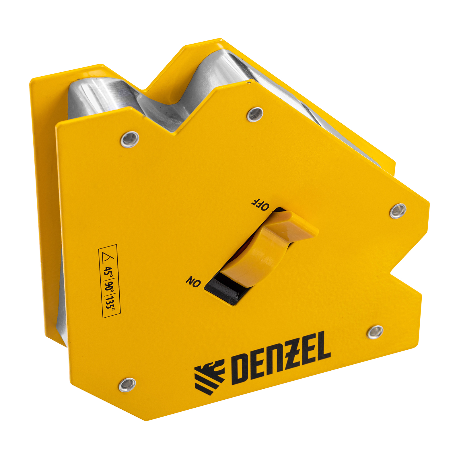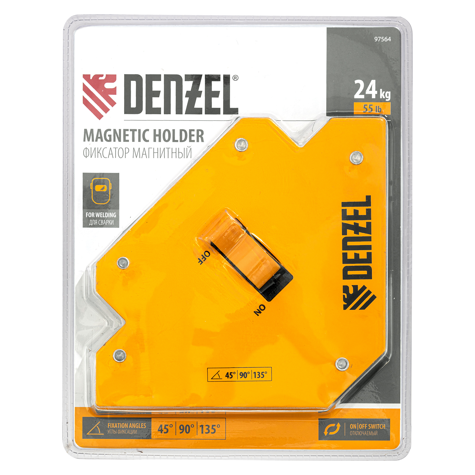 <p>Фиксатор магнитный отключаемый для сварочных работ Denzel 97564 выдерживает усилие 55 LB (25 кг) и способен удерживать металлические предметы под углом 45°, 90°, 135°. Применяется при пайке, сварке, монтаже уголков, труб, профилей и других конструкций. Магнитное поле при необходимости отключается, что упрощает установку фиксатора и его снятие.</p><h2>Преимущества</h2><ul><li>Простая эксплуатация — фиксатор надежно удерживает детали под различными углами без дополнительного использования струбцин и зажимов.</li><li>Эффективность — фиксатор подходит для проведения работ, требующих высокой точности и аккуратности.</li><li>Простой уход — сварочный налет легко счищается щеткой.</li><li>Удобная упаковка — фиксатор поставляется в двойном блистере, позволяющем осмотреть его перед покупкой.</li><li>Гарантия 3 года — высокое качество аксессуара для сварки подтверждено производителем.</li></ul>